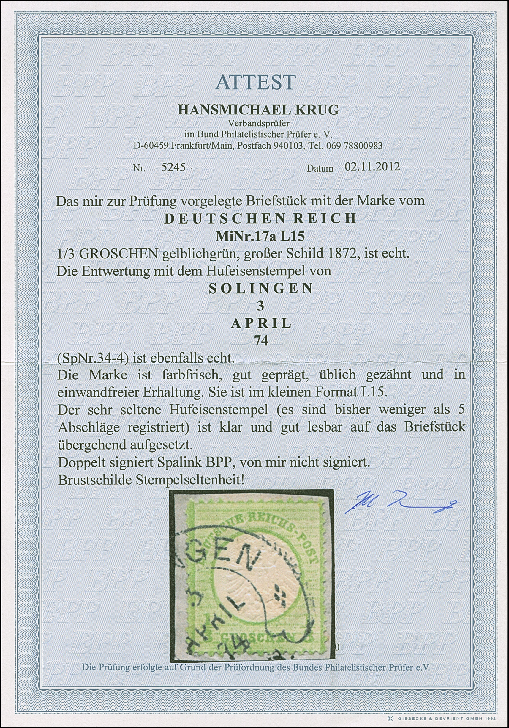“SOLINGEN 3.APRIL.74” (Spalink 34-4) auf großer Schild ⅓ Gr. gelblichgrün im kleinen Format L15 auf Briefstück. Die farbfrische Marke ist gut geprägt, üblich gezähnt und in einwandfreier Erhaltung. Ein schönes Briefstück mit diesem äußerst seltenen Hufeisenstempel, bisher sind ganz wenige Abschläge registriert, doppelt signiert Spalink und Fotoattest Krug BPP (2012)