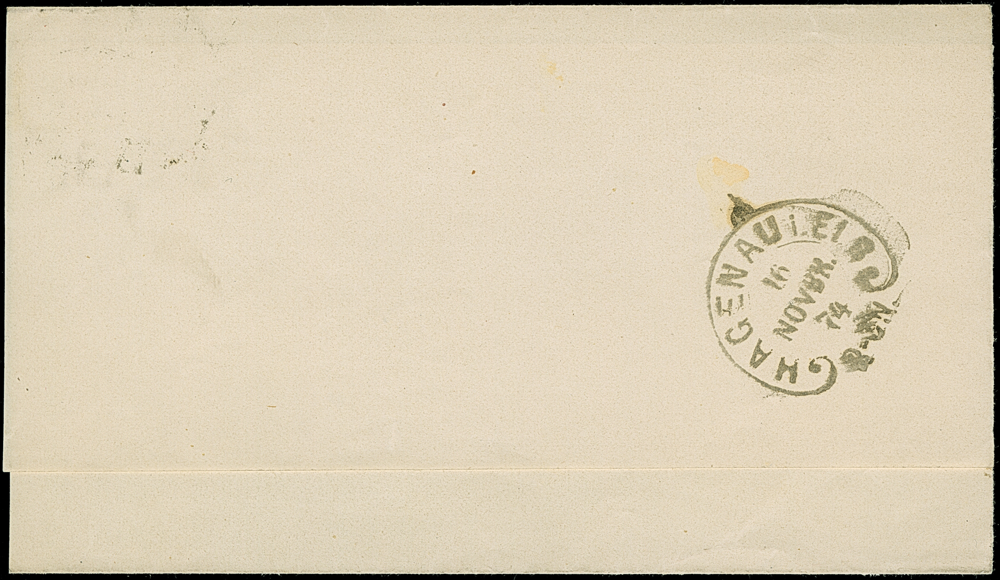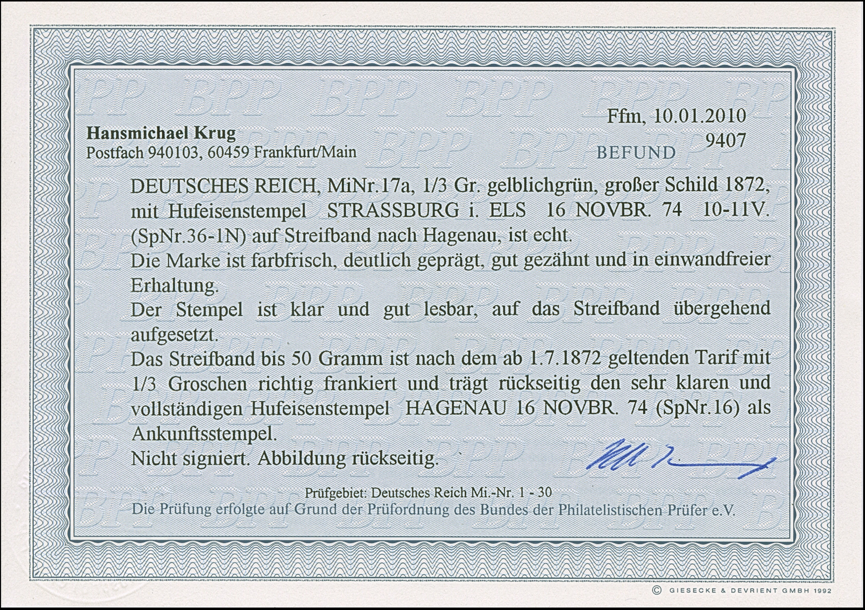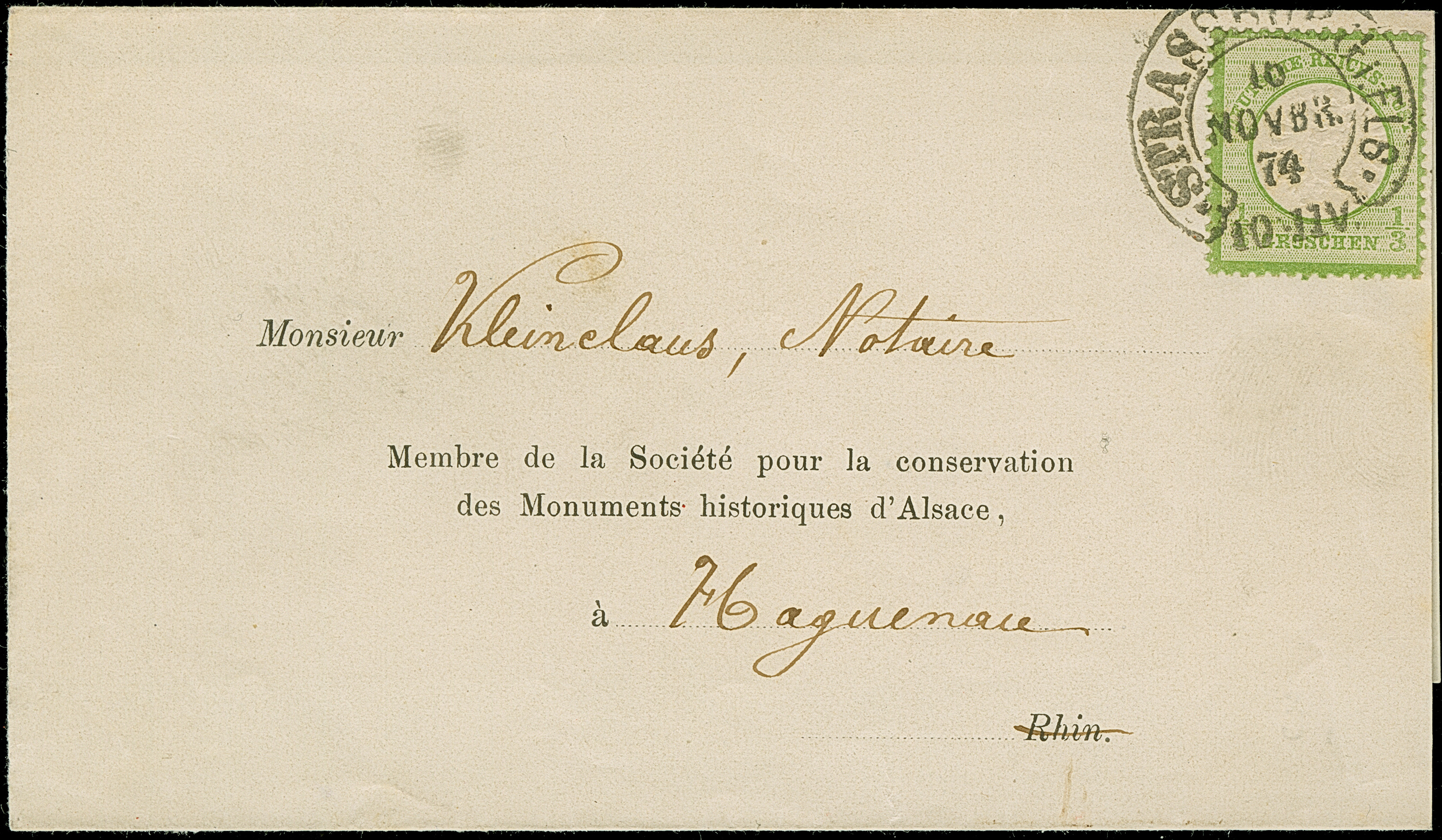 “STRASSBURG i. ELS. 16.NOVBR.74” (Spalink 17-1N) sehr klar auf großer Schild ⅓ Gr. gelblichgrün als tarifgerechte Einzelfrankatur auf Drucksachen-Streifband bis 50 g nach Hagenau mit rückseitigem Hufeisenstempel “HAGENAU 16.NOVBR.74” (Spalink 16) als Ankunftsstempel. Die farbfrische Marke ist deutlich geprägt, gut gezähnt und wie das Streifband in einwandfreier Erhaltung. Eine dekorative Verwendung mit sogenannten “Doppelspänner”, Fotobefund Krug BPP (2010)