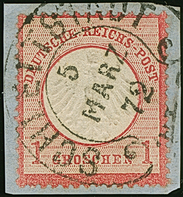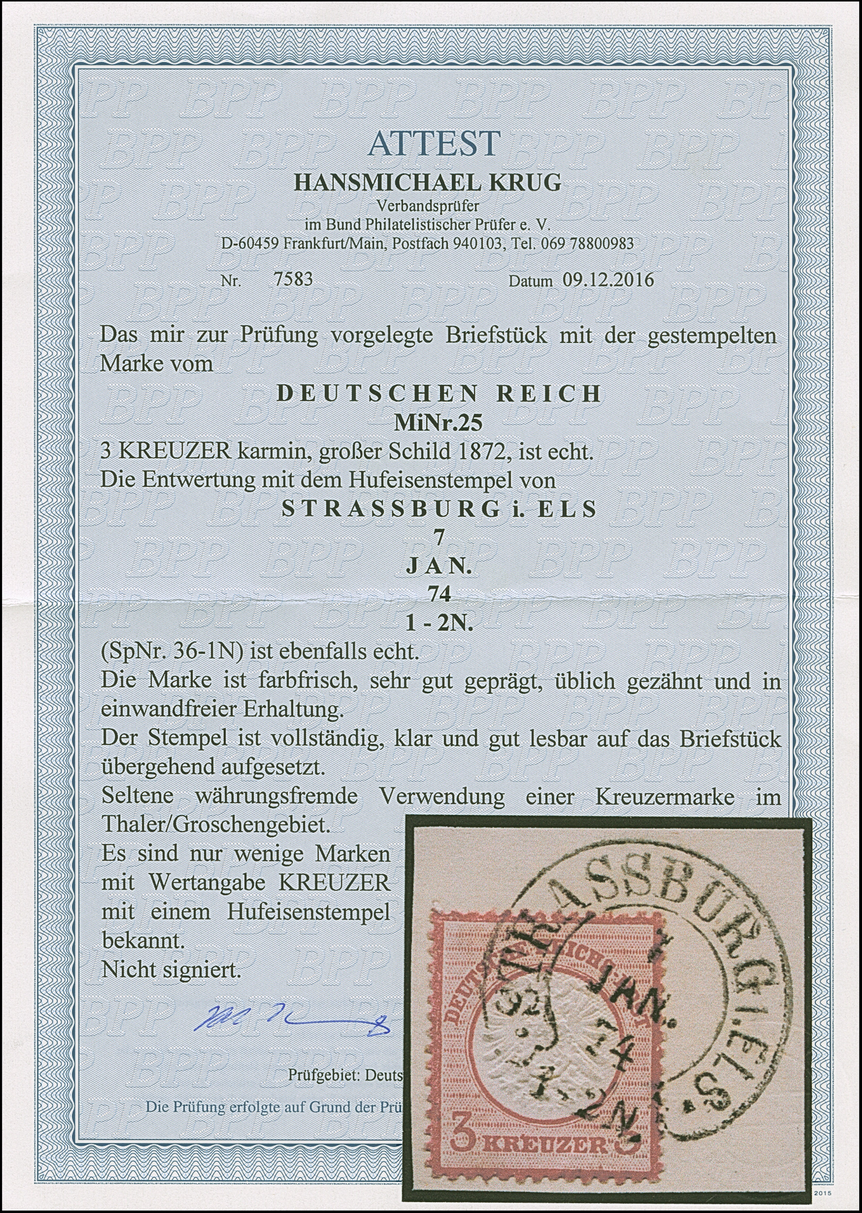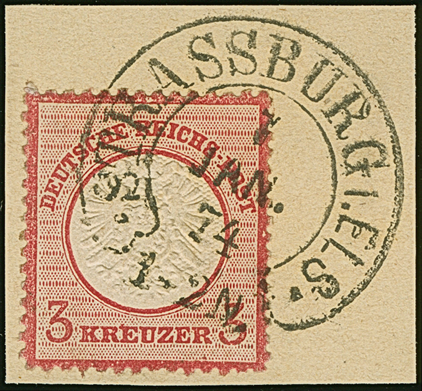 “STRASSBURG i. ELS. 7.JAN.74” (Spalink 36-1N) sehr klar auf großer Schild 3 Kr. karmin auf Briefstück, die farbfrische Marke ist sehr gut geprägt, üblich gezähnt und in einwandfreier Erhaltung. Eine sehr seltene währungsfremde Verwendung einer Kreuzermarke mit Hufeisenstempel im Groschengebiet, in dieser Kombination sind nur wenige Marken bekannt, Fotoattest Krug BPP (2016)
