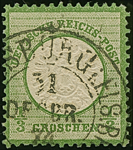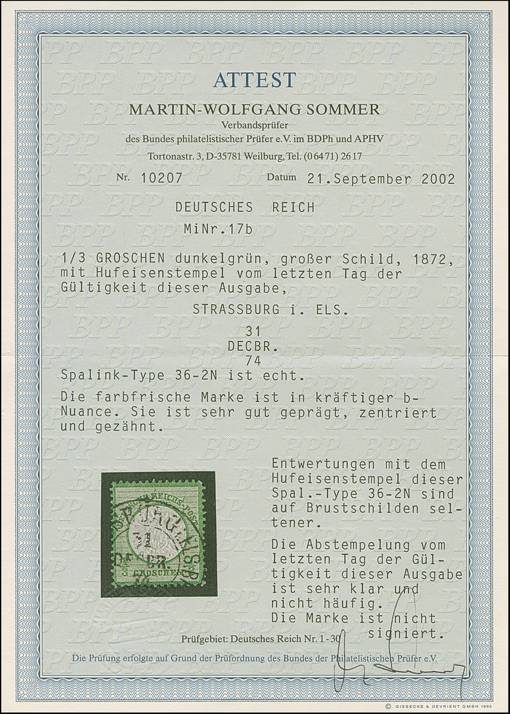 “STRASSBURG i. ELS. BHF 31.DECBR.74” (Spalink 36-2N) klar auf loser Marke ⅓ Gr. dunkelgrün. Die farbfrische Marke ist gut geprägt, gut gezähnt und in einwandfreier Erhaltung. Ein schönes Exemplar mit besserem Hufeisenstempel vom letzten Tag der Gültigkeit der ⅓ Gr.-Wertstufe, Fotoattest Sommer BPP (2002)