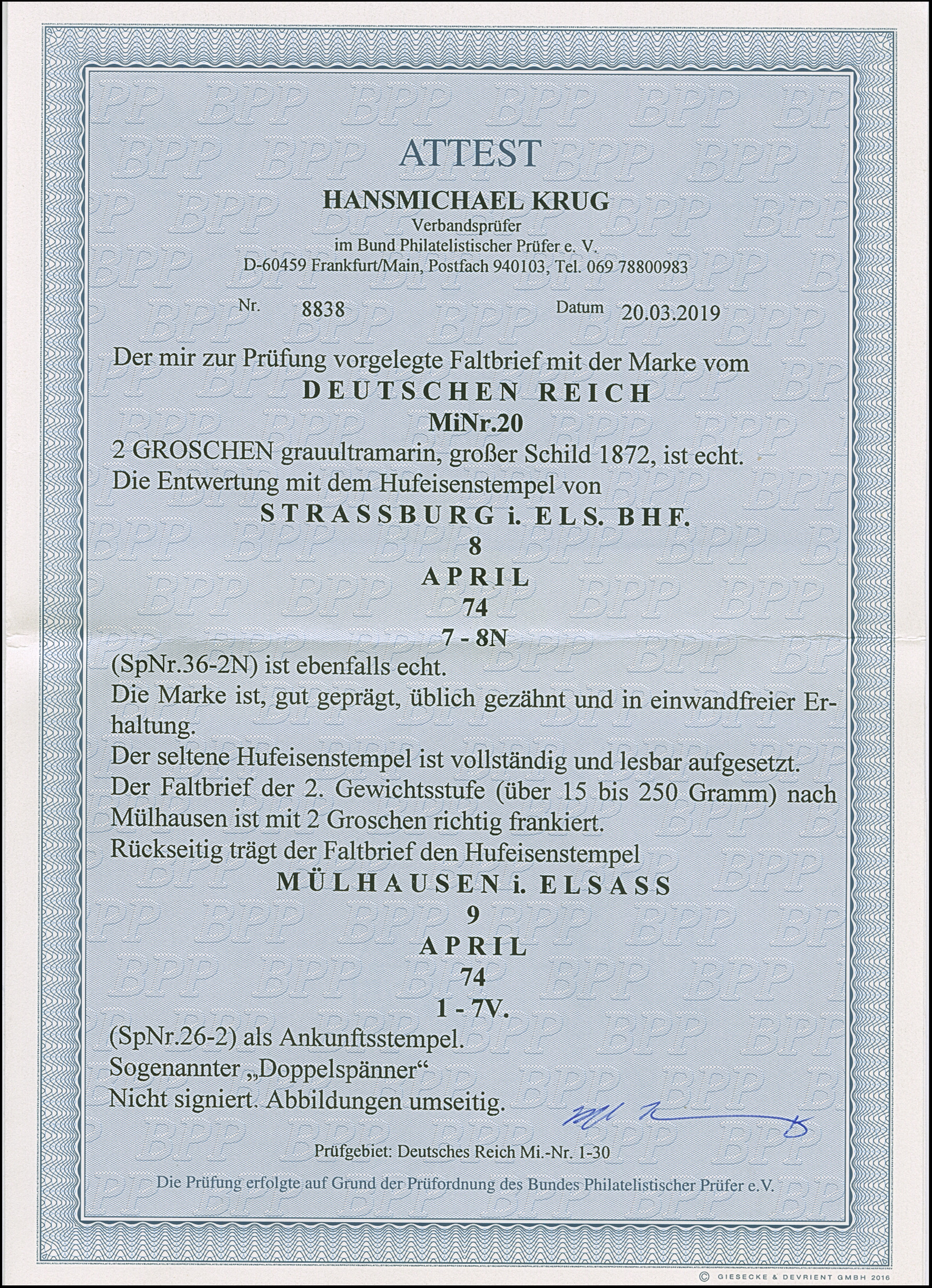 “STRASSBURG i. ELS. BHF. 8.APRIL.74” (Spalink 36-2N) klar auf großer Schild 2 Gr. grauultramarin auf komplettem Faltbrief der 2. Gewichtsstufe nach Mülhausen mit rückseitigem Ankunftsstempel “MÜHLHAUSEN i. ELSASS 9.APRIL.74” (Spalink 26-2). Die farbfrische Marke ist gut geprägt, üblich gezähnt und in einwandfreier Erhaltung.. Ein interessanter Brief mit besserem Hufeisenstempel und sogenanntem “Doppelspänner”, Fotoattest Krug BPP (2019)