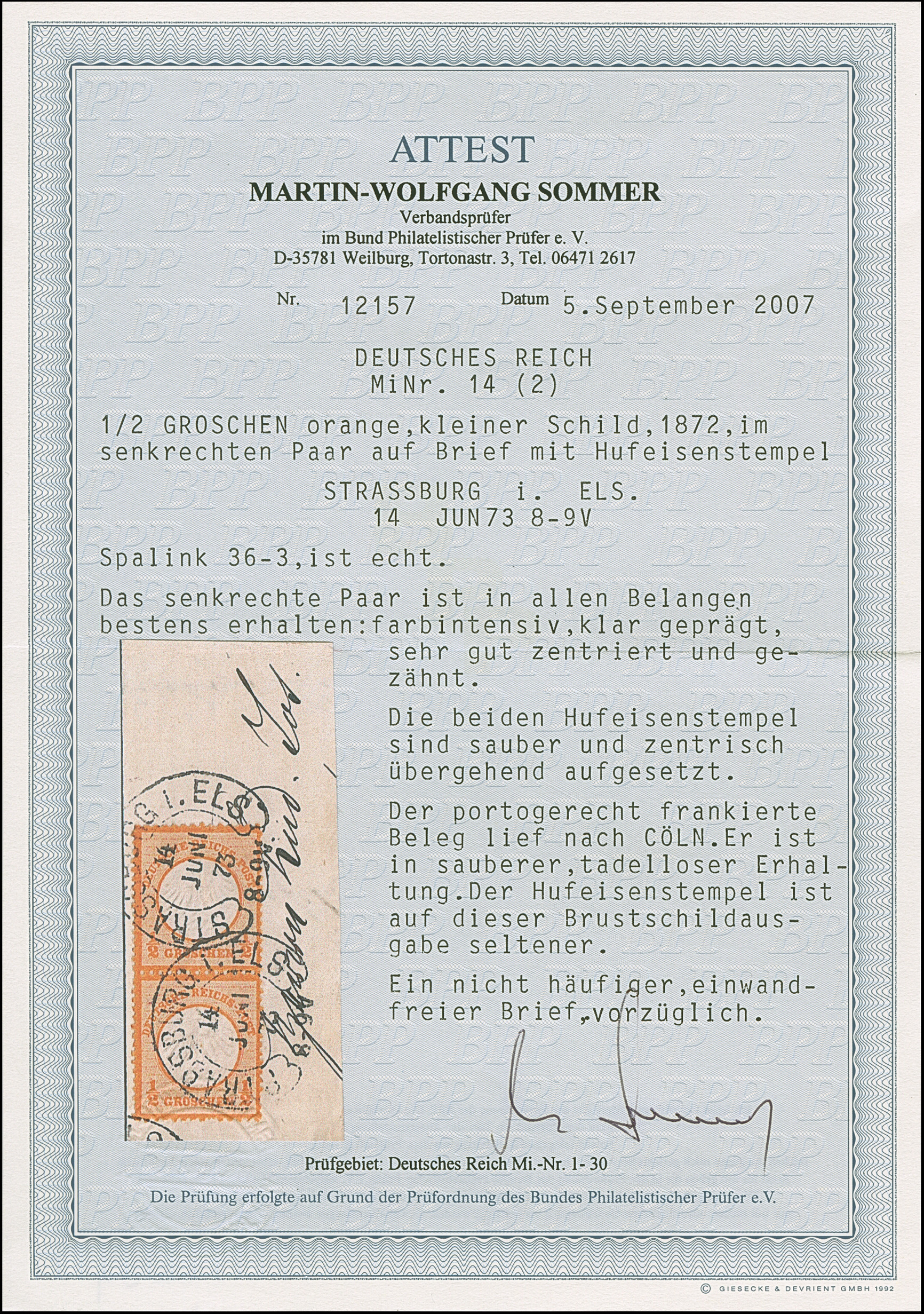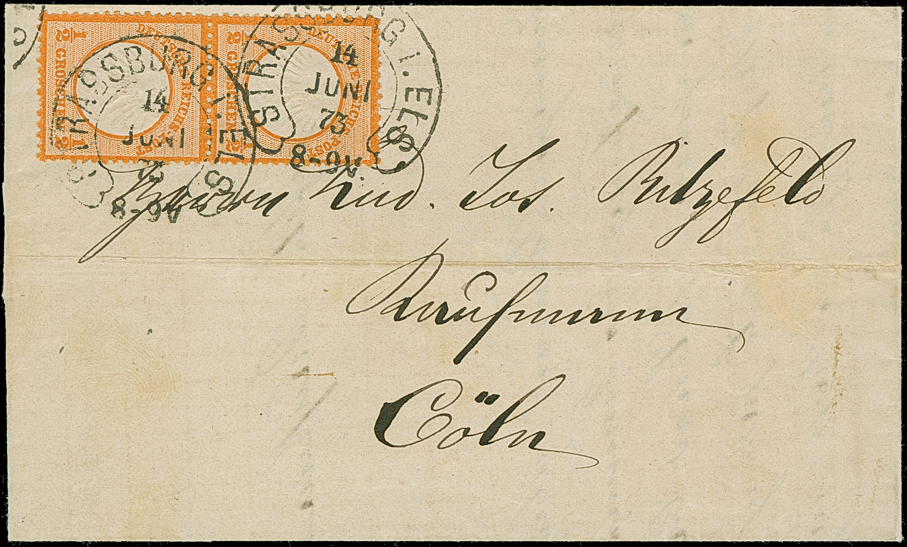 “STRASSBURG i. ELS” (Spalink 36-3) zweimal klar auf senkrechtem Paar kleiner Schild ½ Gr. orange auf komplettem Faltbrief nach Köln. Die farbfrischen Marken sind deutlich geprägt, gut gezähnt und in einwandfreier Erhaltung. Eine dekorative Mehrfachfrankatur mit besserem Hufeisenstempel, signiert Spalink BPP und Hennies BPP sowie Fotoattest Sommer BPP (2007)