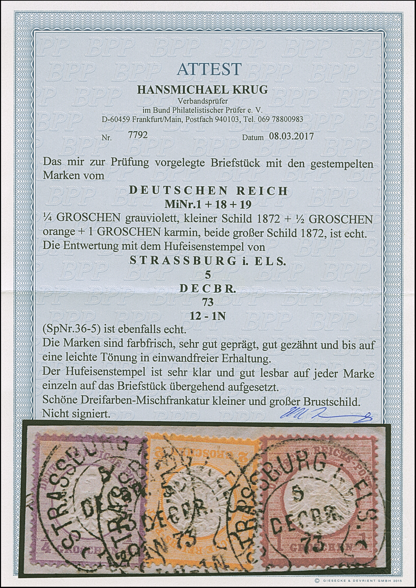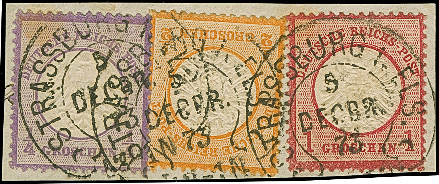 “STRASSBURG i. ELS. 5. DECBR.73” (Spalink 36-5) dreimal klar auf kleiner Schild ½ Gr. grauviolett sowie großer Schild ½ Gr. orange und 1 Gr. karmin auf Briefstück. Die farbfrischen Marken sind sehr gut geprägt, gut gezähnt und bis auf eine leichte Tönung bei der linken Marke in einwandfreier Erhaltung. Eine dekorative Dreifarben-Mischfrankatur, Fotoattest Krug BPP (2017)