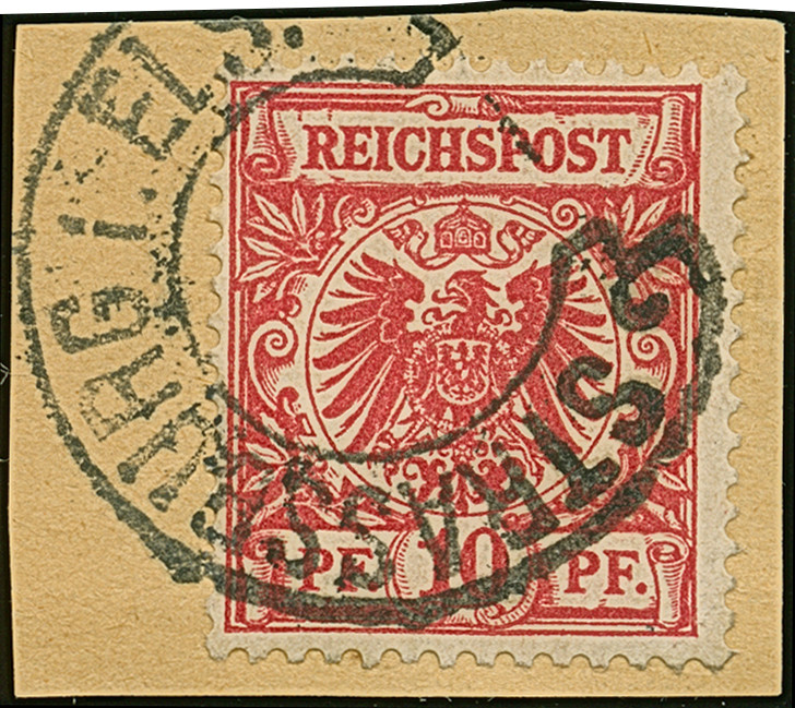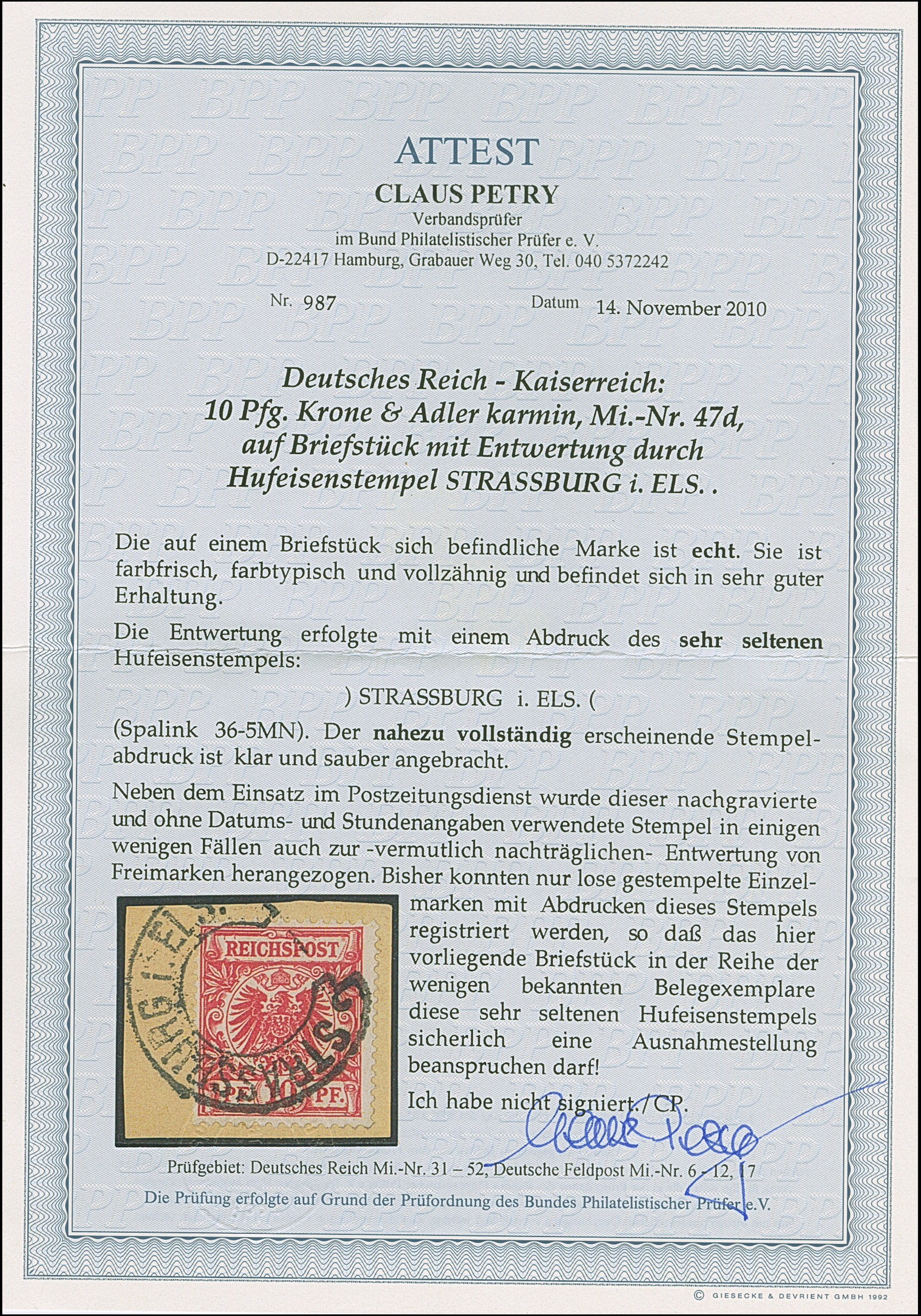 “STRASSBURG i. ELS. ”(Spalink 36-5MN) ohne Datum und Jahr sehr klar auf Krone/Adler 10 Pfg. karmin auf Briefstück in einwandfreier Erhaltung. Eine sehr seltene Innendienstverwendung, sonst nur auf Zeitungen vorkommend. Bisher sind nur ganz wenige Briefstücke mit Marken bekannt und ist mit praktisch komplettem Stempelabdruck eine große Hufeisenstempel-Seltenheit, Fotoattest Petry BPP (2010)