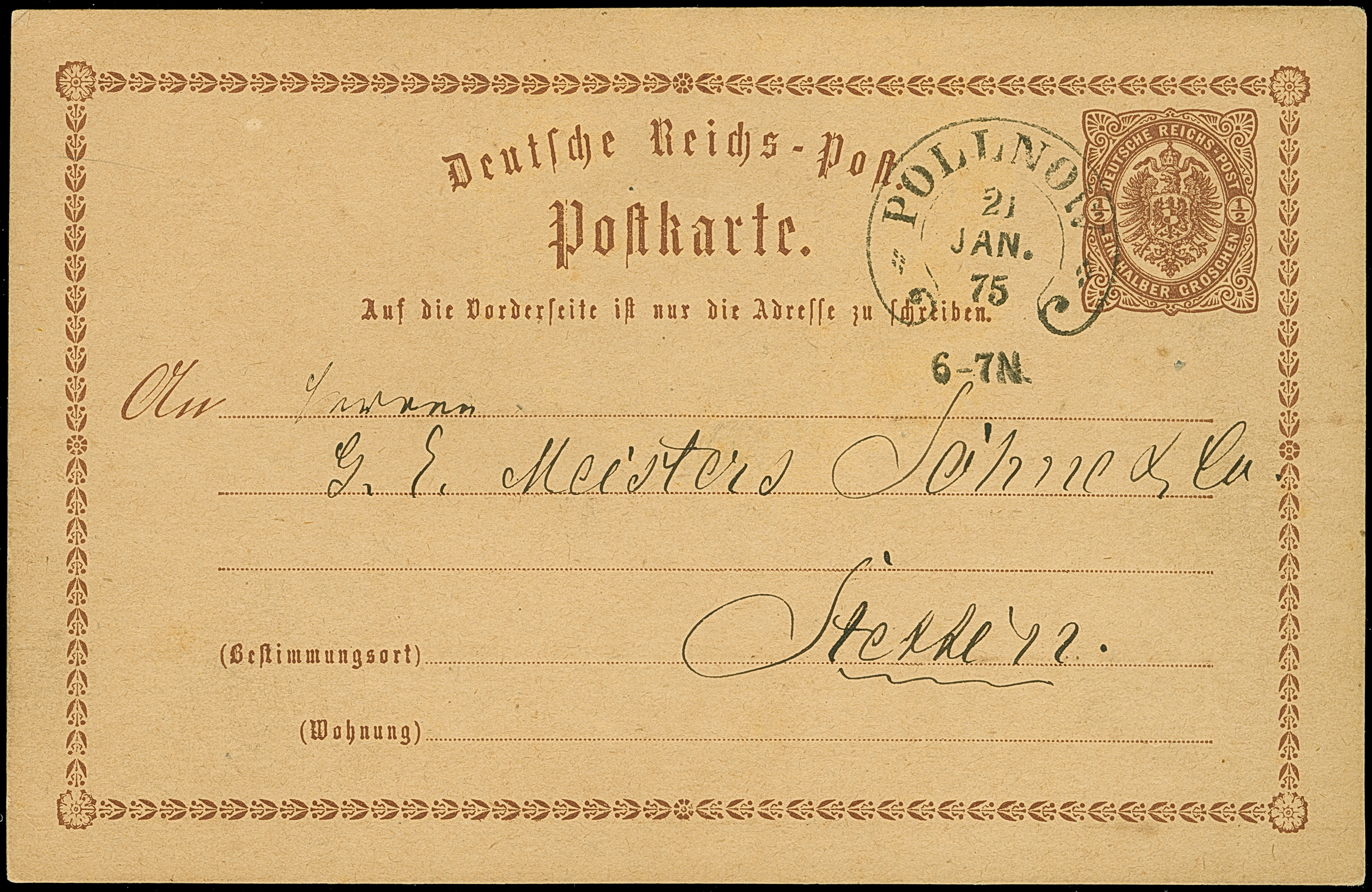 “POLLNOW 21.JAN.75” (Spalnik 31) sehr klar mit nach unten versetzter Uhrzeitengruppe auf Ganzsachenkarte ½ Gr. nach Stettin in einwandfreier Erhaltung. Eine schöne Karte mit dem seltenen Hufeisenstempel und Spätdatum vom 21.1.1875, Fotobefund Krug BPP (2013)