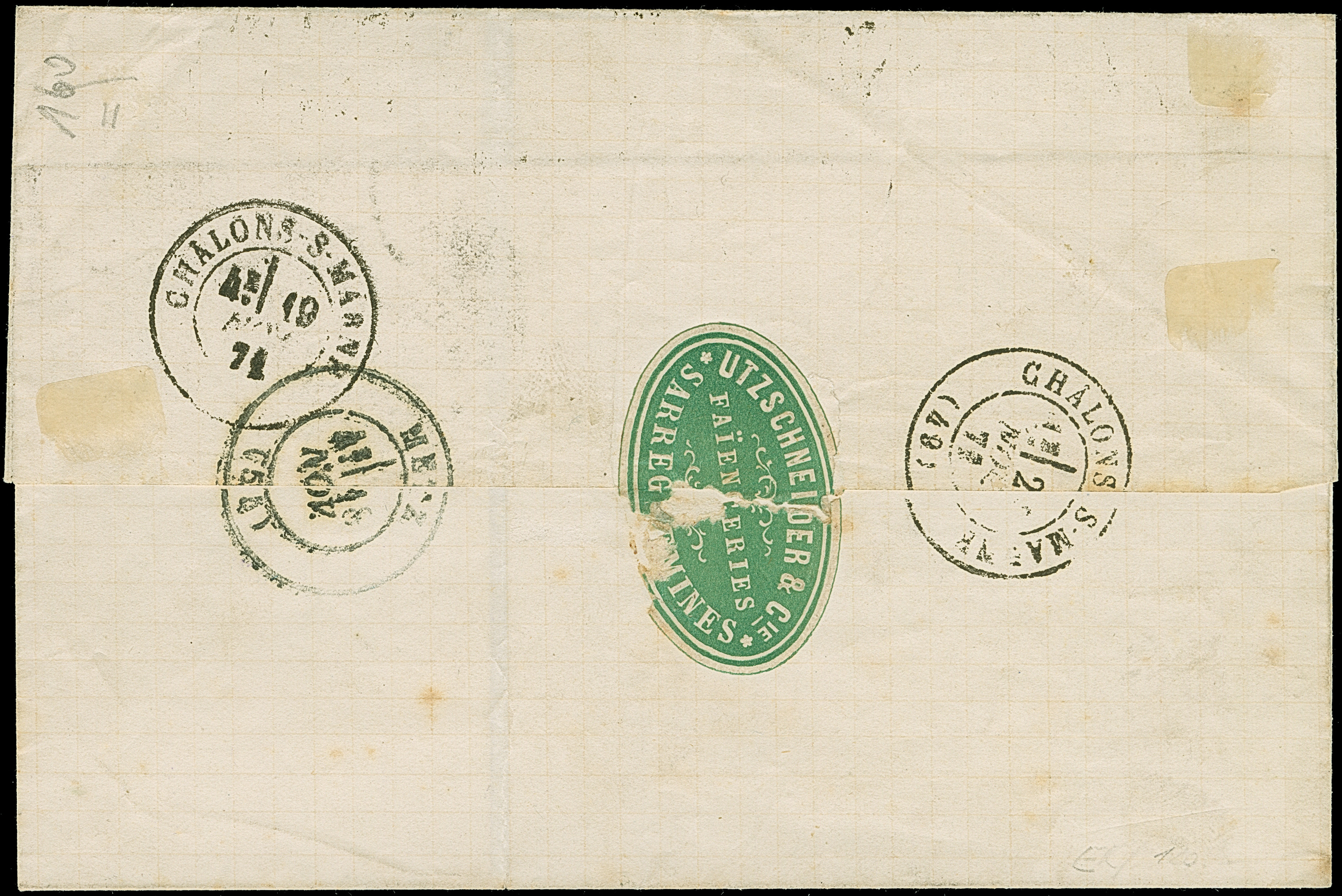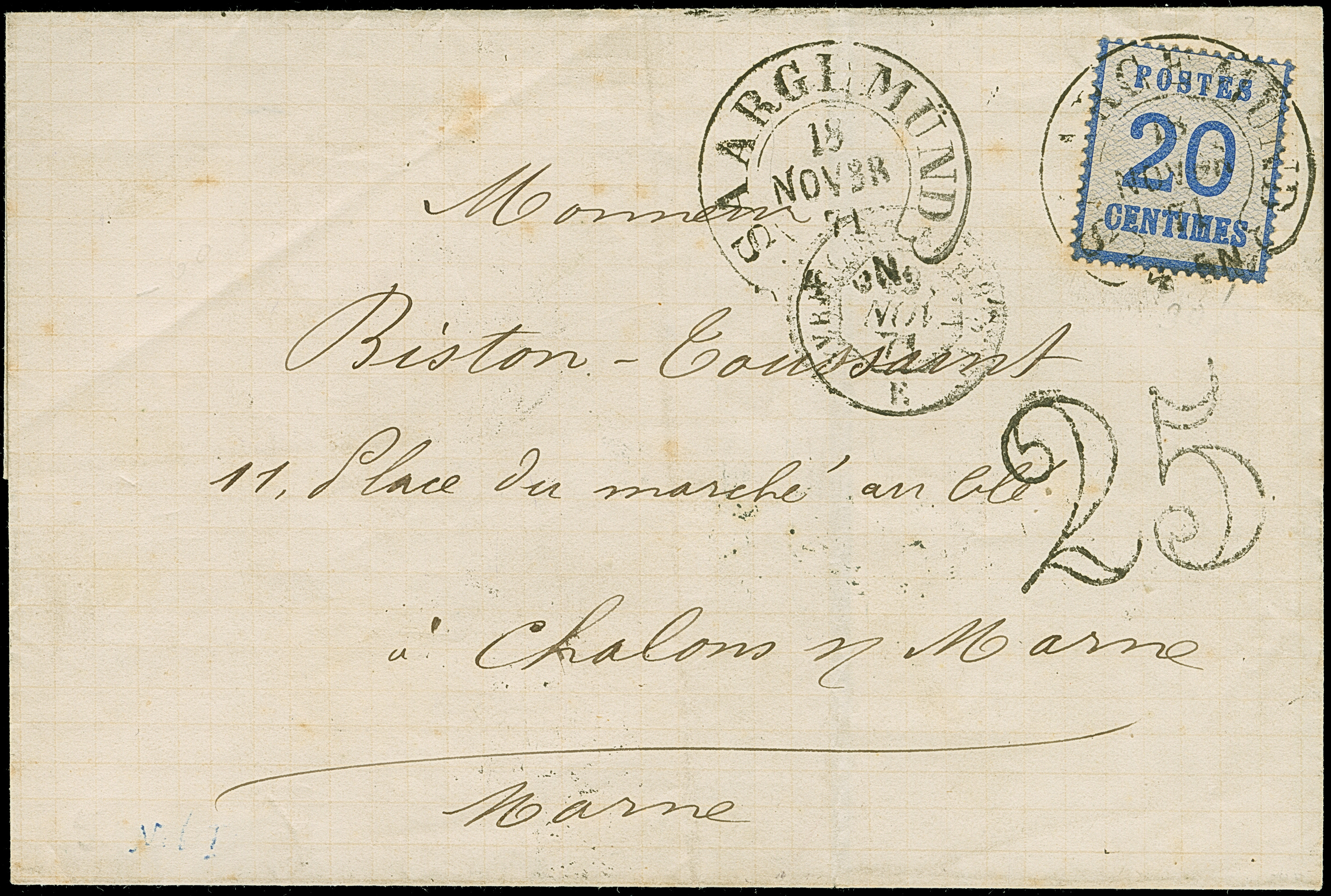 “SAARGEMÜND 18.NOVBR.71 (Spalink 32) klar auf Elsass-Lothringen 20 C. mit Netzwerk Spitzen nach oben auf Faltbriefhülle mit französischem Tax-Stempel ”25" (Centimes) nach Chalons S-Marne mit Ankunftsstempel. Die farbfrische Marke ist gut gezähnt und in einwandfreier Erhaltung, die Briefhülle hat Faltspuren. Eine dekorative Doppelfrankatur