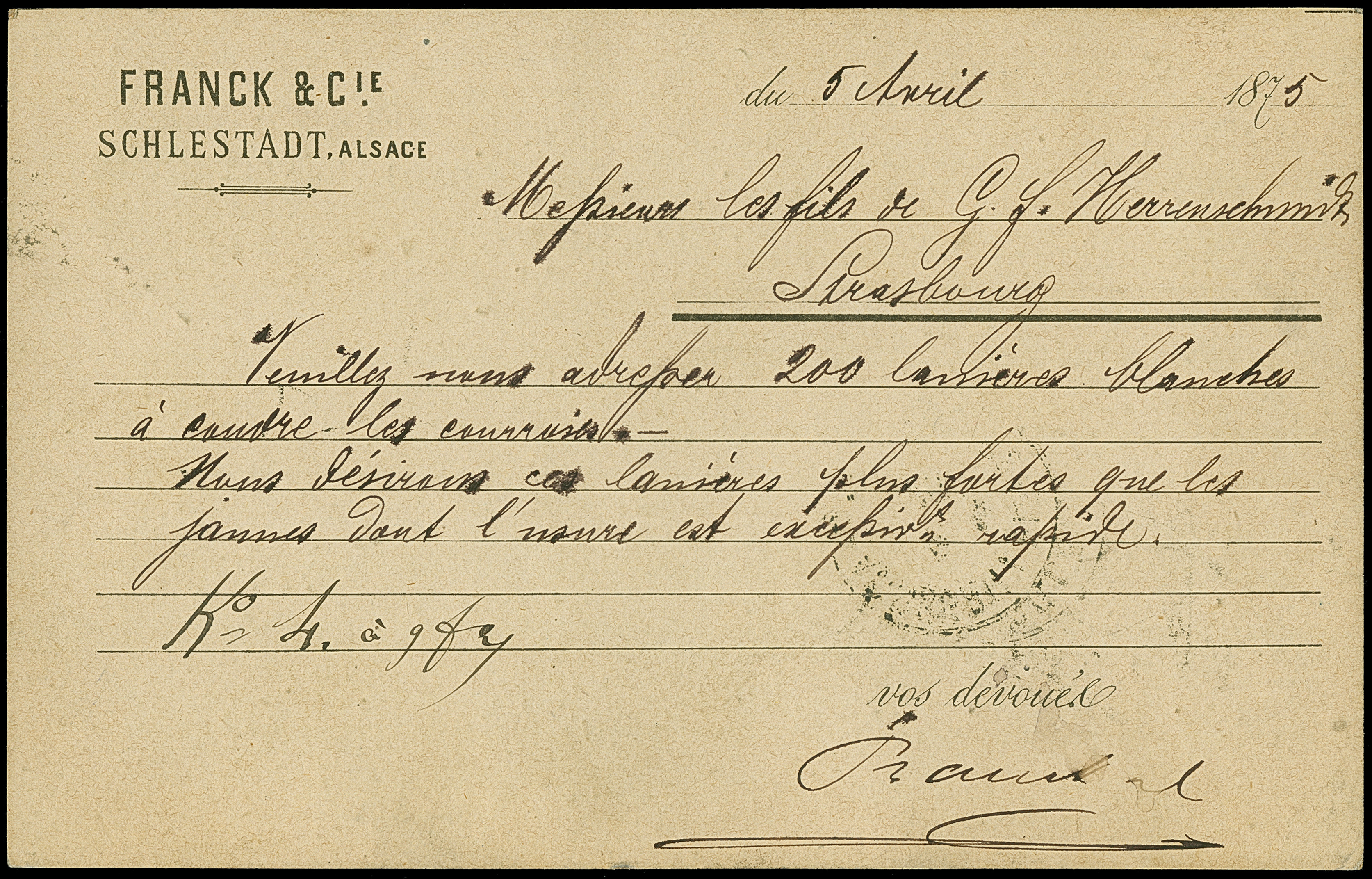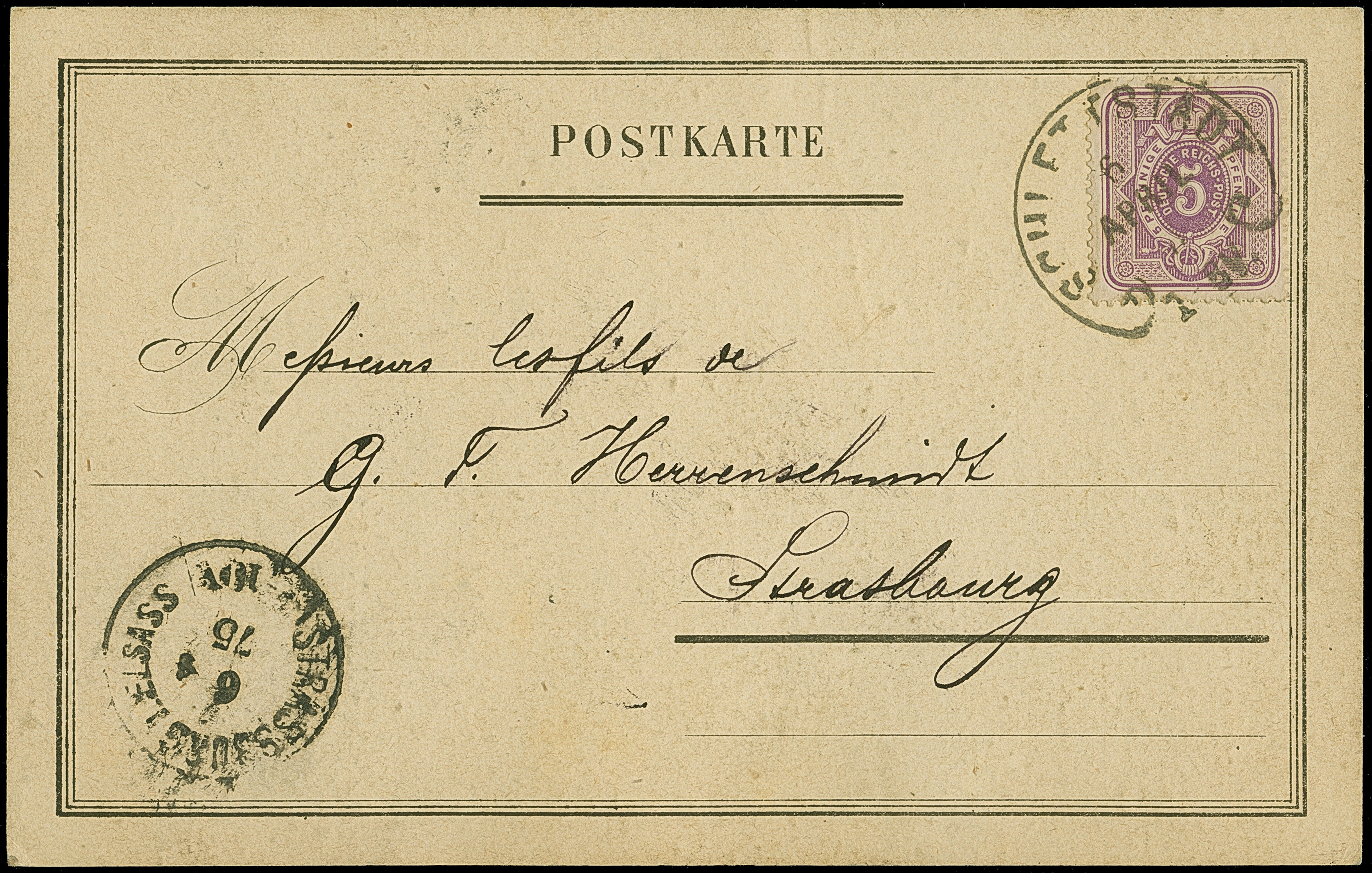 “SCHLETTSTADT 6.APRIL75” (Spalink 33) klar auf 5 Pfge violett auf privat gedruckter Firmenpostkarte nach Straßburg mit vorderseitigem Ankunftsstempel. Die farbfrische Marke ist gut gezähnt und wie die Postkarte in einwandfreier Erhaltung. Eine dekorative Verwendung aus 1875