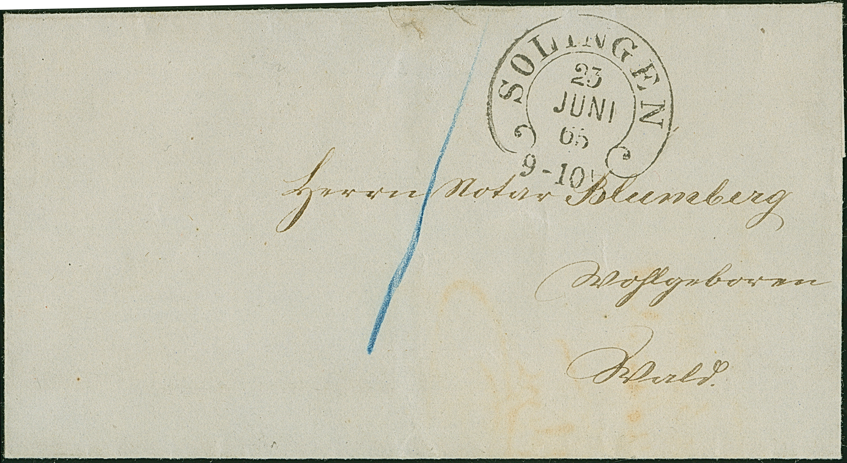 “SOLINGEN 23.JUNI.65” (Spalink 34-2) sehr klar auf bar frankierter Faltbriefhülle mit blauem Tax-Vermerk “1” (Sgr.) nach Wald in einwandfreier Erhaltung. Ein interessanter “Mini”-Brief mit Frühdatum 23.6.1865 nach Handbuch, signiert Spalink BPP