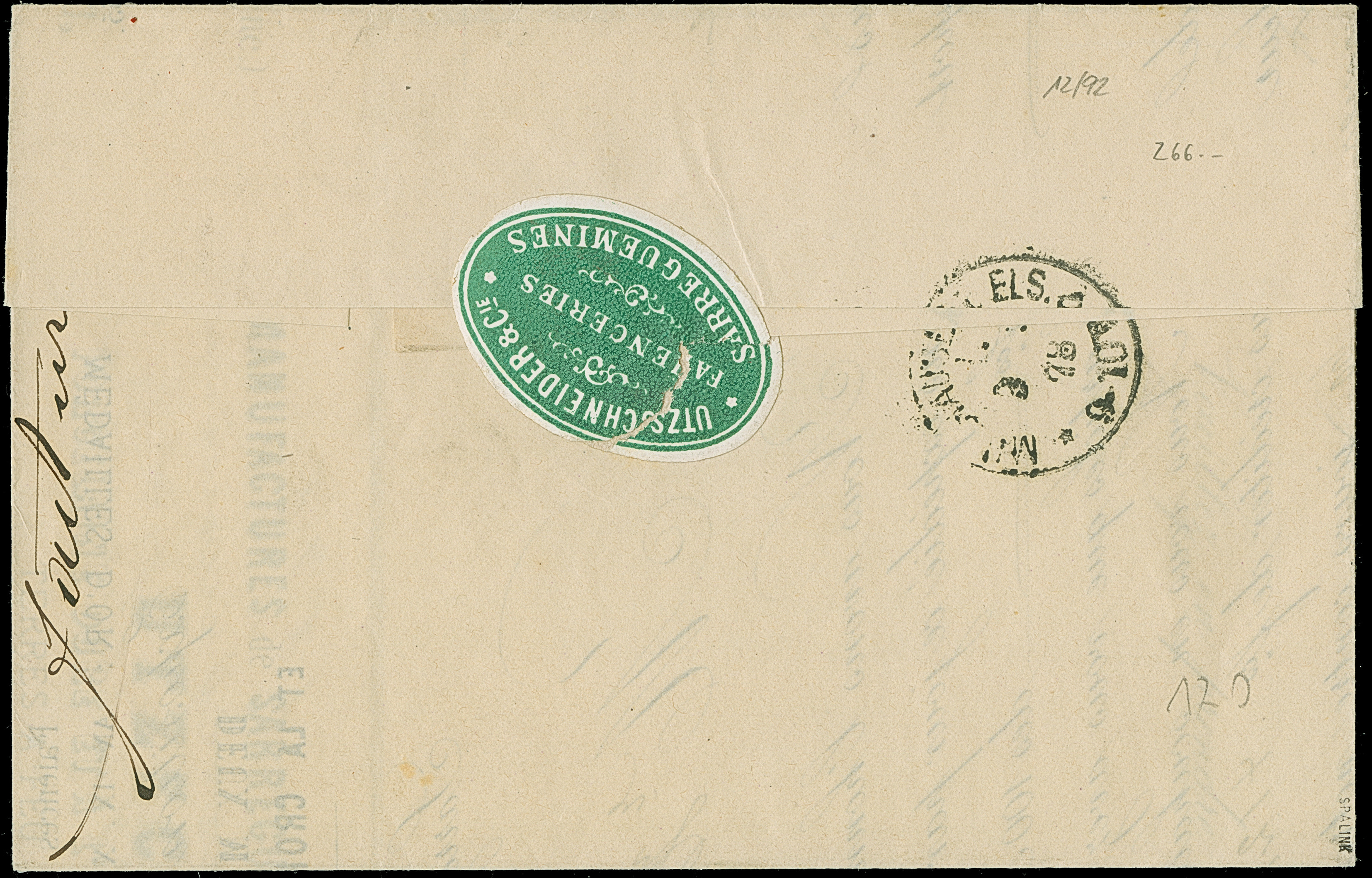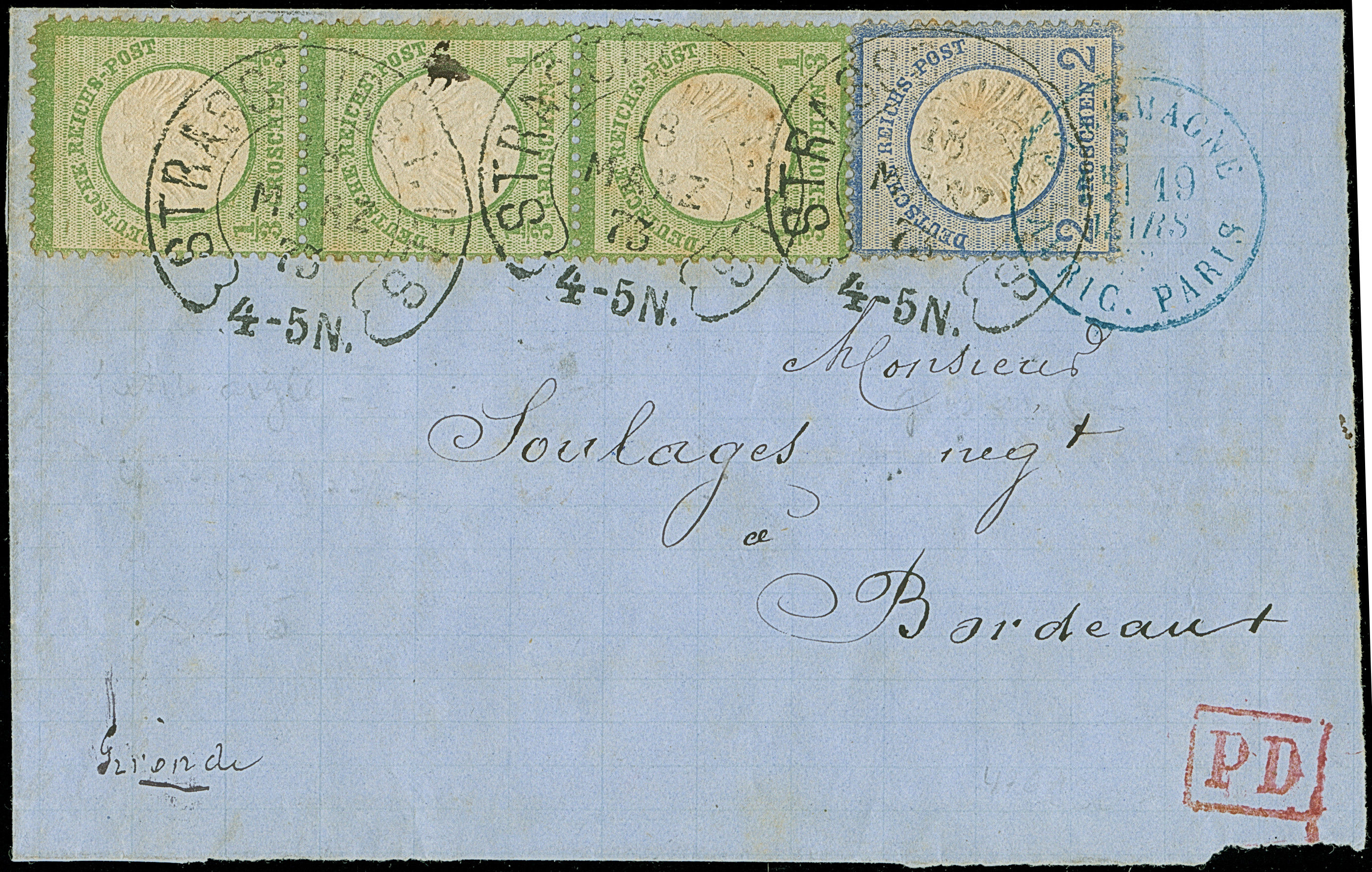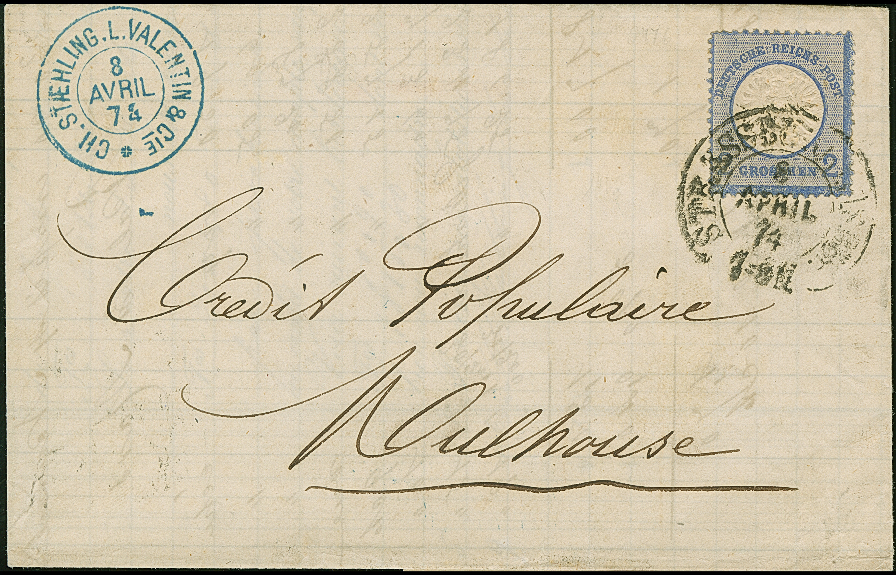 “STRASSBURG i. ELS. BHF. 22.APRIL.74” (Spalink 36-2N) mehrfach recht klar auf zwei Einzelmarken 2 Gr. grauultramarin, die untere Marke mit Plattenfehler “linke Wertziffer 2 gebrochen und Farbpunkt unter C in REICHS” (Feld 20) und 5 Gr. ockerbraun als tarifgerechte Frankatur auf Faltbriefhülle der 3. Gewichtsstufen mit rotem Ra1 “PD” und frz. Transitstempel nach Paris. Die farbfrischen Marken sind gut geprägt und bis auf einen kürzeren Zahn bei der unteren Marke gut gezähnt und in einwandfreier Erhaltung. Eine dekorative Frankatur mit besserem Plattenfehler und besserem Hufeisenstempel mit Destination Frankreich, Fotoattest Krug BPP (2013)
