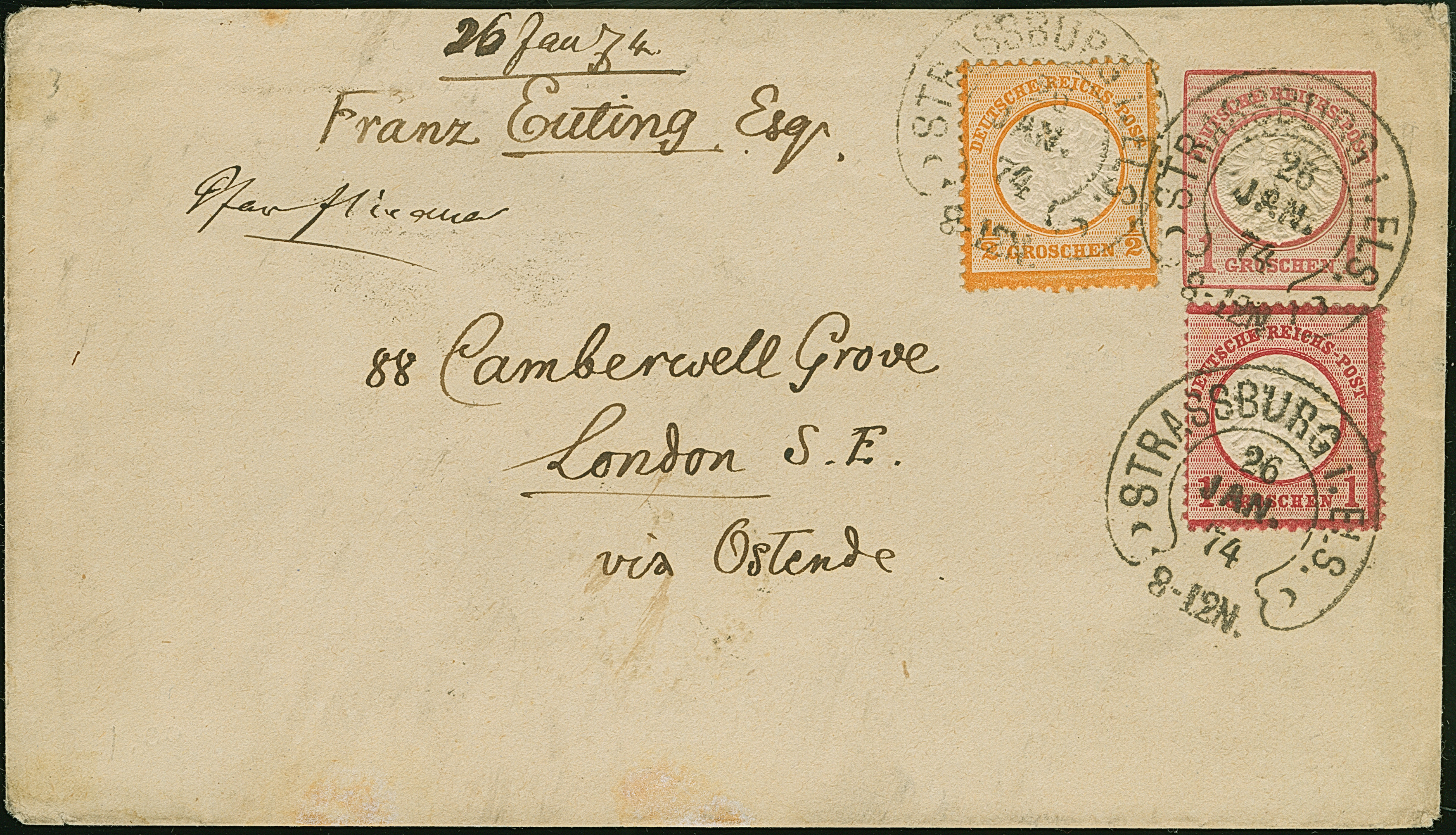 “STRASSBURG i. ELS. 26.JAN.74” (Spalink 36-5) mehrfach klar auf Ganzsachenumschlag großer Schild 1 Gr. mit tarifgerechter Zufrankatur ½ Gr. orange und 1 Gr. karmin nach London mit Ankunftsstempel. Die beiden farbfrischen Marken sind sehr gut geprägt und bis auf zwei kürzere Zähne bei der ½ Gr.-Marke üblich gezähnt und wie der Umschlag in einwandfreier Erhaltung, Fotobefund Krug BPP(2017)