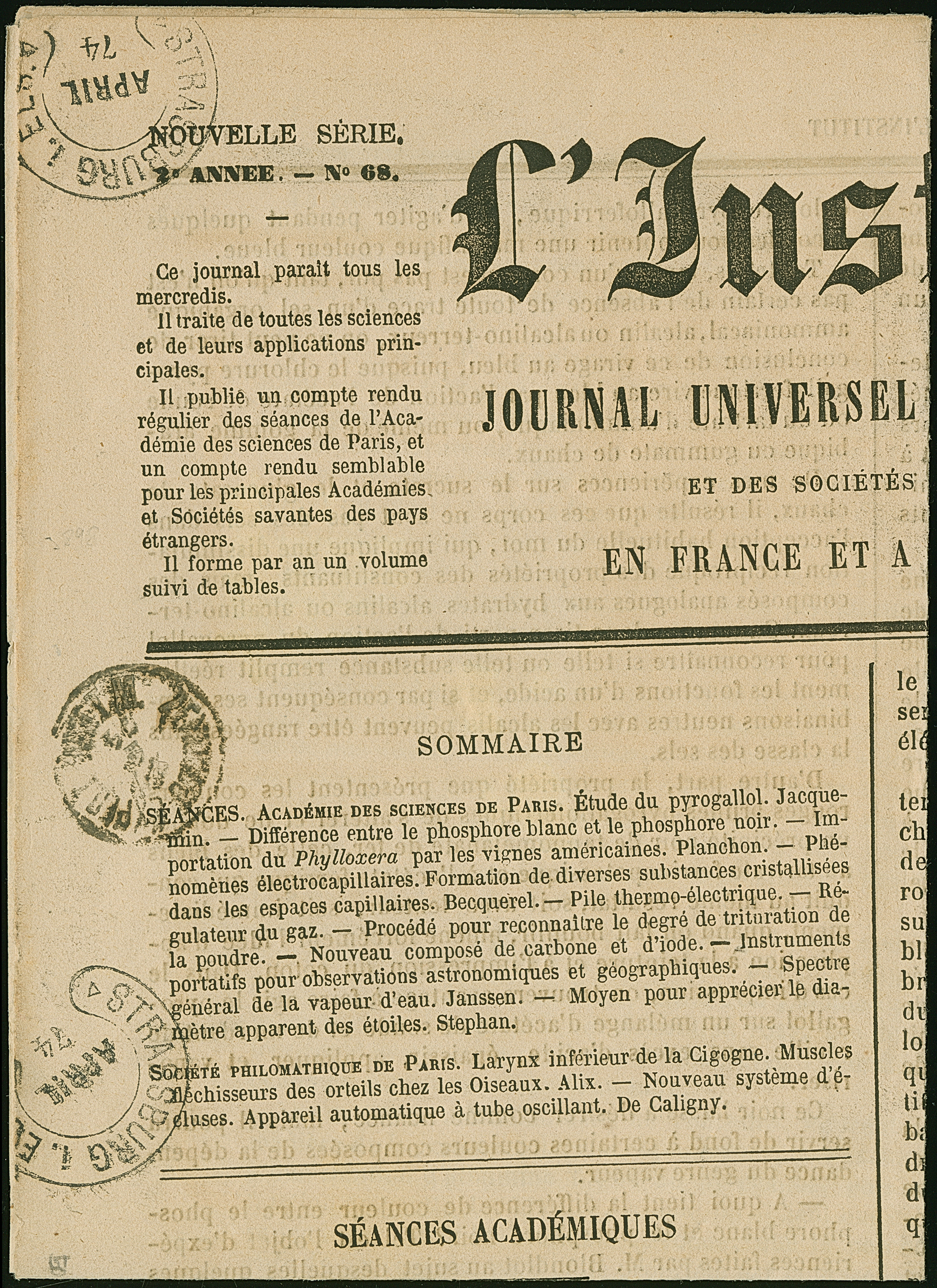 “STRASSBURG I. ELS. APRIL 74” (Spalink 36-6) ohne Tagesdatum zweimal klar auf der 1. Seite der Zeitung “L'Institut” vom 22.4.1874" mit weiterem, undeutlichen Stempel, in guter Erhaltung. Eine außergewöhnliche Verwendung dieses Reservestempels und in dieser Art im Handbuch nicht gelistet