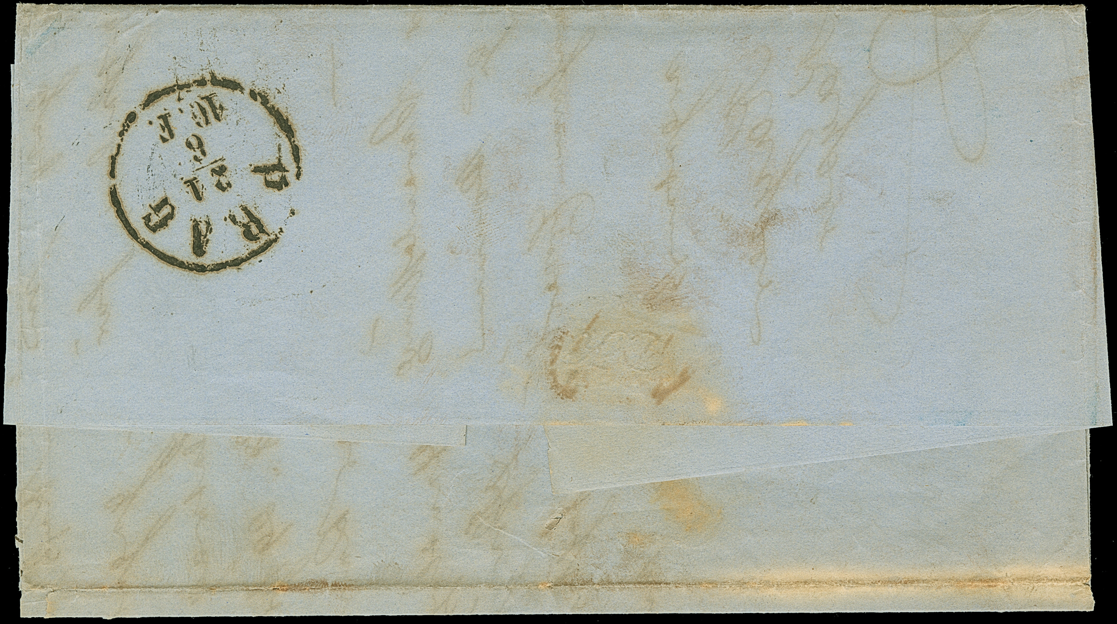 “STRASSBURG i. ELS 18.MARZ.74” (Spalink 36-3) mehrfach recht klar auf senkrechtem Dreierstreifen kleiner Schild ⅓ Gr. gelblichgrün und großer Schild 2 Gr. grauultramarin als tarifgerechte Frankatur auf innen nicht ganz kompletter Faltbriefhülle mit rotviolettem Ra1 “PD” und frz. Transitstempel (zum Teil auf rechter Marke übergehend) nach Bordeaux. Die Marken sind gut geprägt, üblich gezähnt und sind bis auf zum Teil etwas stärkere Patina in einwandfreier Erhaltung. Eine dekorative Mischfrankatur mit auf kleiner Schild besserem Hufeisenstempel und seltener Marken-Kombination, Fotoattest Krug BPP (2012)