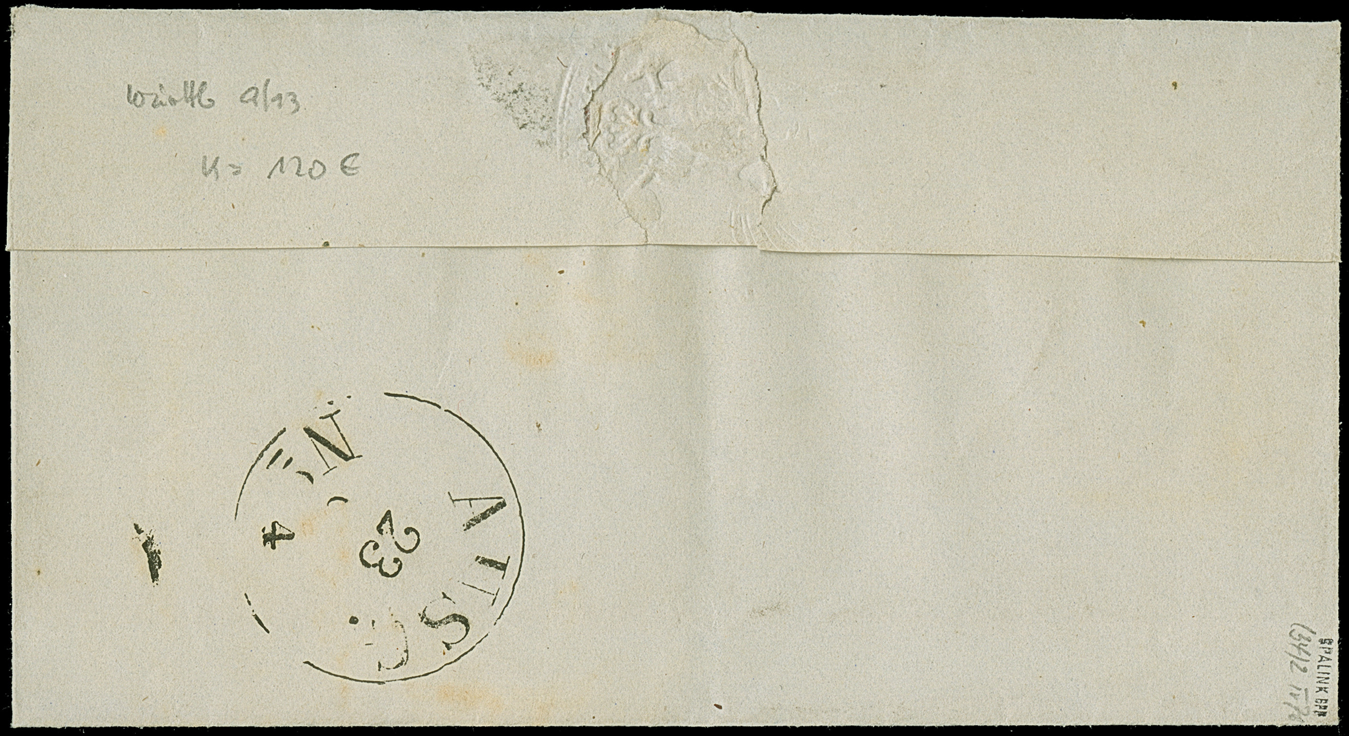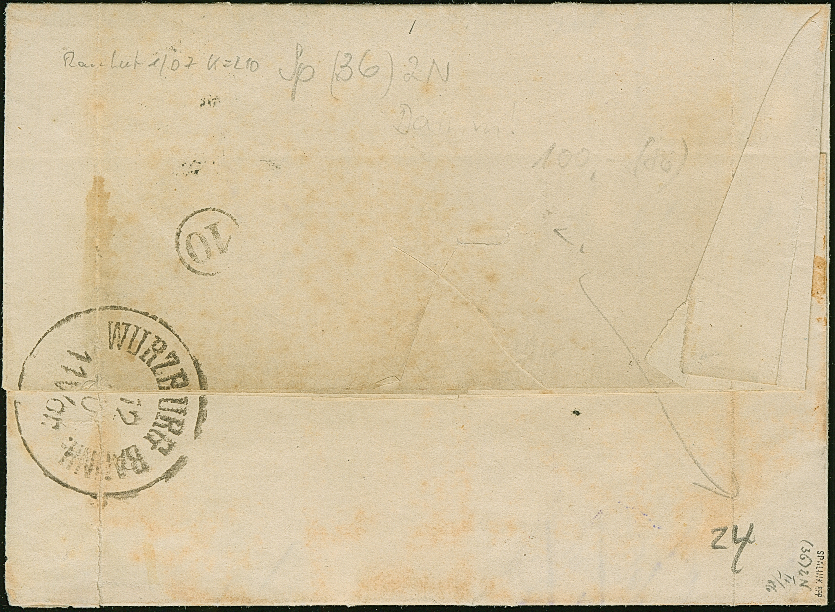 “STRASSBURG i. ELS. BHF. 11.OCTBR.75” (Spalink 36-2N) klar auf 10 Pfge. dunkelkarmin auf komplettem Faltbrief nach Würzburg mit Ankunftsstempel. Die farbfrische Marke rechts mit senkrechtem Bug und ist stärker getönt, der Faltbrief unten rechts mit Einriss. Trotz der Einschränkungen ein interessanter Brief mit Frühdatum der 3. Verwendungsphase, signiert Spalink BPP