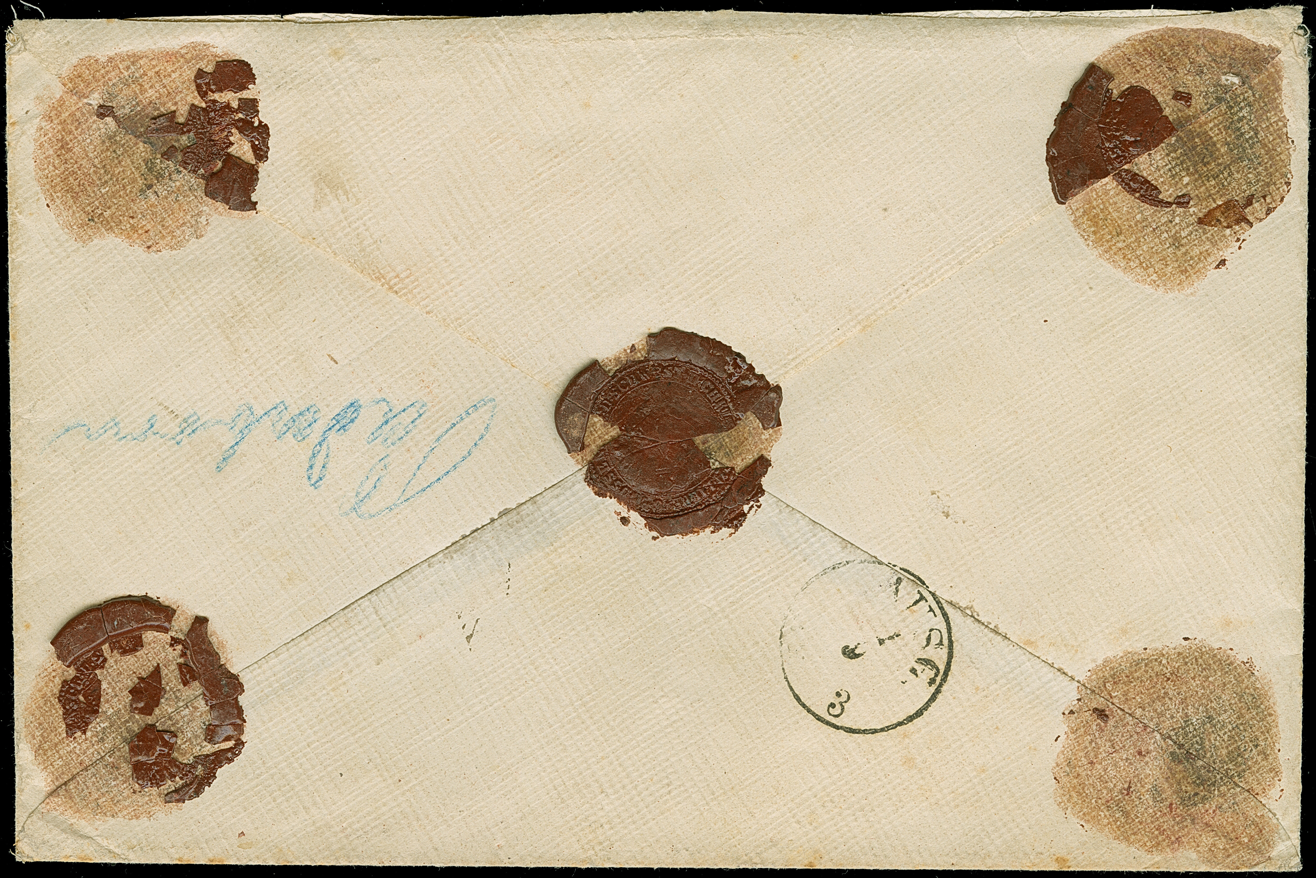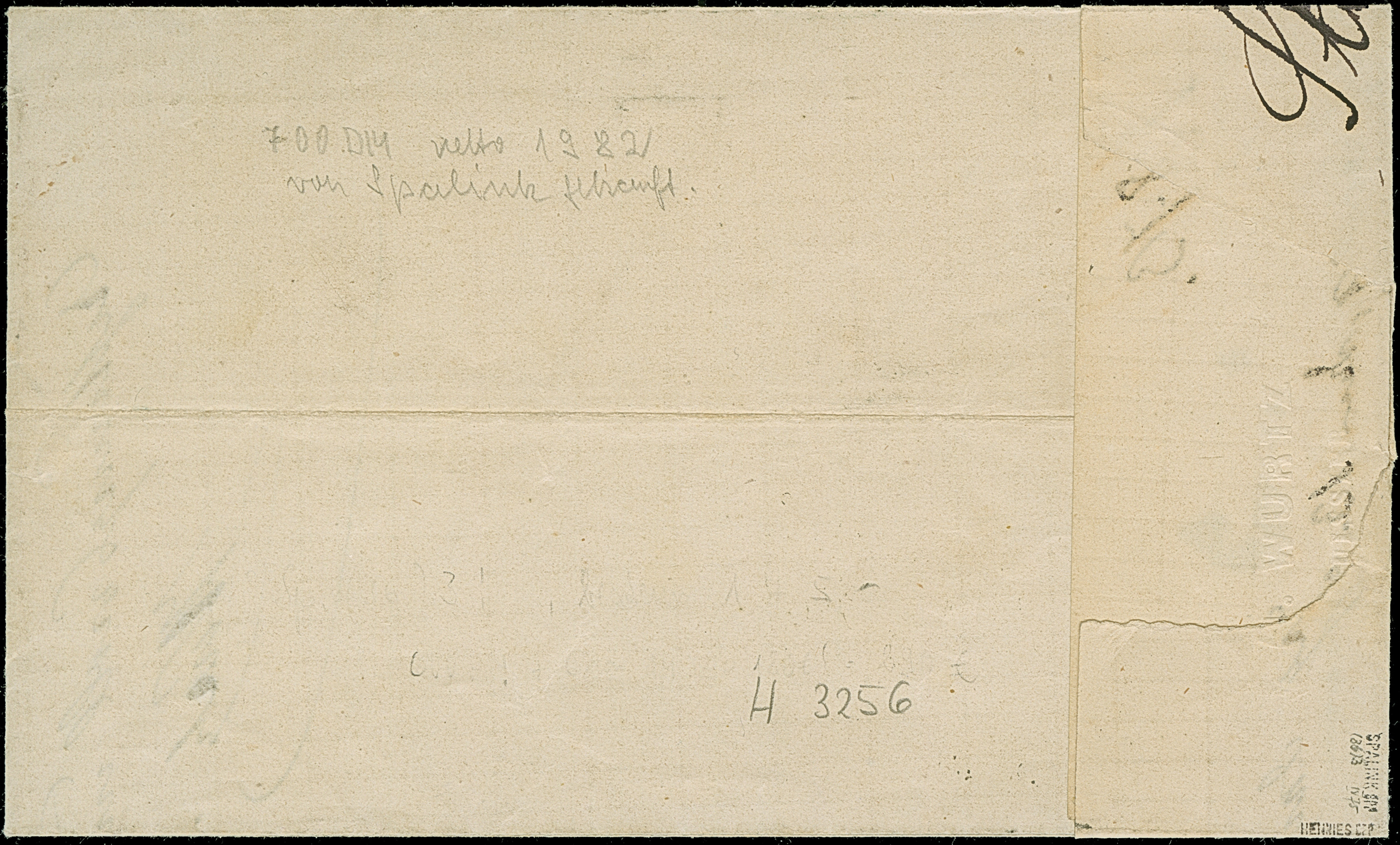 “SCHLETTSTADT 23.MAI.73” (Spalink 33) auf kleiner Schild orange rückseitig auf Wert-Paketbegleit-Vordruck-Briefkuvert für ein 4 Pfund 90 g schweres Paket mit Wertangabe “40 Thaler” mit beidseitig waagerechtem Dreierstreifen, Paar und vier Einzelmarken Norddeutscher Postbezirk Innendienstmarke 10 Gr. gelblichgrau mit handschriftlicher Entwertung “Schlettstadt 23/5” sowie Leitvermerk “via Bremen” nach Brooklyn, New York. Die fehlenden 6½ Groschen vom deutschen Portoanteil sind mit Blaustift auf dem Umschlag taxiert und nach Begleichung der Nachforderung entsprechend gestrichen worden. Die farbfrische Brustschildmarke ist gut geprägt, üblich gezähnt und in einwandfreier Erhaltung. Die 10 Gr.-Marken sind zum Teil im Rand nicht perfekt und der Dreierstreifen wurde verquetscht aufgeklebt. Trotz der Einschränkungen eine beeindruckende 80½‑Groschen-Frankatur aus dem Württemberger-Fund, Fotoattest Krug BPP (2023)