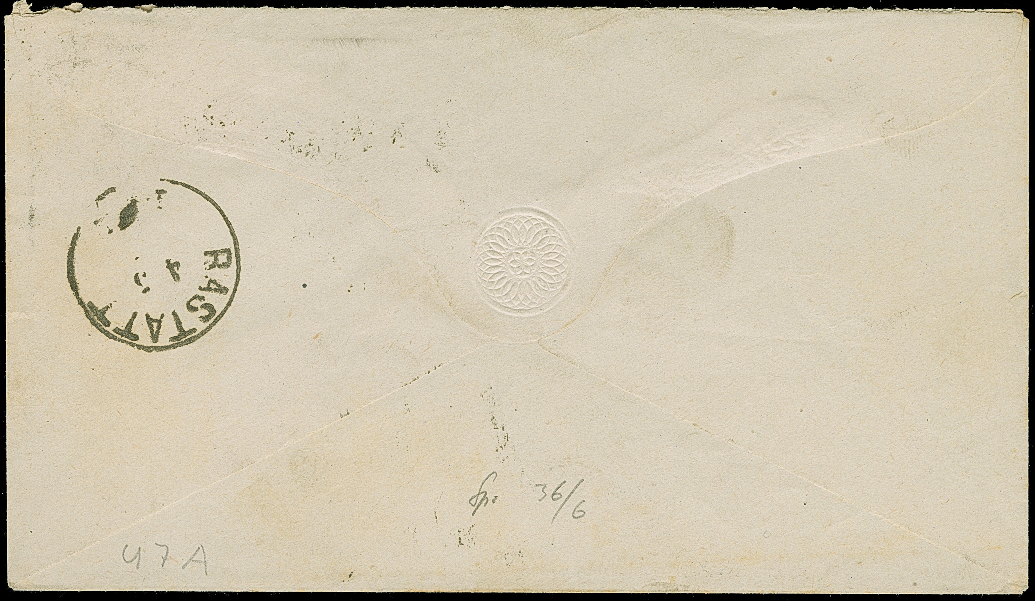 “STRASSBURG I. ELS. 3.MAI.75” (Spalink 36-6) sehr klar auf Ganzsachenumschlag 10 Pfge nach Rastatt mit Ankunftsstempel, in einwandfreier Erhaltung