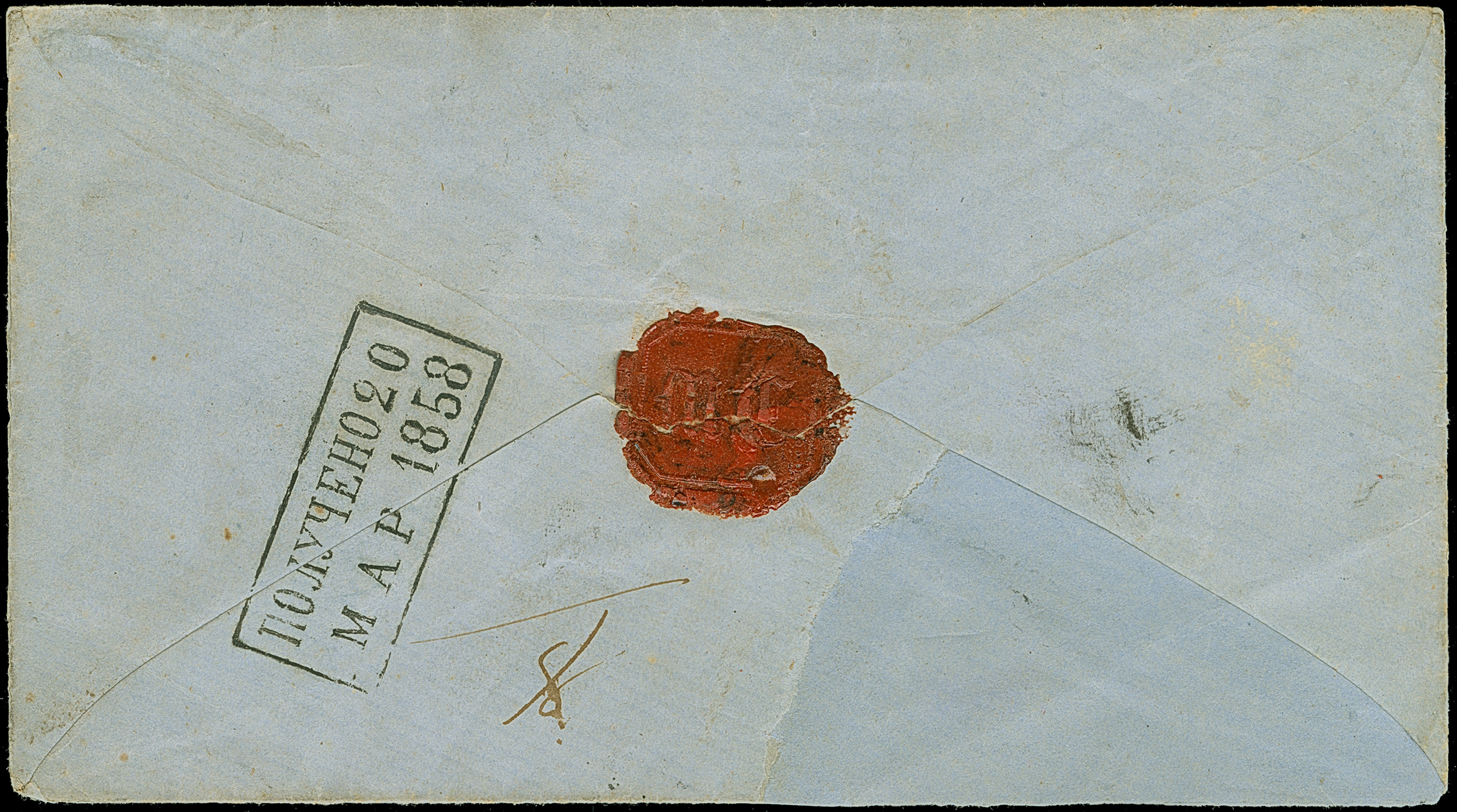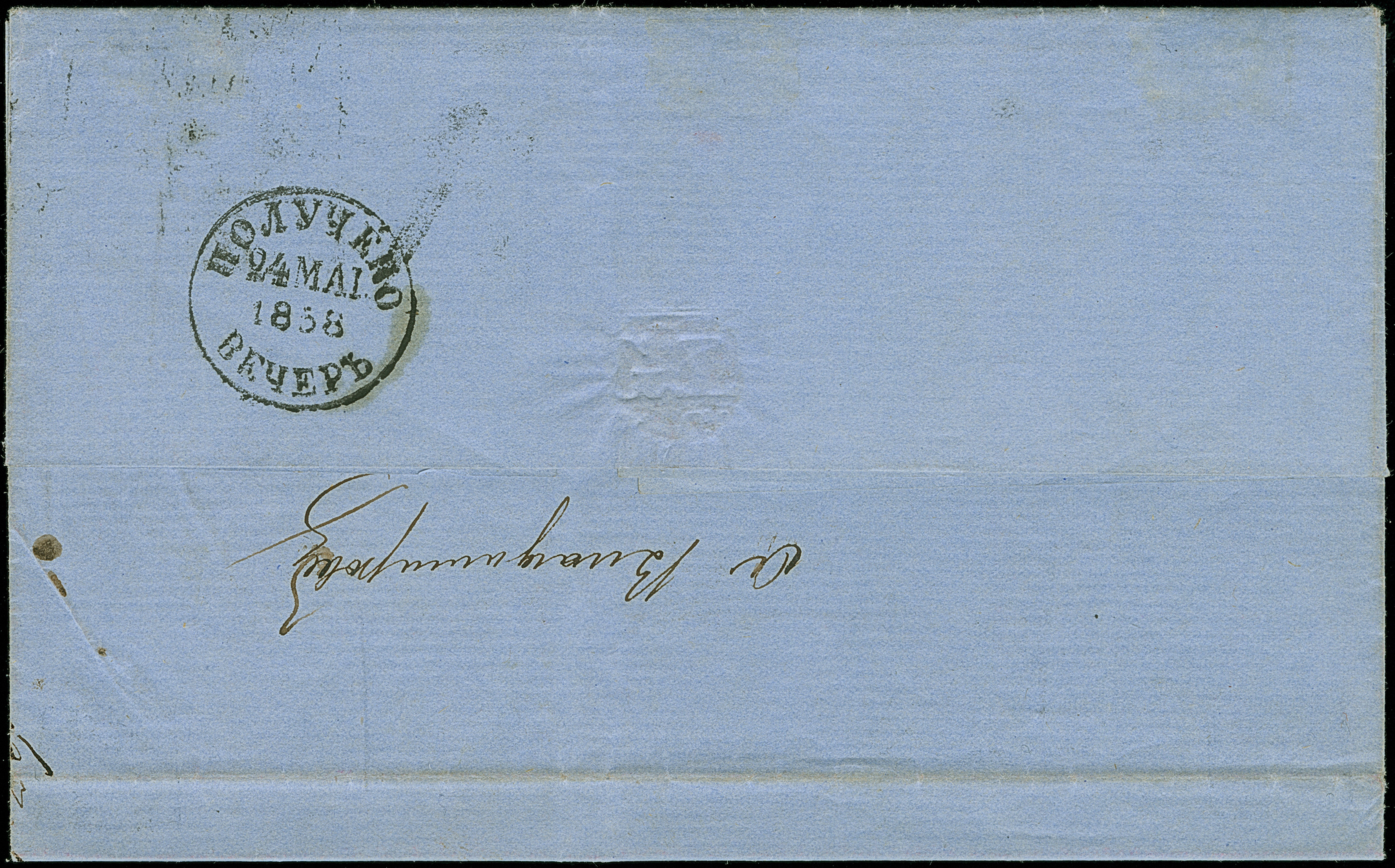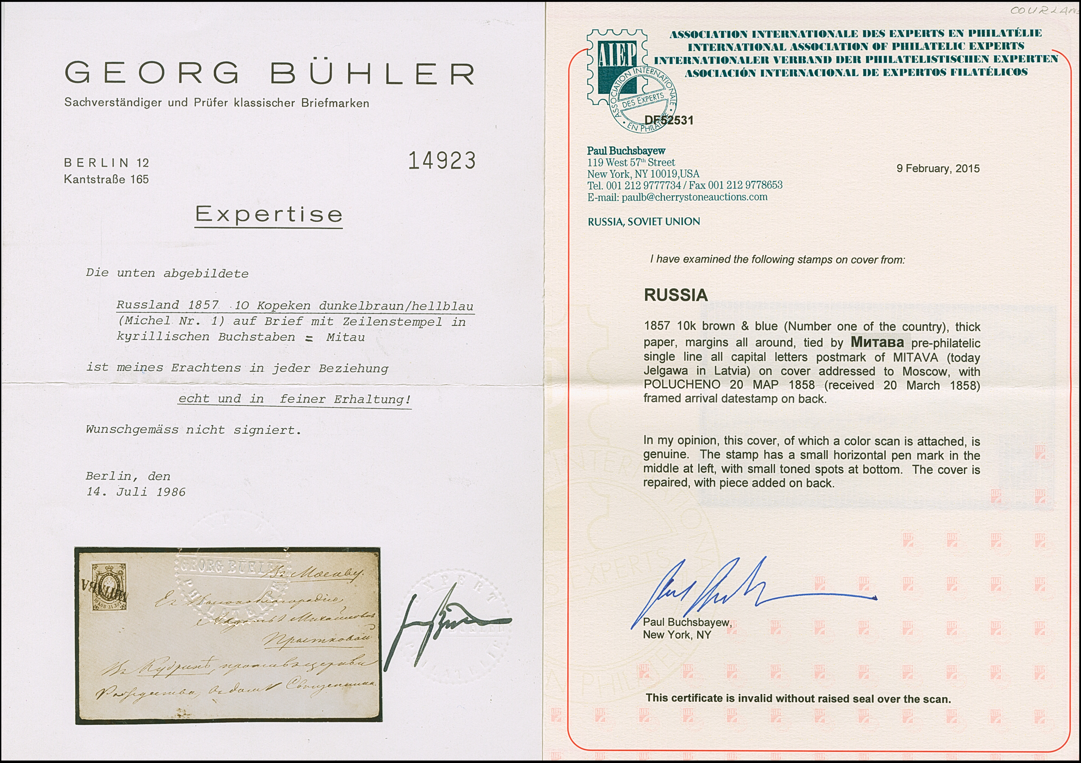 MITAU (Latvia): 10 kopeck brown & blue, large margins, tied by clear pre-philatelic single line "MITAVA" to entire letter to Moscow, with reverse side arrival mark of March 1858. The stamp tiny penstroke at left; some minor ageing and small part of backflap restored, still very fine and rare; most likely the finest of 4 covers recorded with this cancellation. Certificate Buchsbayew (2015)