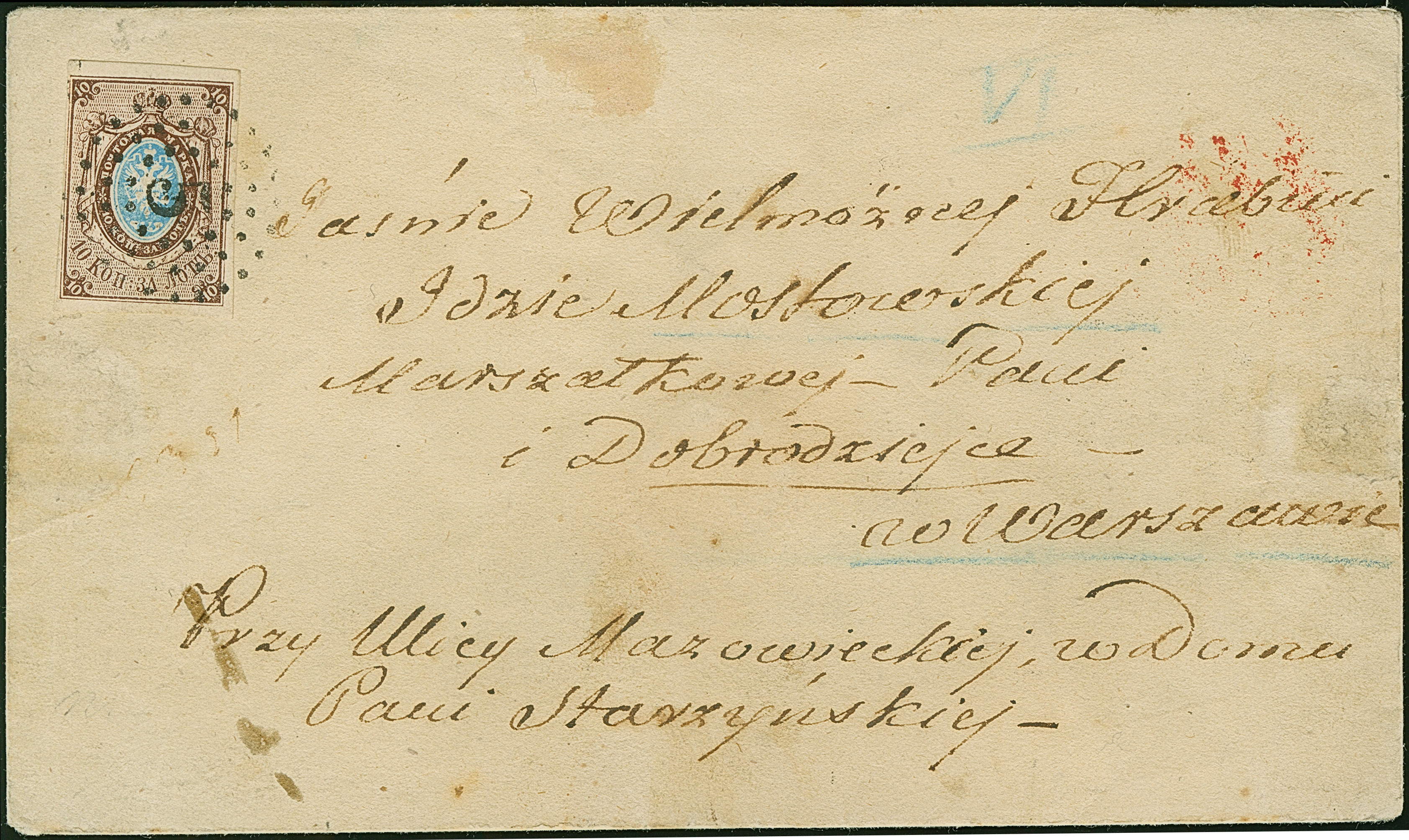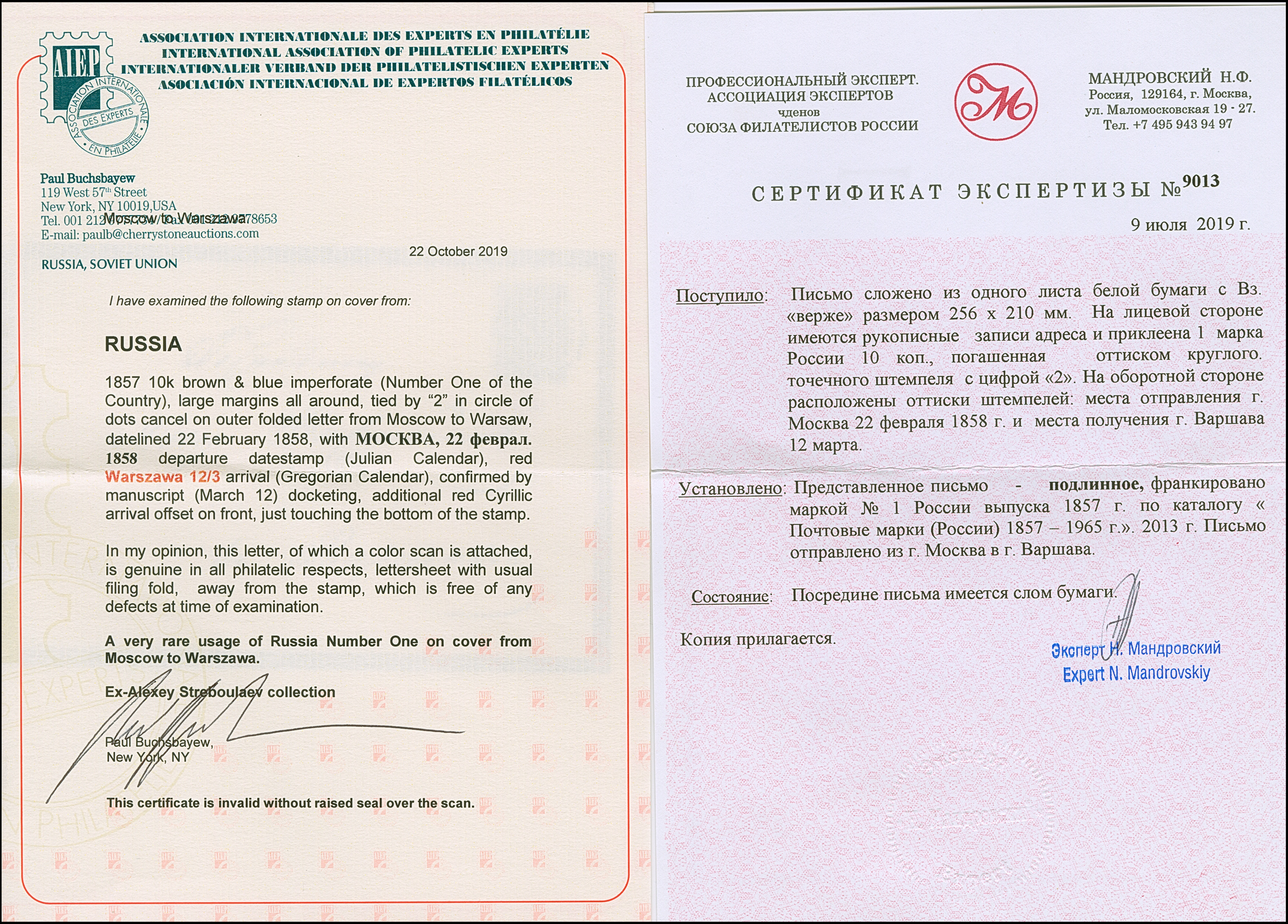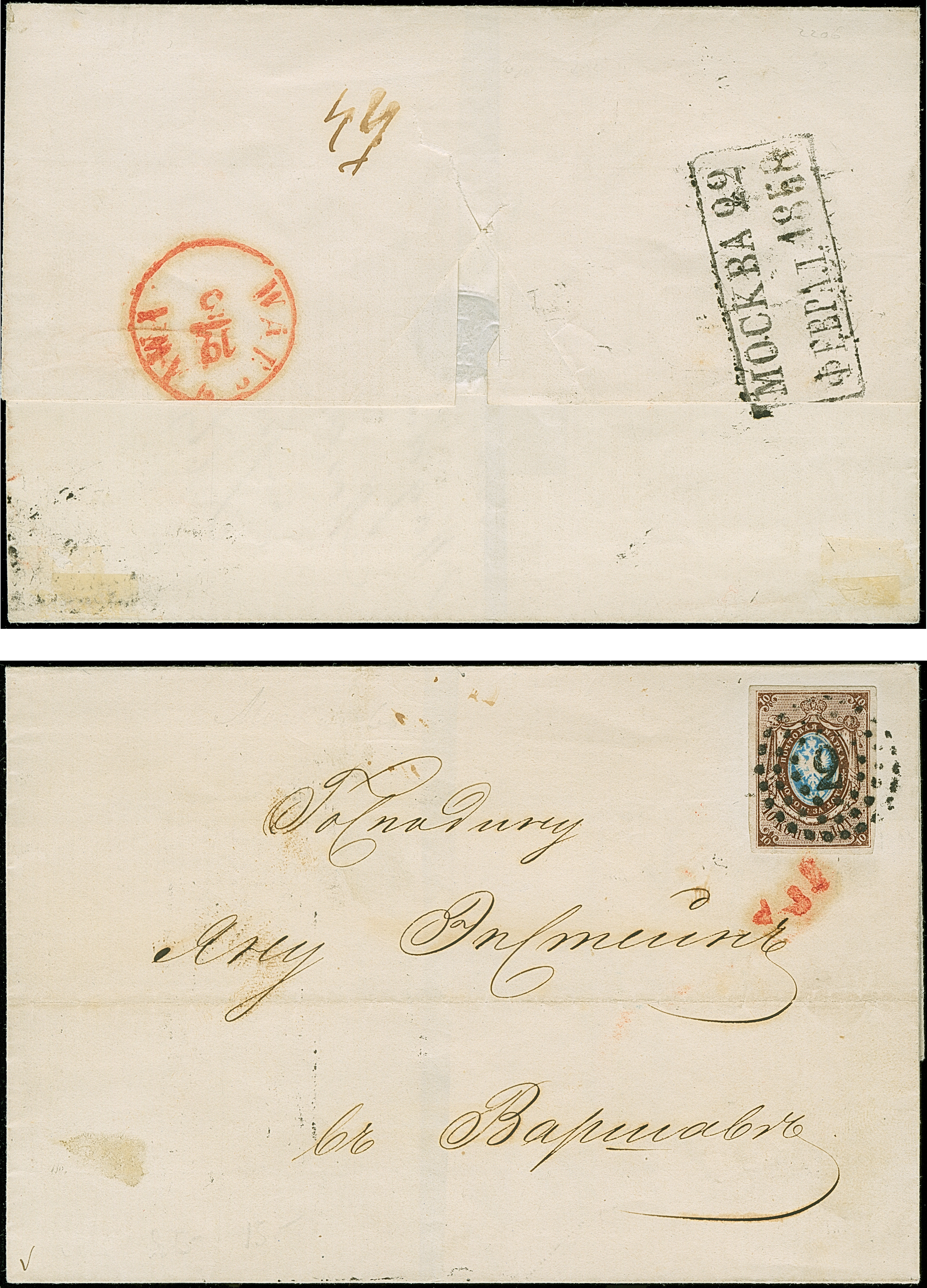MOSCOW: 10 kopeck brown & blue, nice large even margins, tied by dotted numeral "2" to letter sheet with reverse side clear boxed dispatch mark "MOSCOW 22 APRIL 1858", to Warsaw with red arrival mark (small part offset on front). A very fine and rare cover; just 3 No.1 entires have been recorded with this cancellation. Certificates Buchsbayew and Mandrovskiy (each 2019)