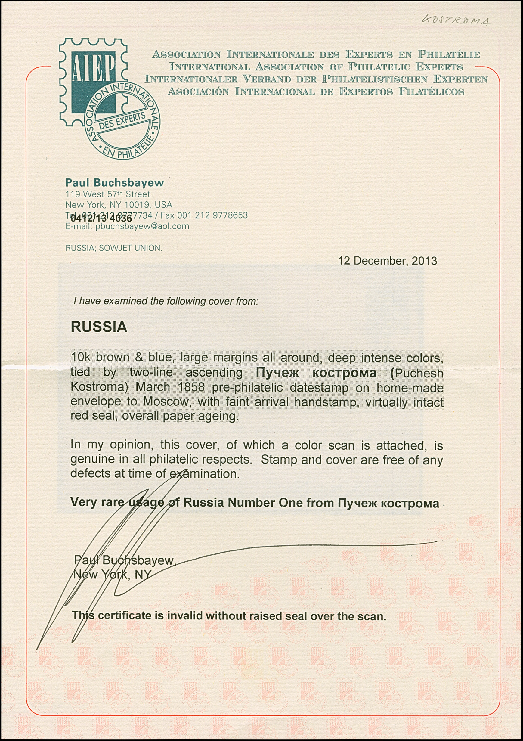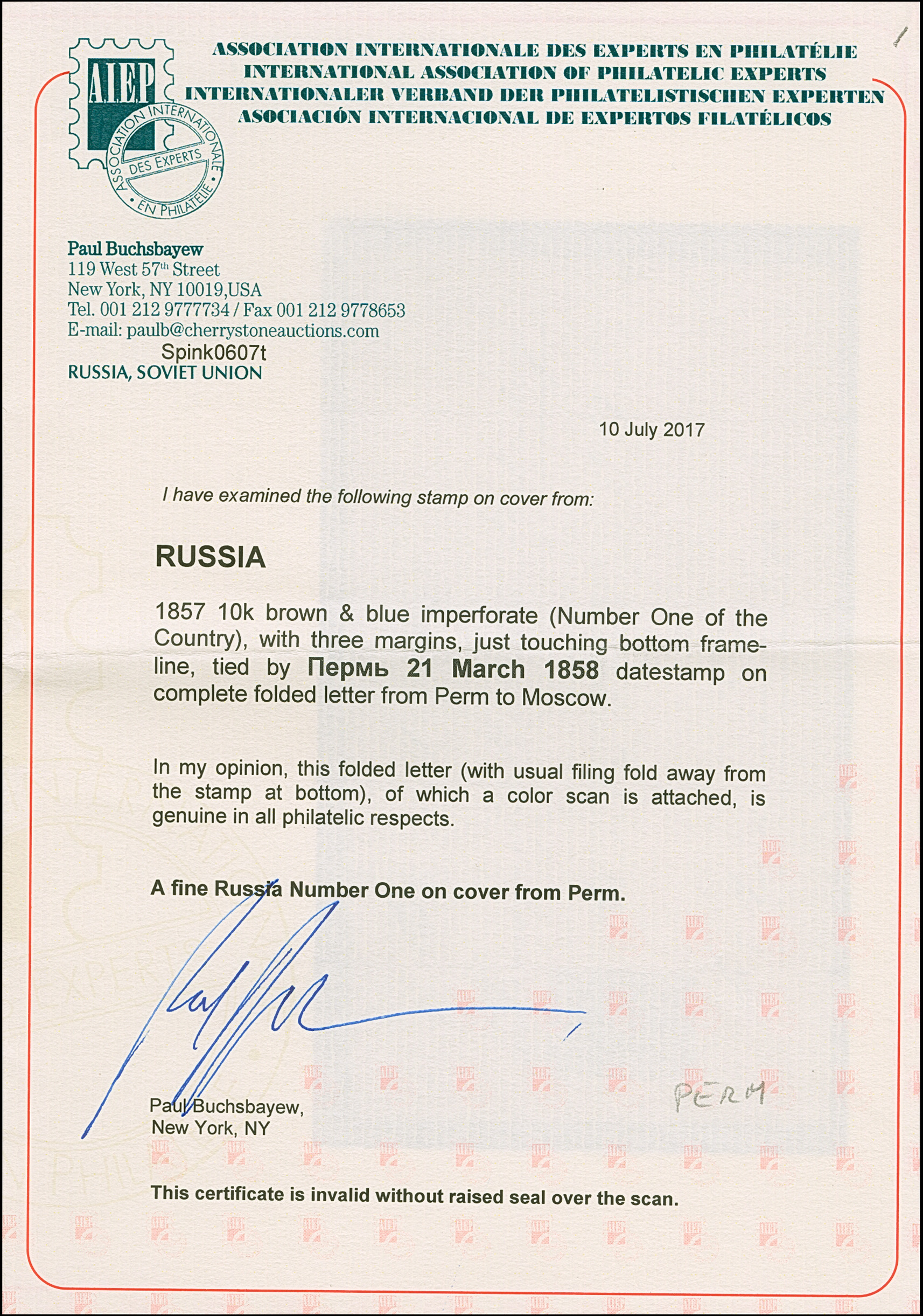 PERM: 10 kopeck brown & blue, slightly touched at lower left, otherwise good even margins, tied by clear strike of pre-philatelic double line "PERM 21 MARCH 1858" to entire letter to Moscow. Very fine and fresh. The only recorded No.1-cover from Param, which was in 1858 a small village in the isolated Ural area. Certificate Buchsbayew (2017)