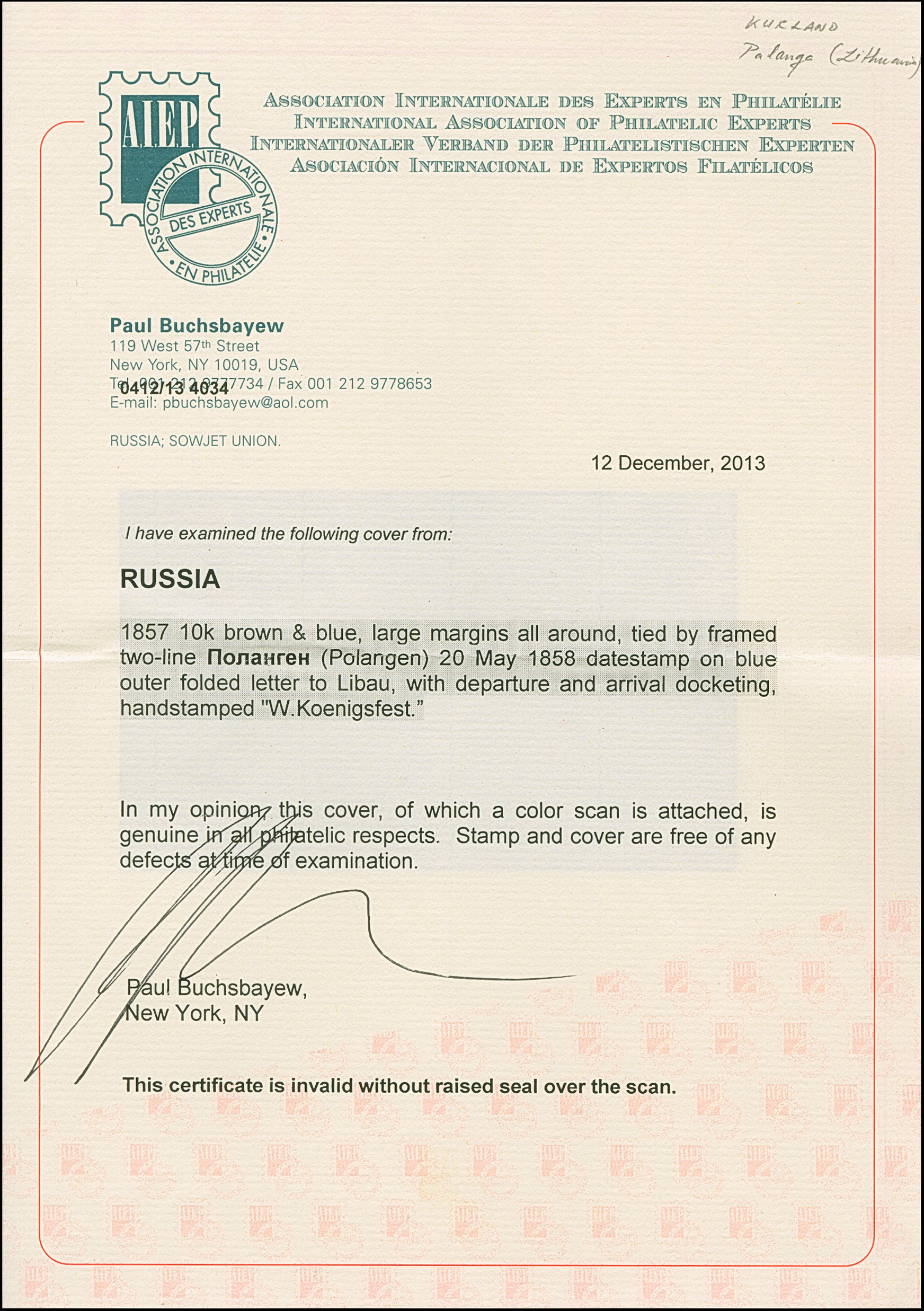 POLANGEN (Lithuania): 10 kopeck brown and blue, ample to mostly large margins, tied by clear boxed "POLANGEN 20 MAI 1858" to lettersheet to Libau. Very fine and fresh; on front 2 collector's handstamps. Certificate Buchsbayew (2013)