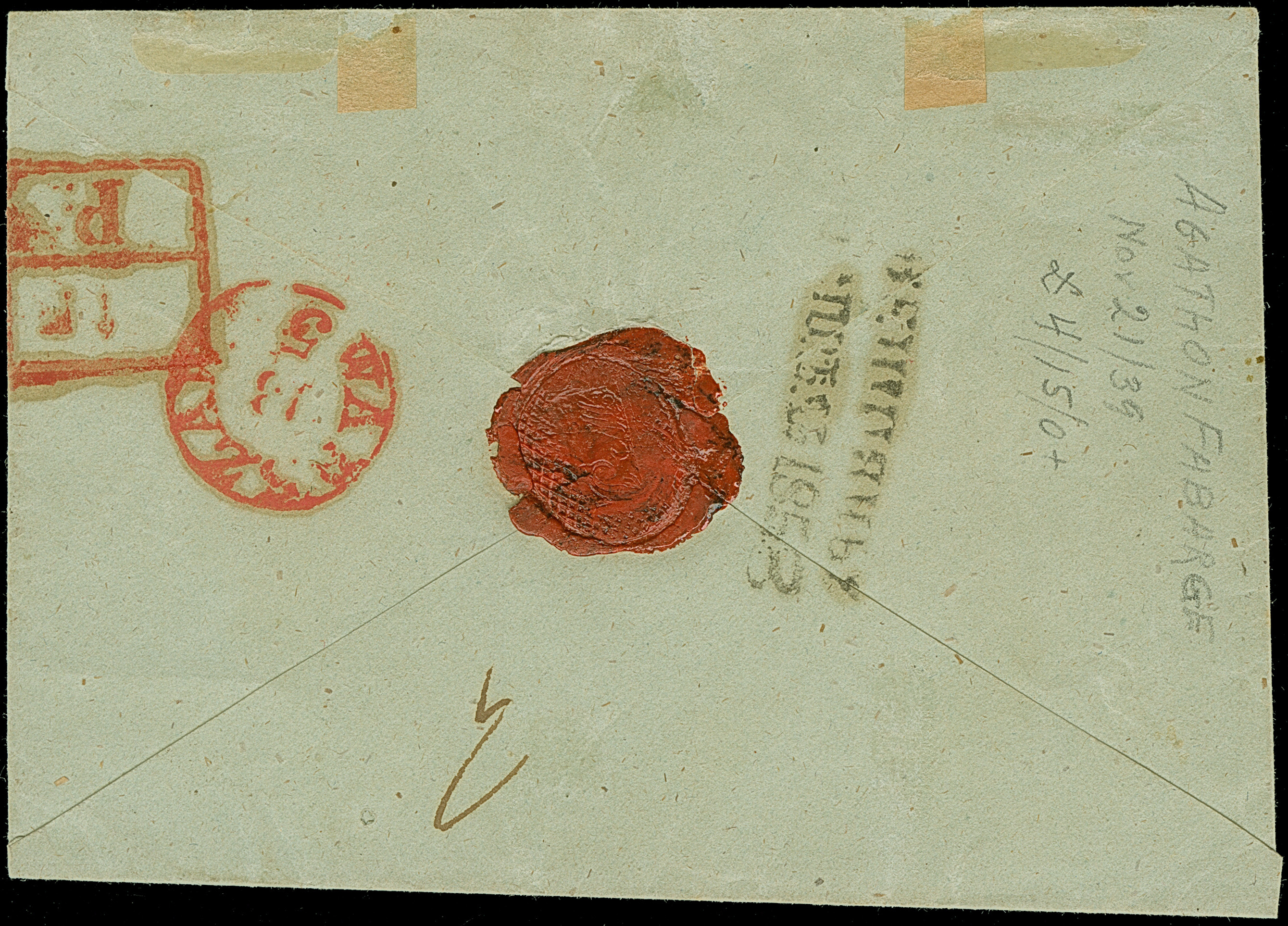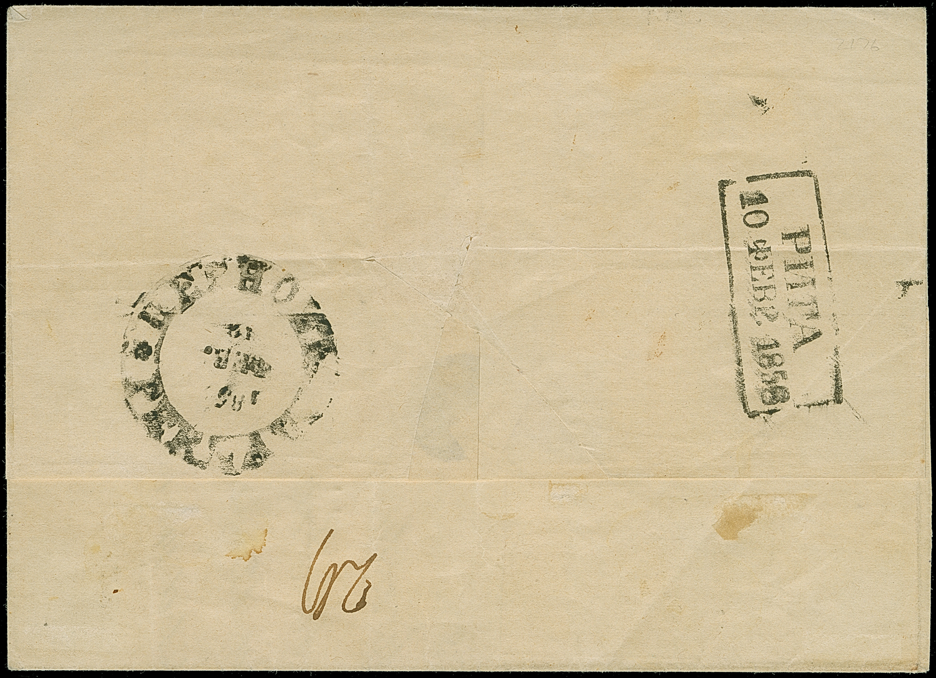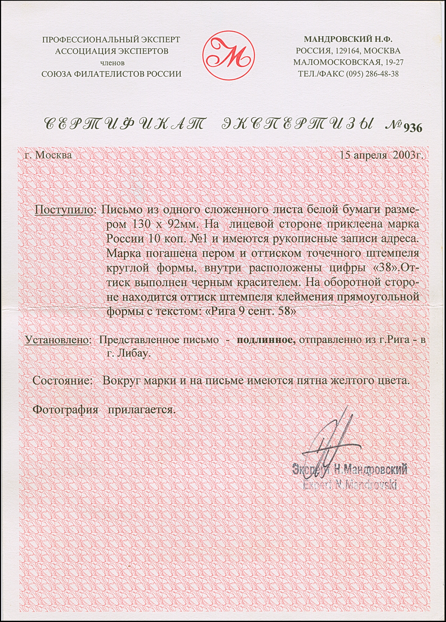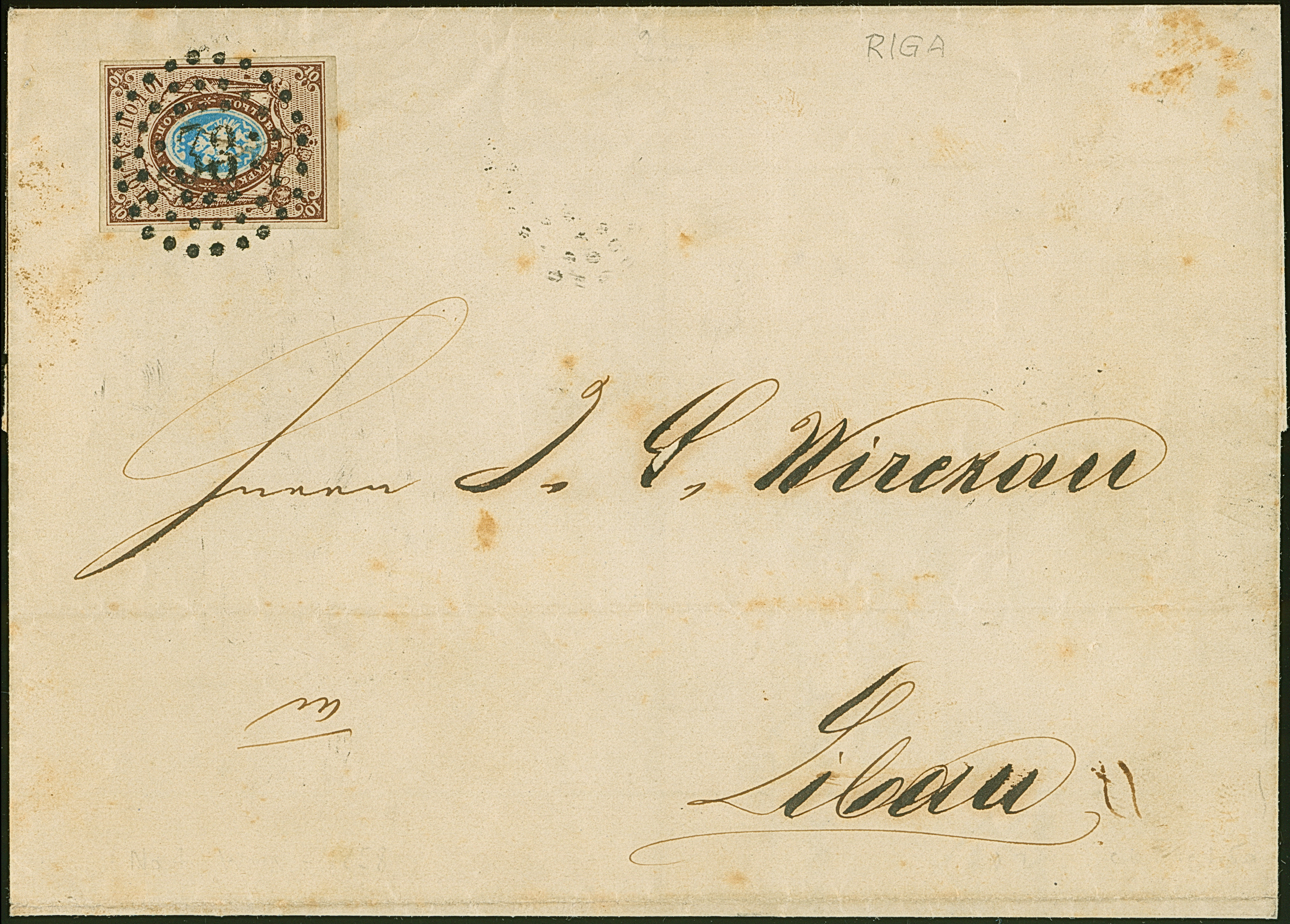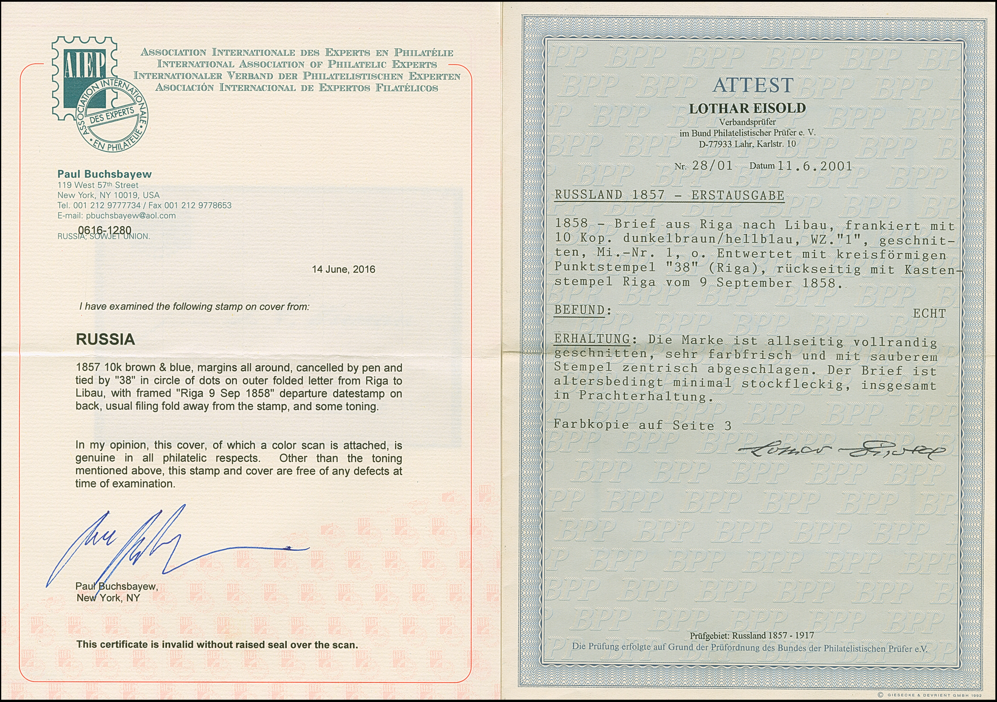 RIGA (Latvia): 10 kopeck brown and blue, good to large margins, tied by clear dotted numeral "38" to letter sheet to Libau with reverse side dispatch mark "RIGA 9 SEP. 1858". Some minor staining, otherwise very fine and attractive. 1 of just 2 entires recorded with this cancellation. Certificates Eisold (2001), Mandrovsky (2003) and Buchsbayew (2016)