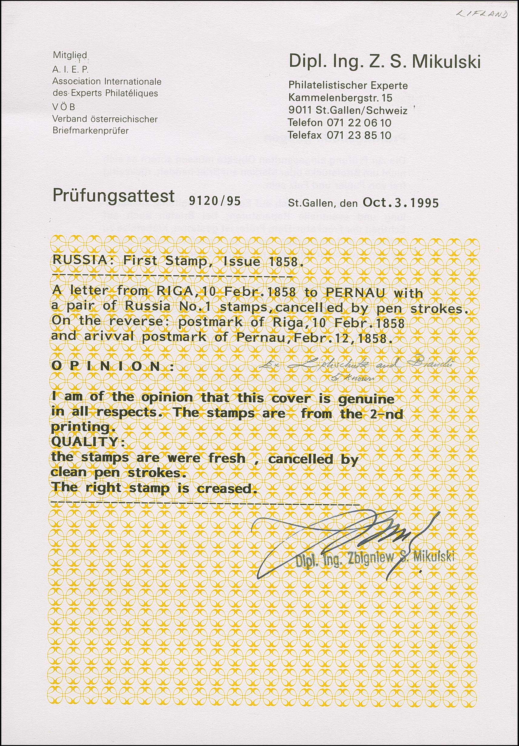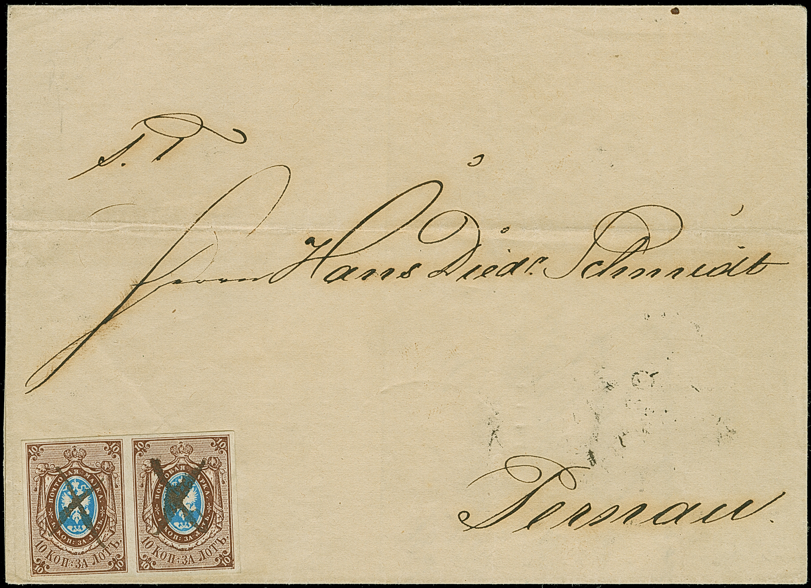 RIGA (Latvia): 10 kopeck brown and blue, horizontal pair with good to large margins, tied by pen crosses to letter sheet to Pernau with reverse side dispatch mark "RIGA 10 FEB. 1858" and bilingual arrival mark. The right stamp with very minor and unobtrusive diagonal bend, still very fine and most attractive. An extremely rare franking. Certificates Mikulski (1995) and Citerne BPP (2026)