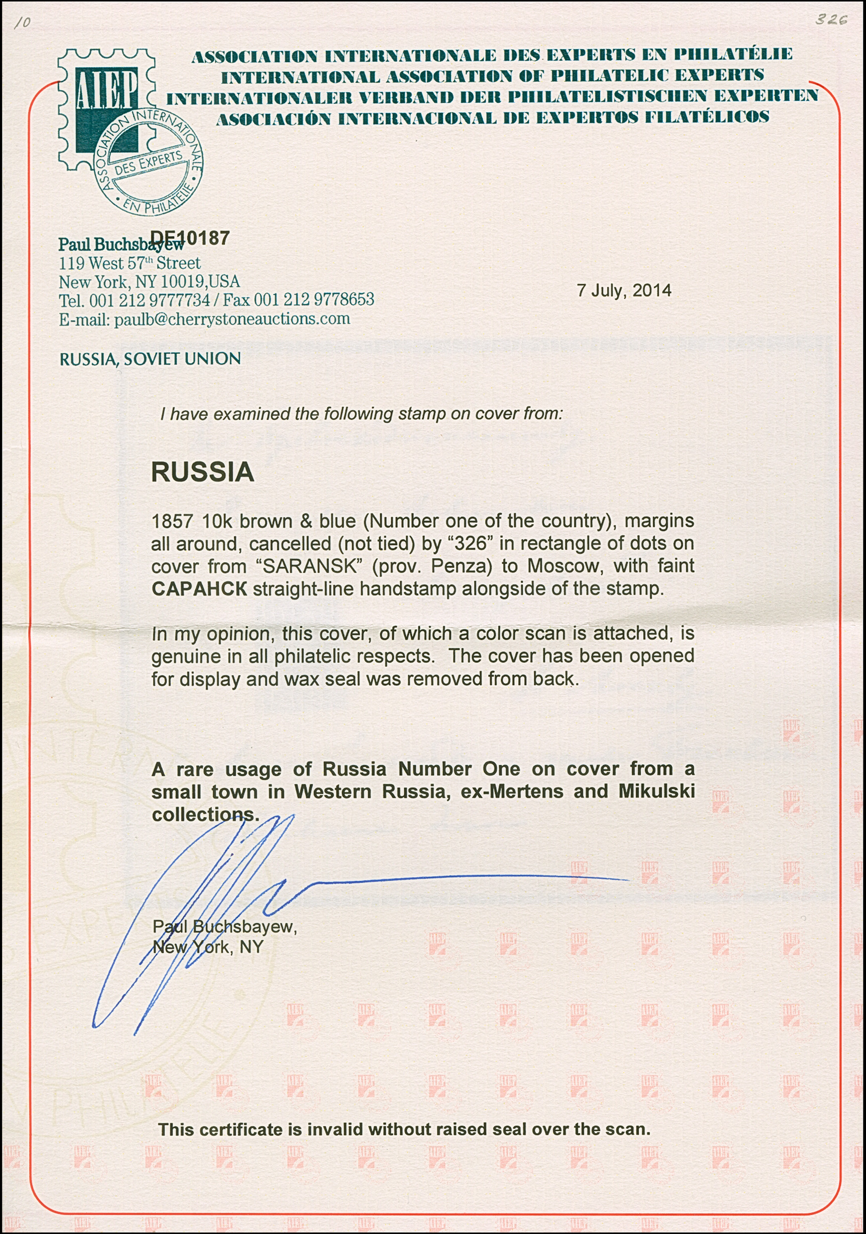 SARANSK: 10 kopeck brown & blue, good to large even margins, with central dotted rectangular "326" and adjacent dry strike of straight line "SARANSK", used on opened out envelope to Moscow. Very fine and fresh. The only recorded No.1-cover with this cancellation and one of just 2 recorded from the village of Saransk. Certificate Buchsbayew (2014)