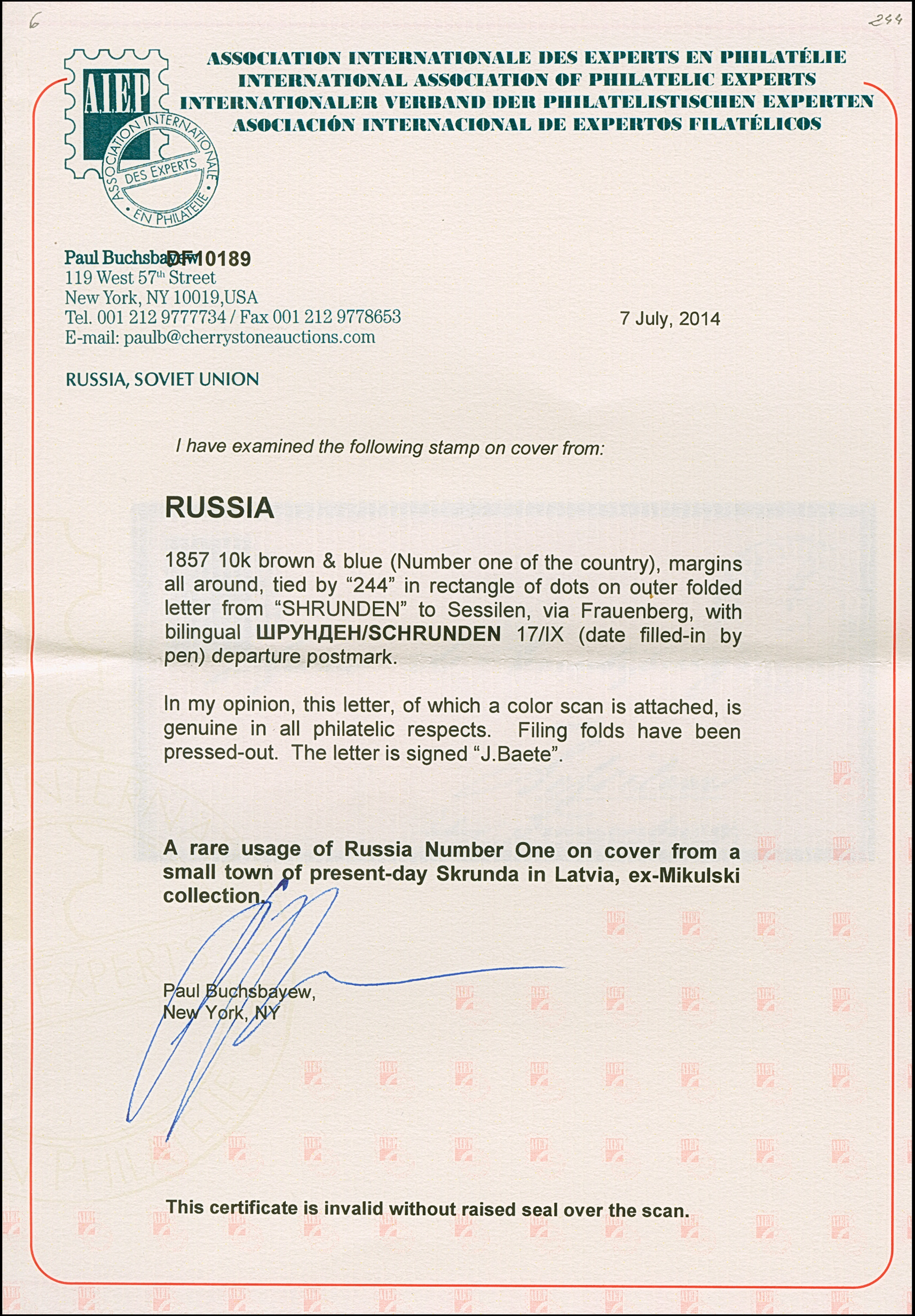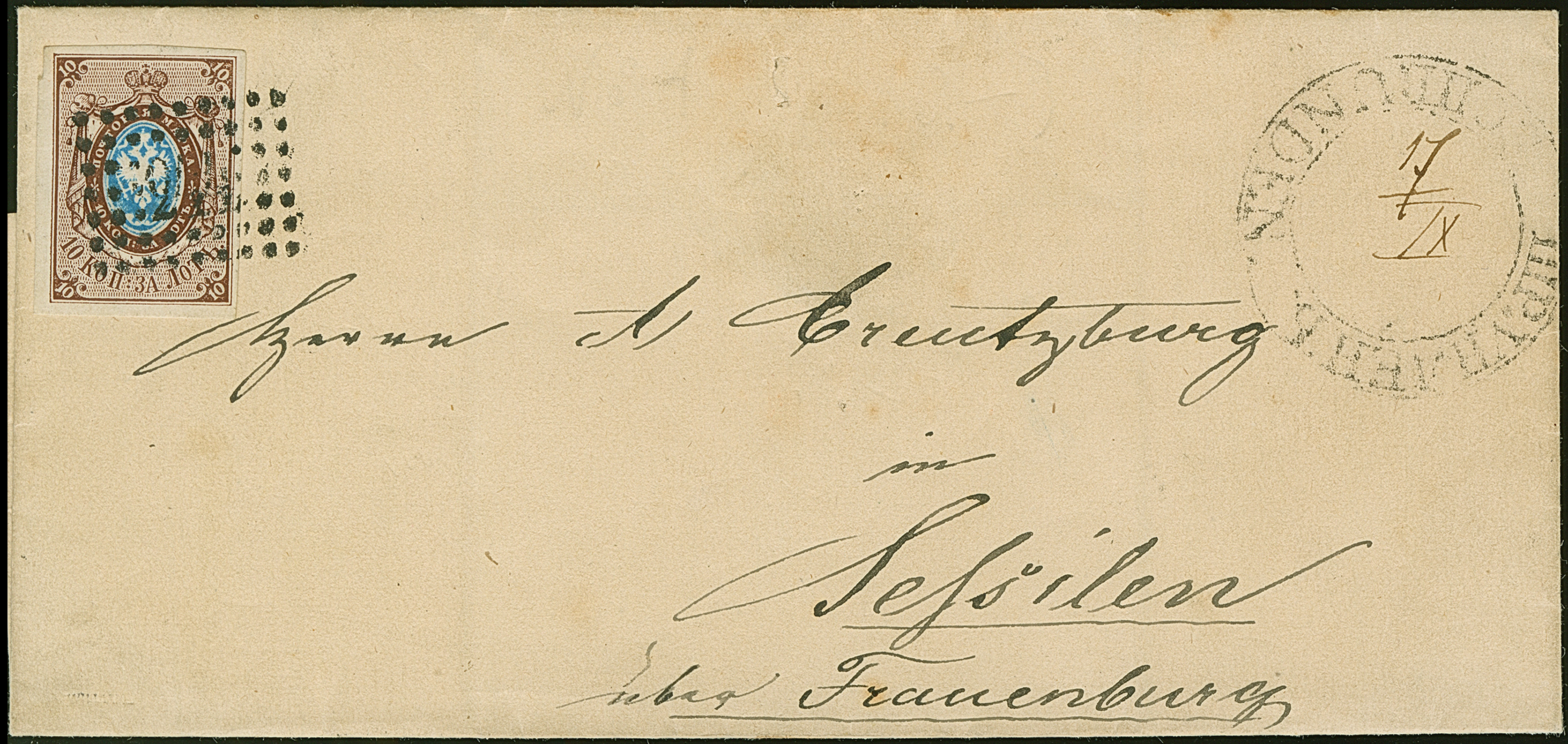 SCHRUNDEN (Latvia): 10 kopeck brown & blue, good to large margins, tied by dotted rectangular "244", with adjacent pre-philatelic bilingual double circle with manuscript date "7/IX" to letter sheet to Sessilen. Very fine and attractive. The only recorded number 1 cover from this small village. Certificate Buchsbayew (2014)