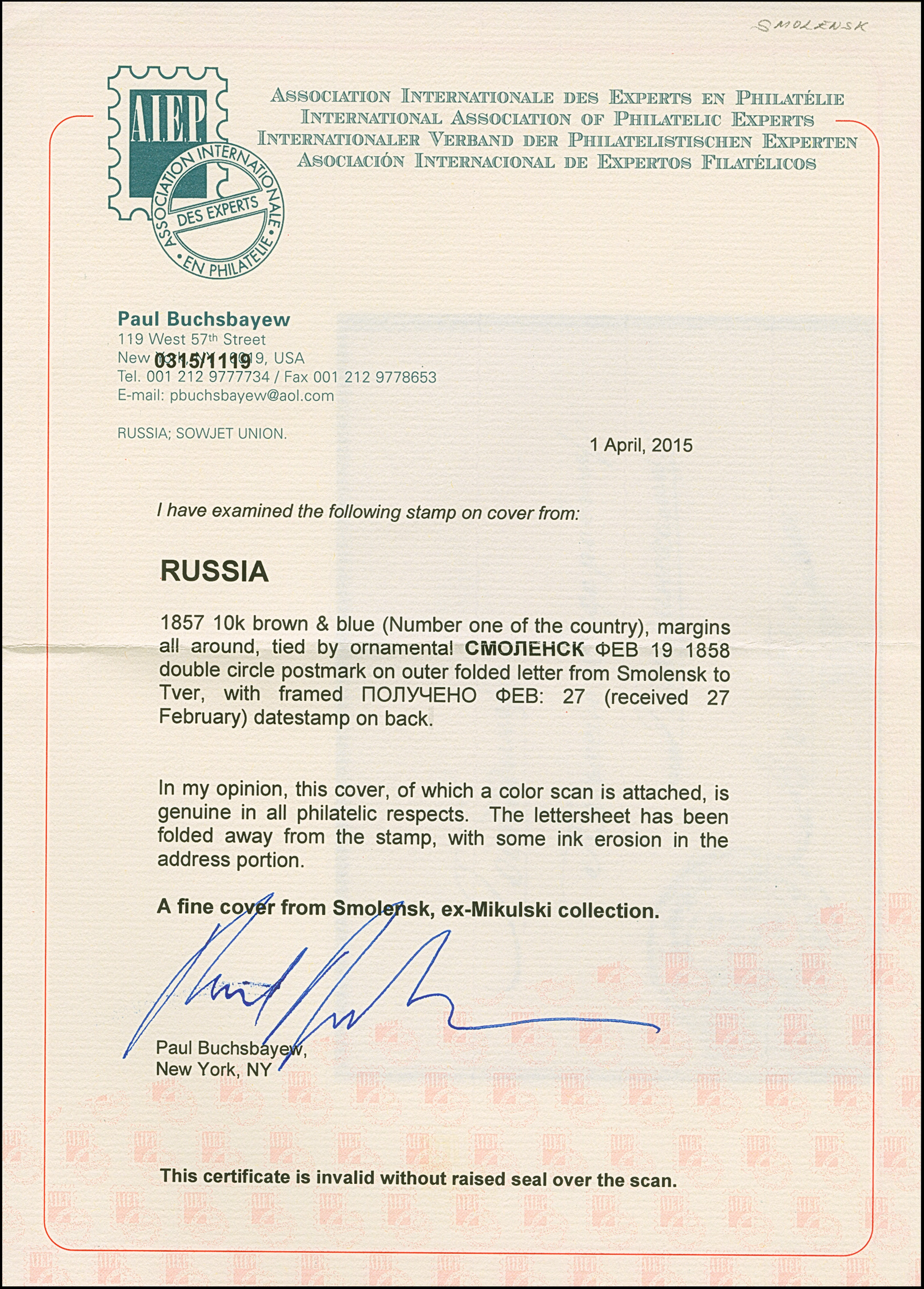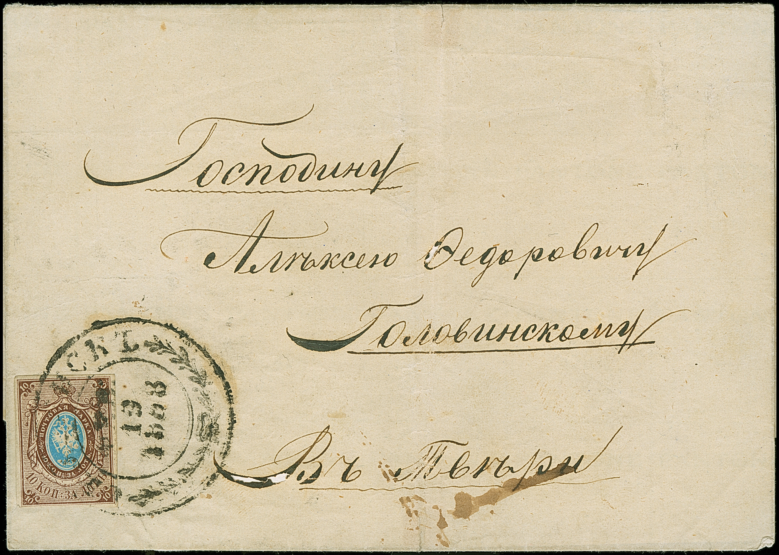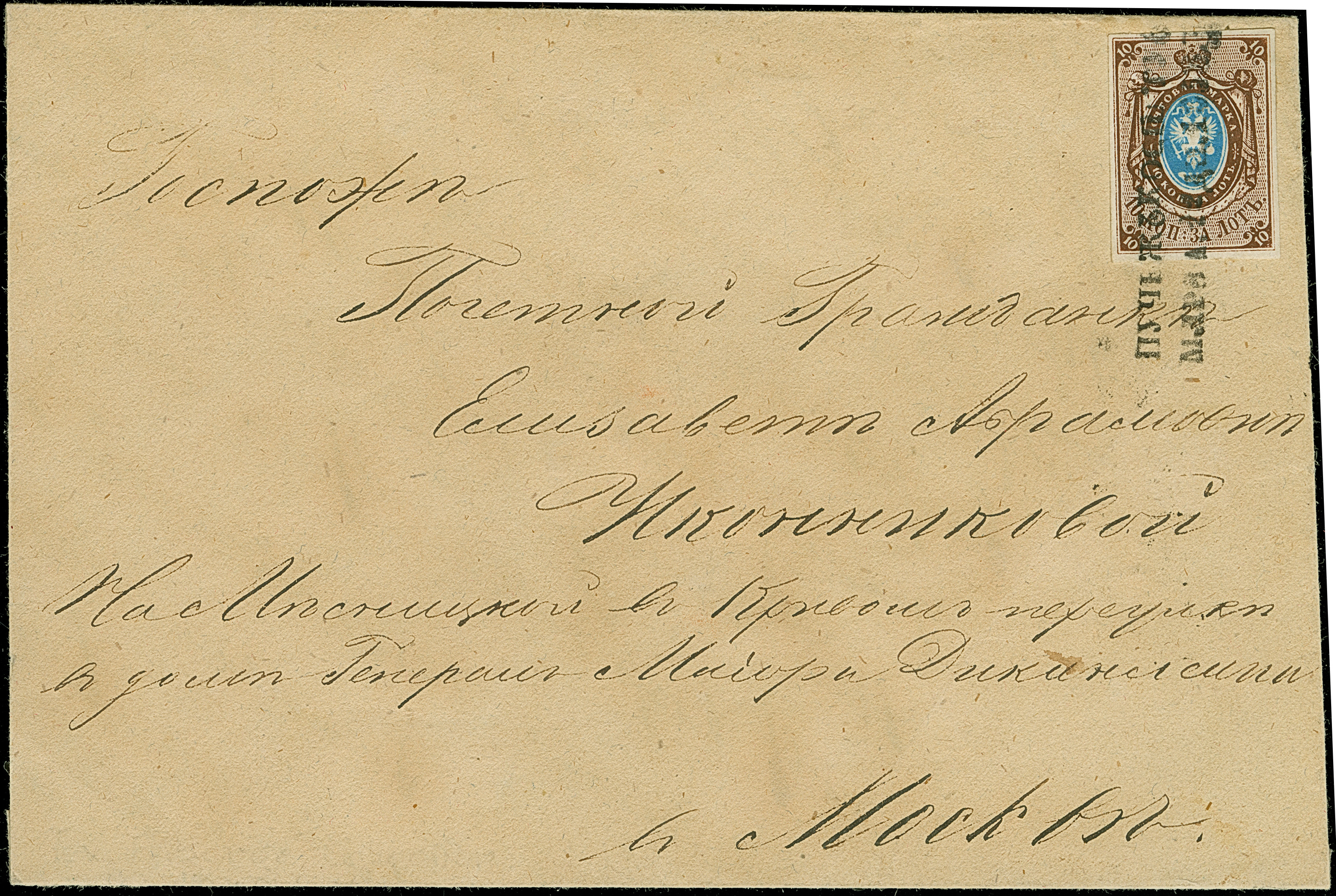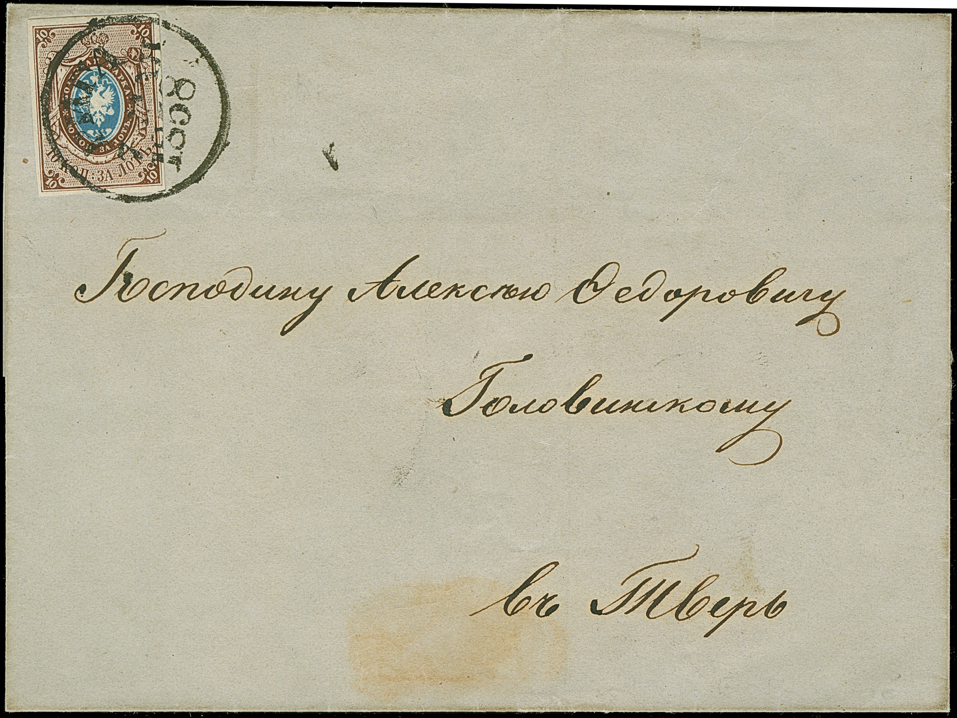 SMOLENSK: 10 kopeck brown & blue, ample to large margins, tied by large fancy double circle "SMOLENSK FEB.19 1858" to letter sheet to Twer. Some minor ink erosion in the address, otherwise very fine. 1 of just 2 entires recorded from Smolensk. Certificate Buchsbayew (2015)