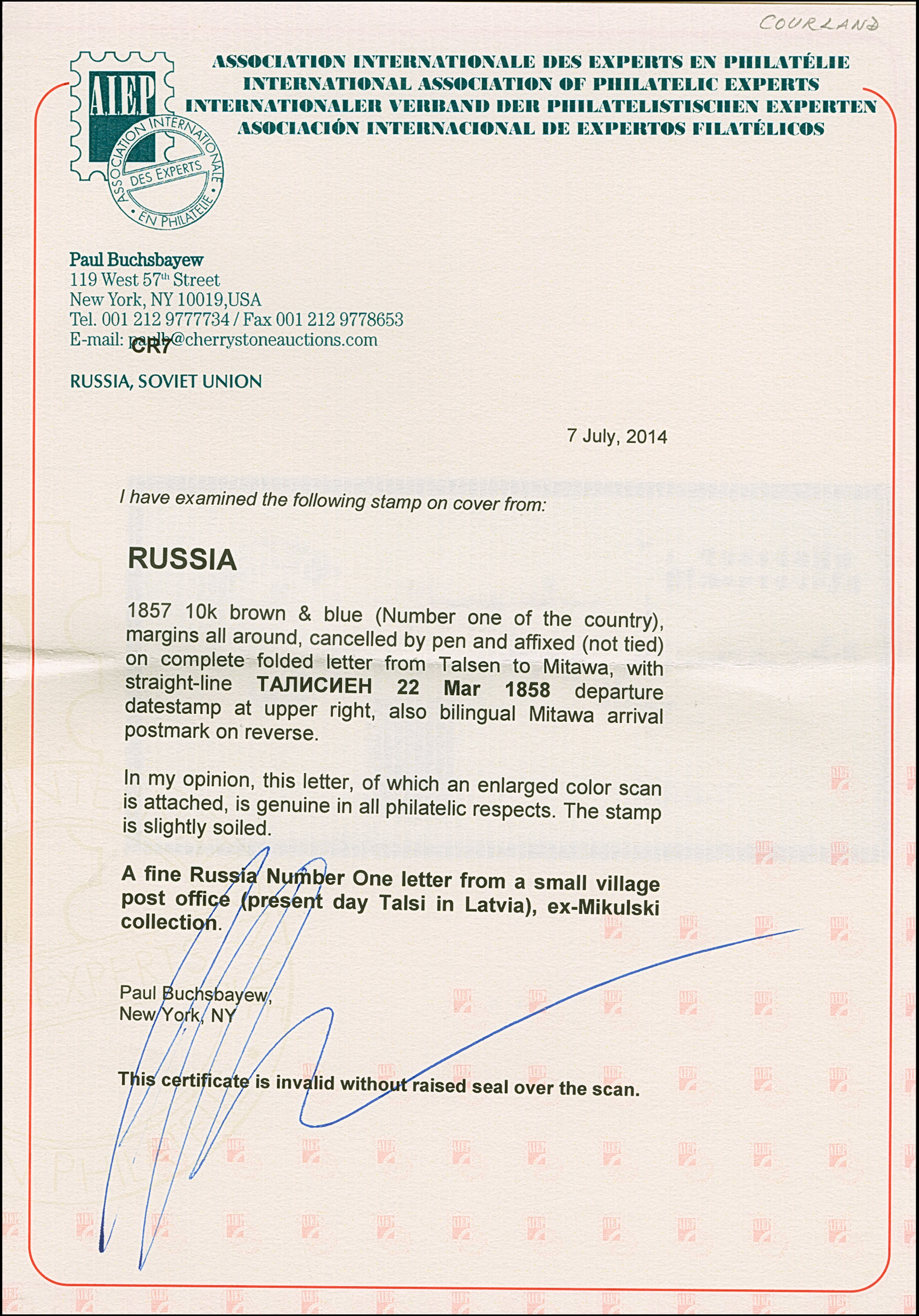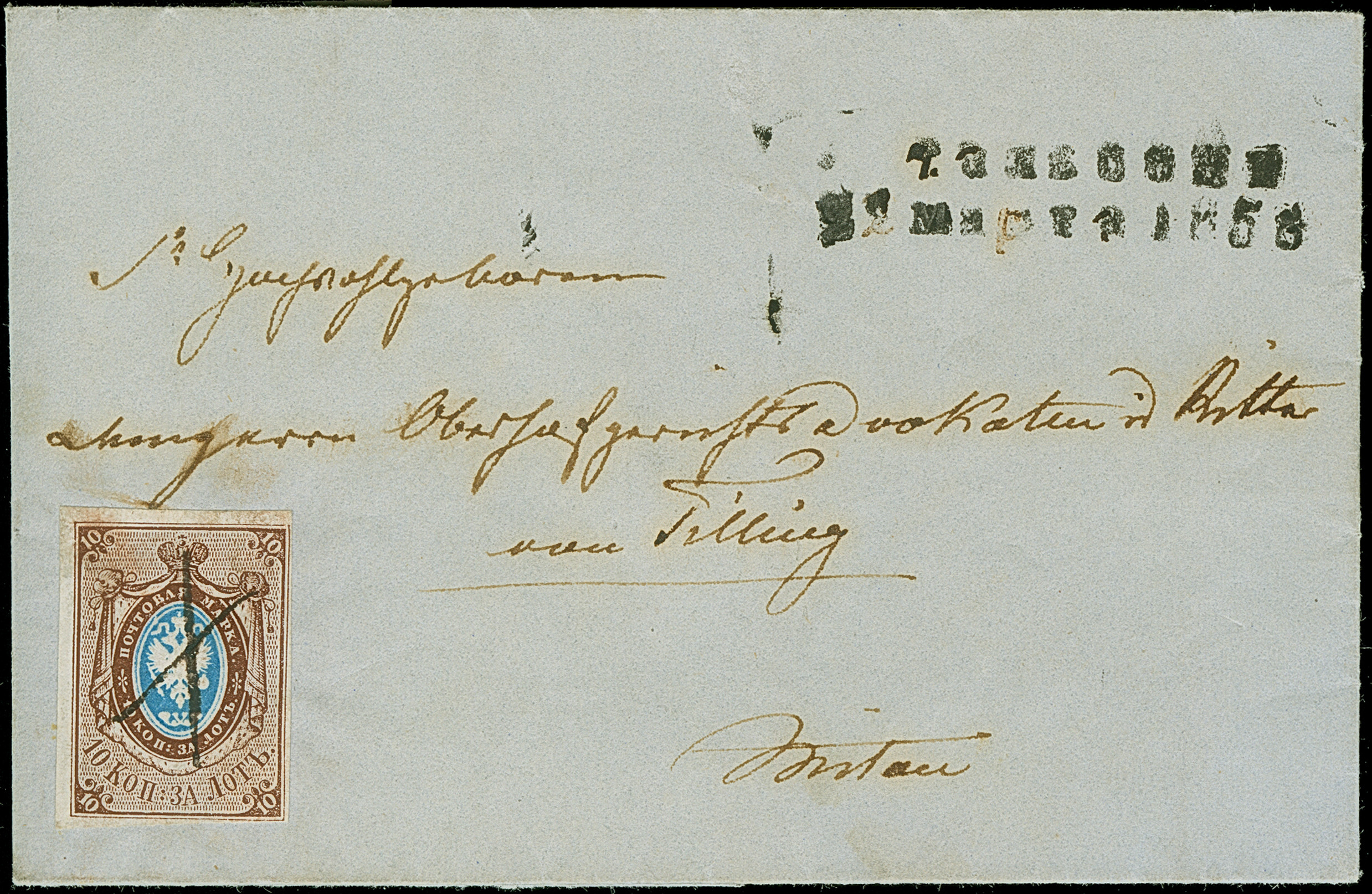 TALSEN (LATVIA): 10 kopeck brown & blue, clear to large margins, tied by pen cross to small entire letter (dated inside "Pastensens (?) 22 März 58") with adjacent pre-philatelic double line "TALISIEN 22 MAR 1858", to Mitau with bilingual arrival mark. Some very minor toning, otherwise very fine. A very rare and attractive No.1-usage from a tiny village. Certificate Buchsbayew (2014)