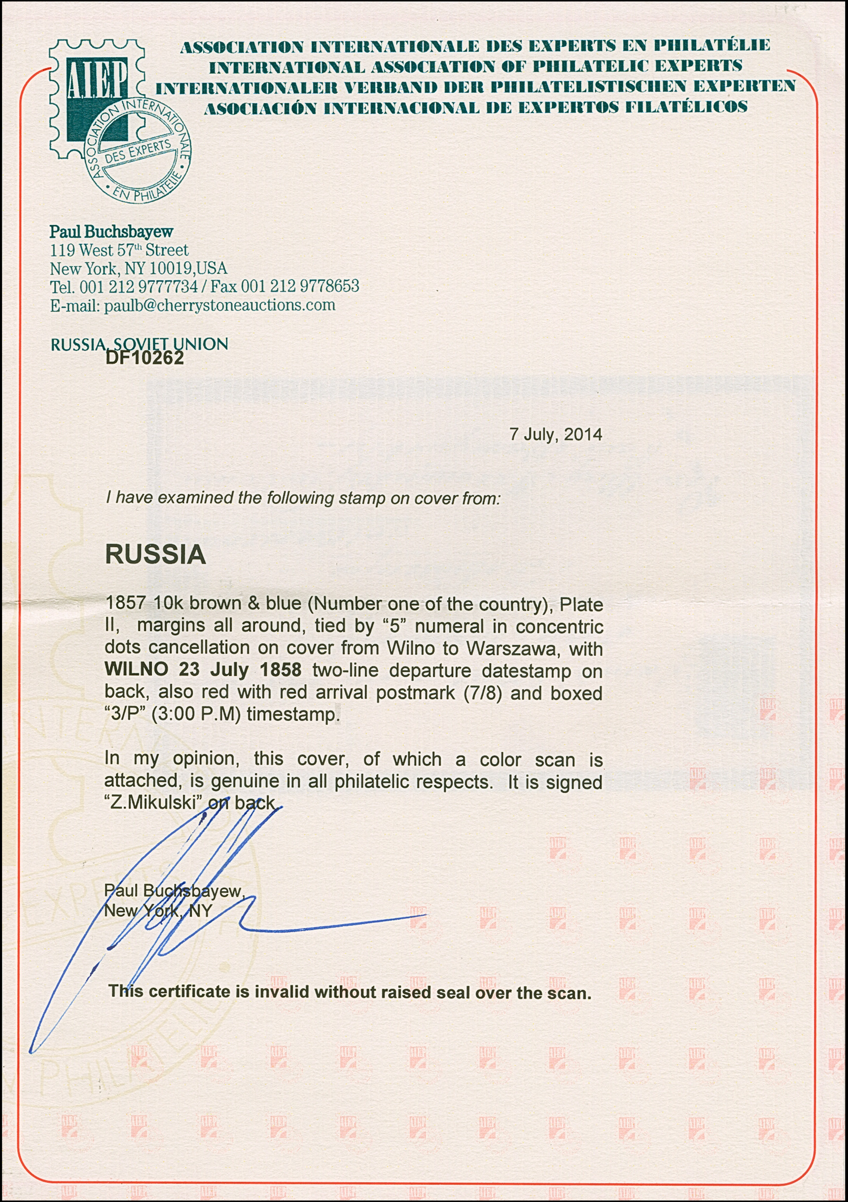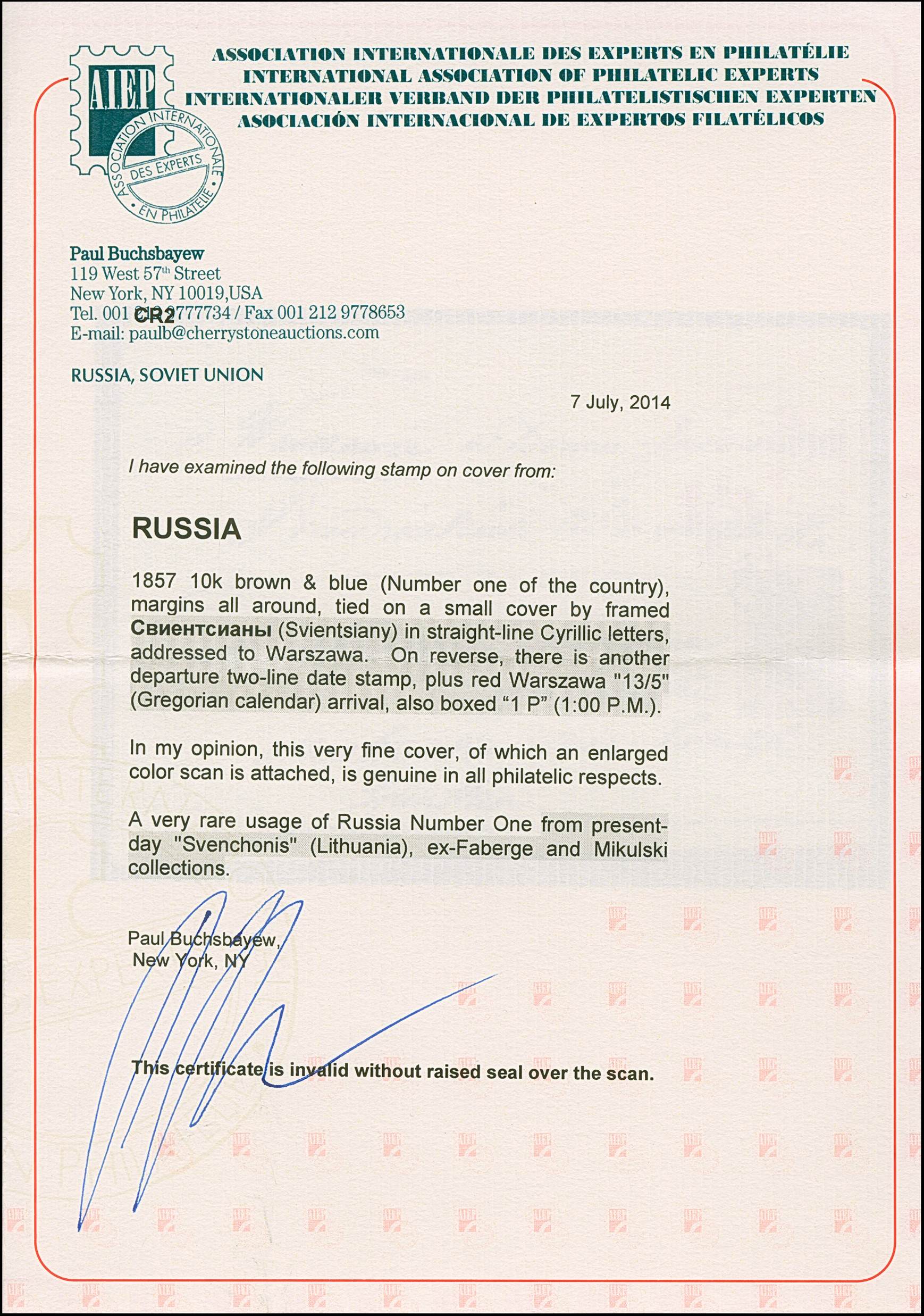 Provenance: A. Fabergé (Harmer 1939) Z.S.Mikulski (Cherrystone, 2006)