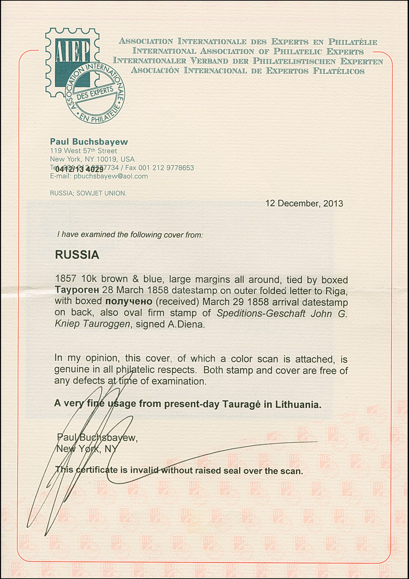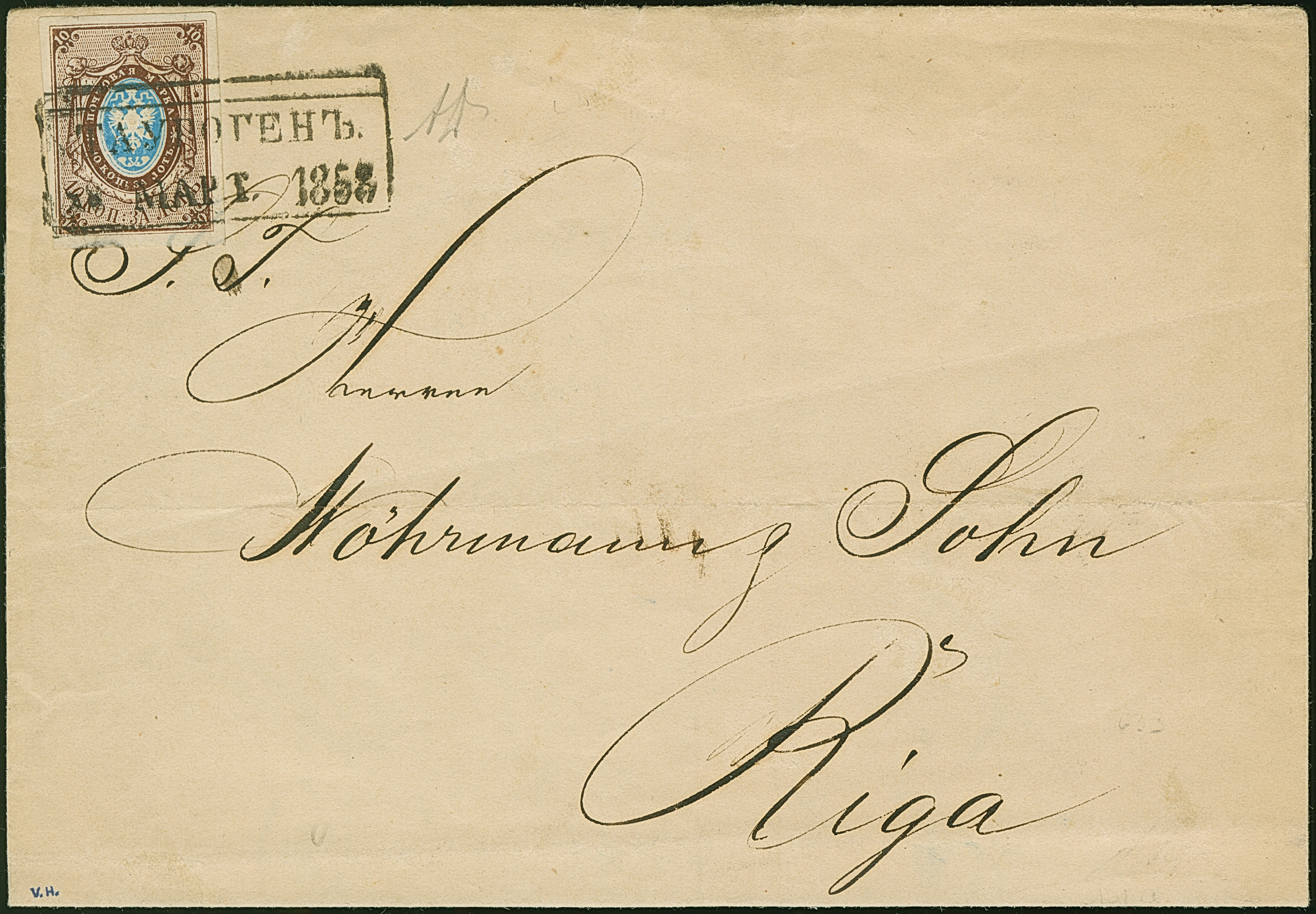 TAUROGGEN (Lithuania): 10 kopeck brown & blue, large margins, tied by boxed "TAUROGEN 28 MAR 1858" to lettersheet with reverse side oval handstamp "SPEDITIONS-GESCHÄFT JOHN G. KNIEP/TAUROGGEN", to Riga, with arrival mark. Supposed to origin from (most likely) German soil and forwarded. Just four similar entires with the Kniep handstamp have been recorded. Certificate Buchsbayew (2013)