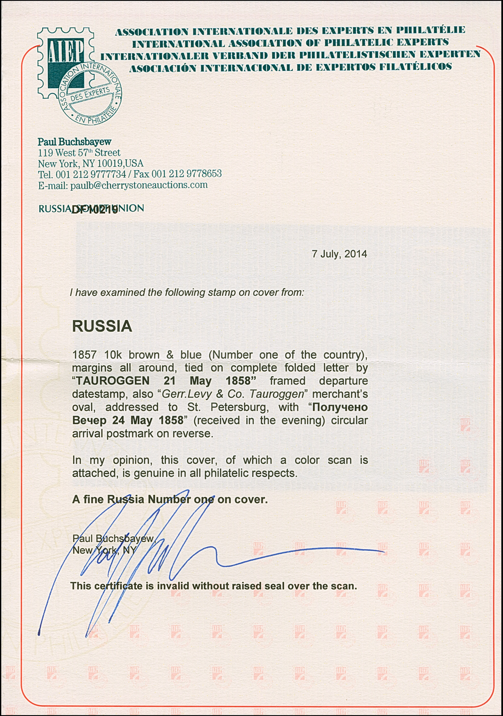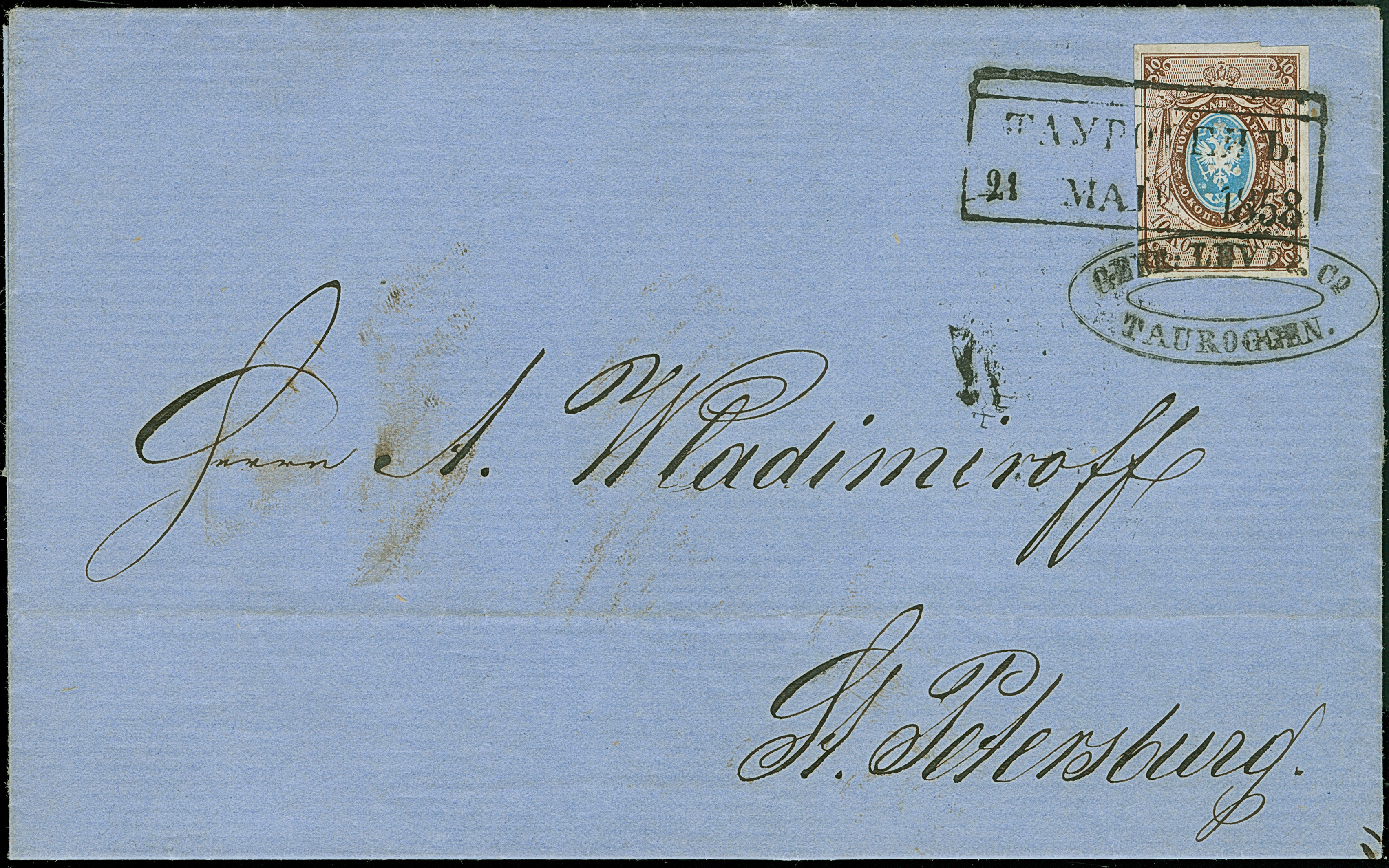 TAUROGGEN (Lithuania): 10 kopeck brown & blue, good to large margins, tied by boxed "TAUROGEN 21 MAY 1858" and oval sender's mark to lettersheet to St. Petersburg, with “Saint Petersburg 24 May 1858” arrival mark. Very fine and most attractive. Certificate Buchsbayew (2014)