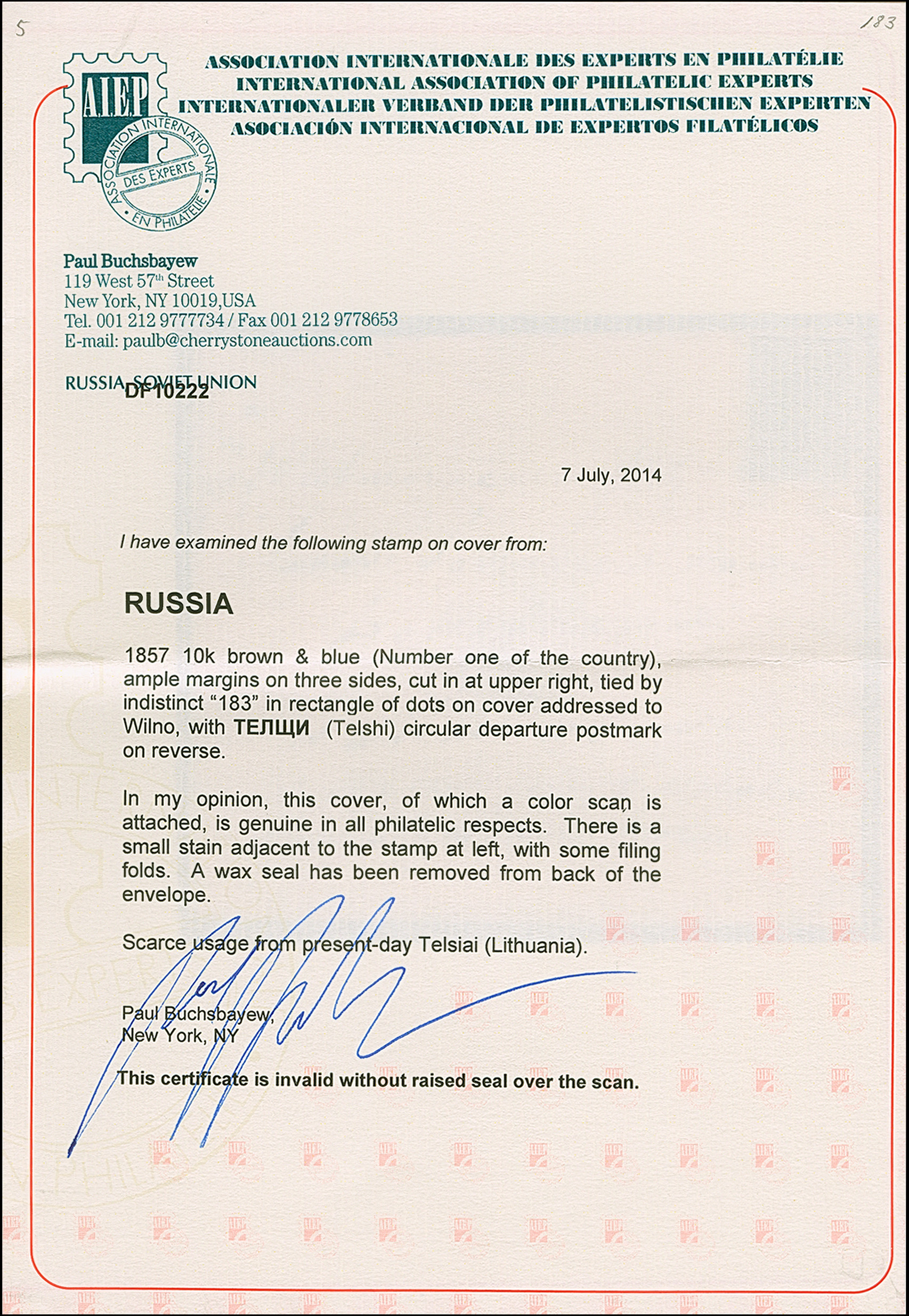 TELSHI (Lithuania): 10 kopeck brown & blue, slightly touched at upper right, otherwise good to large margins, tied by dotted rectangular "183" to envelope with matching dispatch c.d.s. on reverse, to Wilno (Vilnius). Tiny parts of ink removed in the lower left margin of the stamp, otherwise fine. Very rare; just 2 other No.1-entires have been recorded from Telshi. Certificate Buchsbayew (2014)