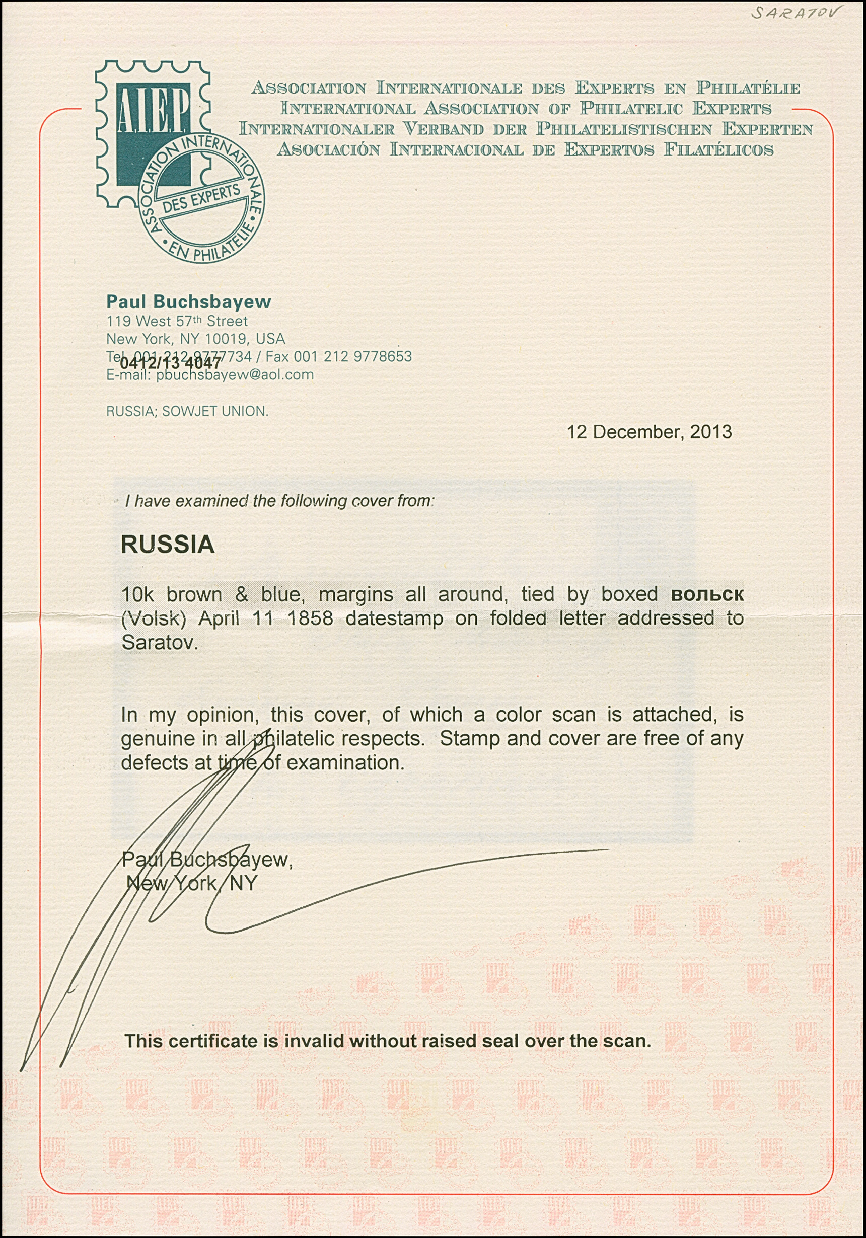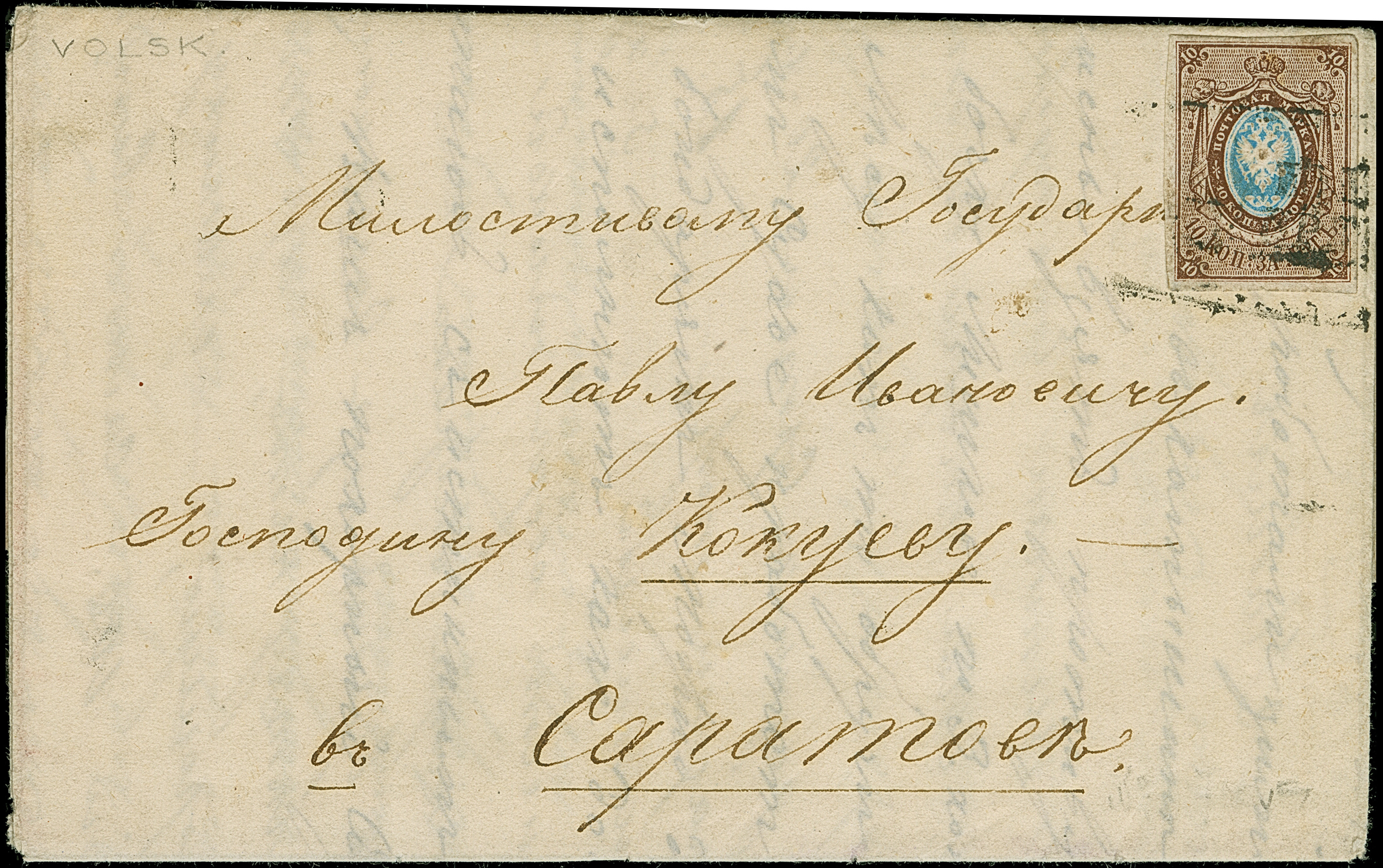 VOLSK: 10 kopeck brown & blue, good to large margins, tied by boxed handstamp to entire letter to Saratov. The stamp just a tiny trace of unfreshness at upper right, otherwise very fine. A very rare usage of the No.1; just one further entire has been recorded from this small town. Certificate Buchsbayew (2013)