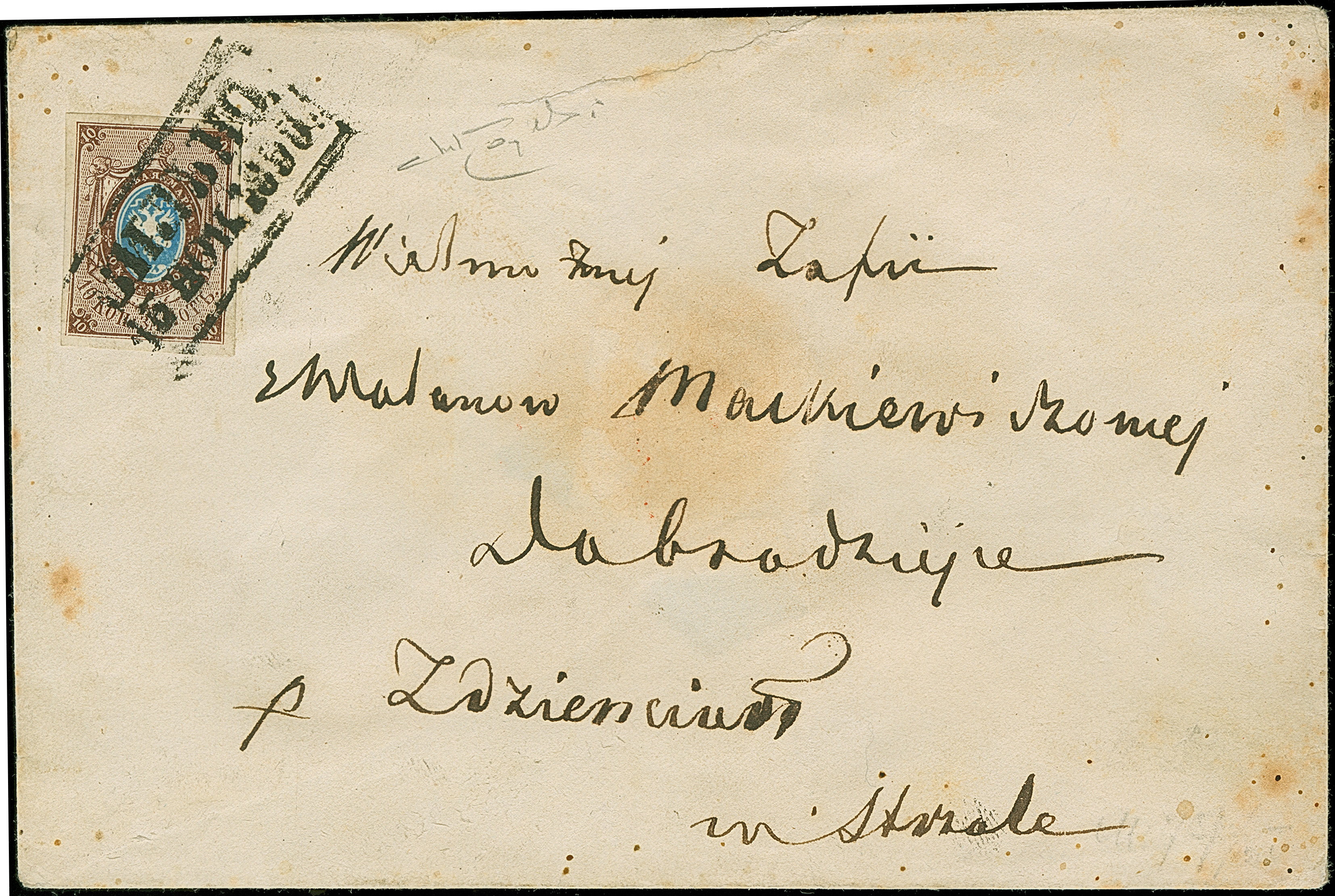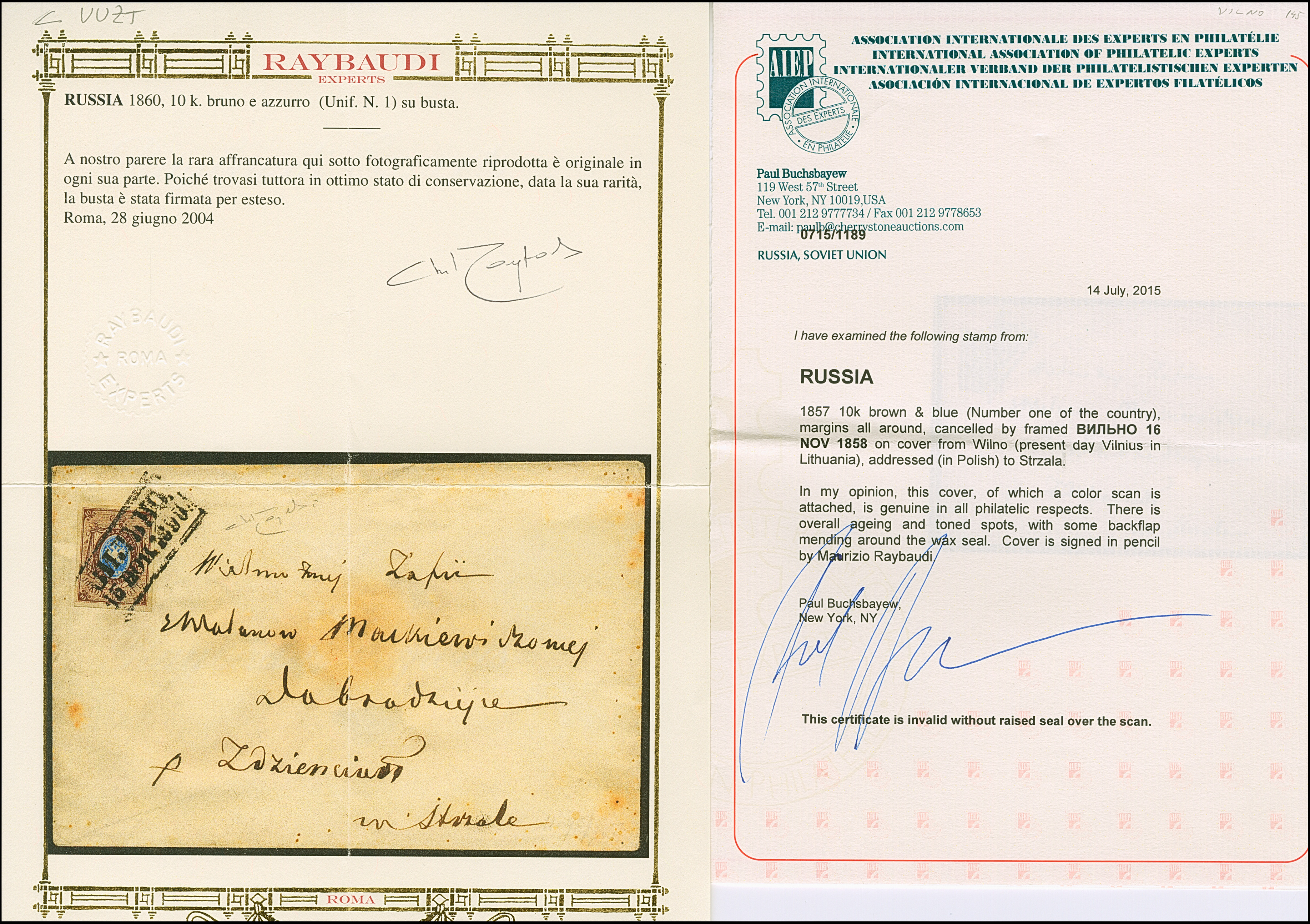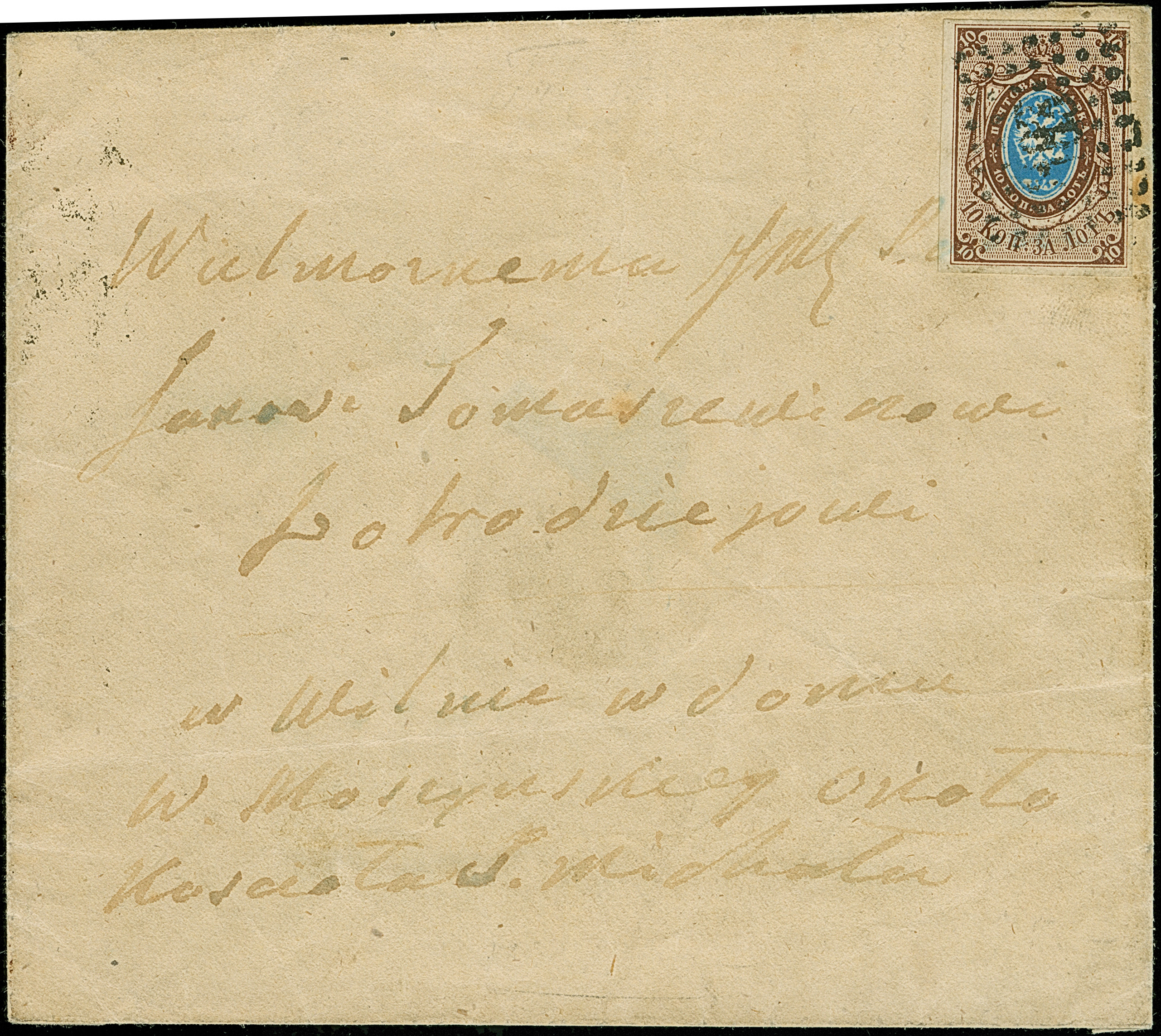 WILNO (Lithuania): 10 kopeck brown & blue, large margins, tied by boxed "WILNO 16 NOV.1858" to envelope to Strzala. Some overall ageing, otherwise very fine. Certificate Buchsbayew (2015)