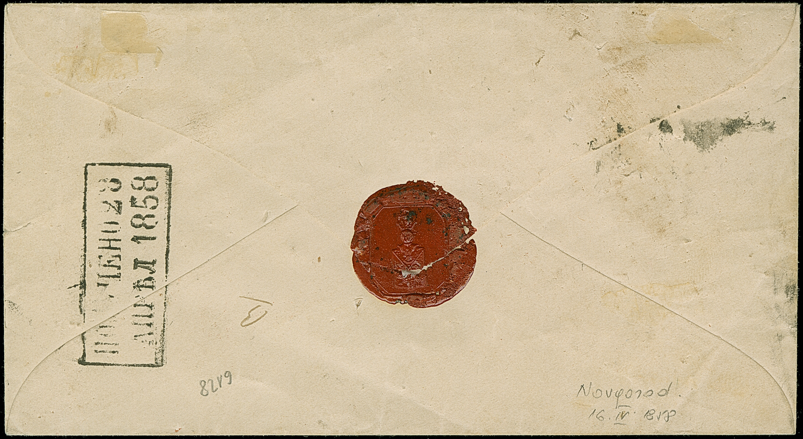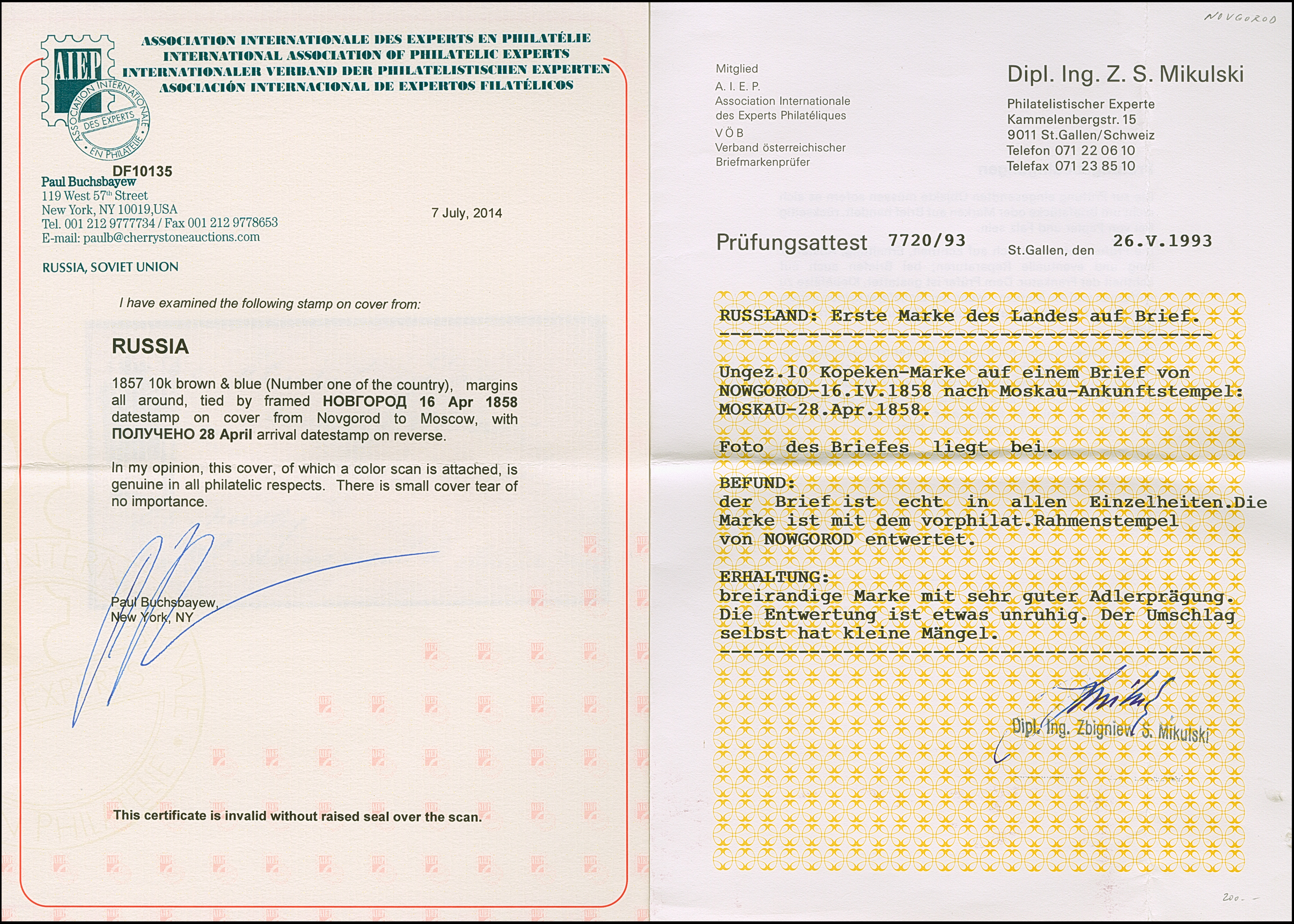 NOVGOROD: 10 kopeck brown & blue, good to large margins, tied by boxed pre-philatelic "NOVGOROD 16 APR"(1858) to envelope (small tear at right) to Moscow, with arrival mark. Very fine and rare; one of just 3 No.1-entires recorded from this city. Certificates Mikulski (1993) and Buchsbayew (2014)