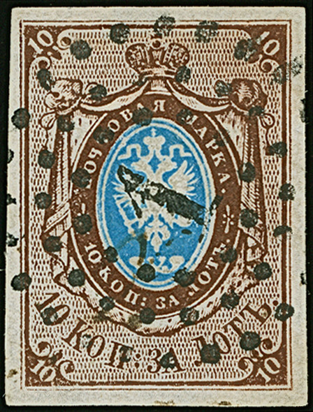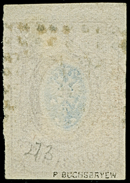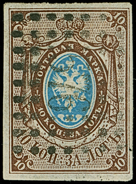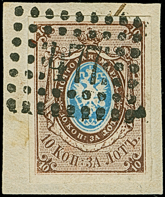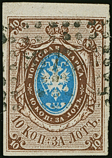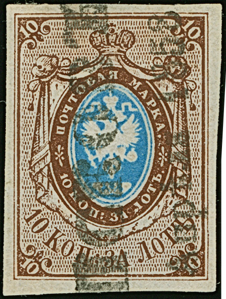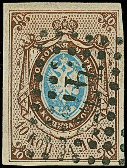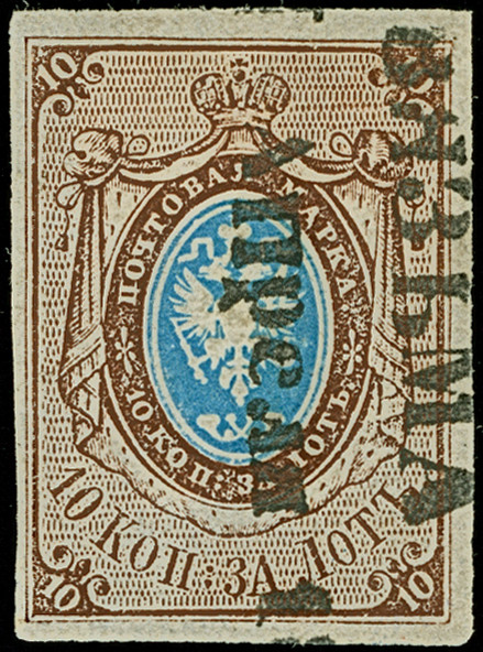 VASIL: 10 kopeck brown & blue, good to large margins, sheet margin at top, neatly cancelled by central dotted rectangular "273". Very fine. Signed Buchsbayew