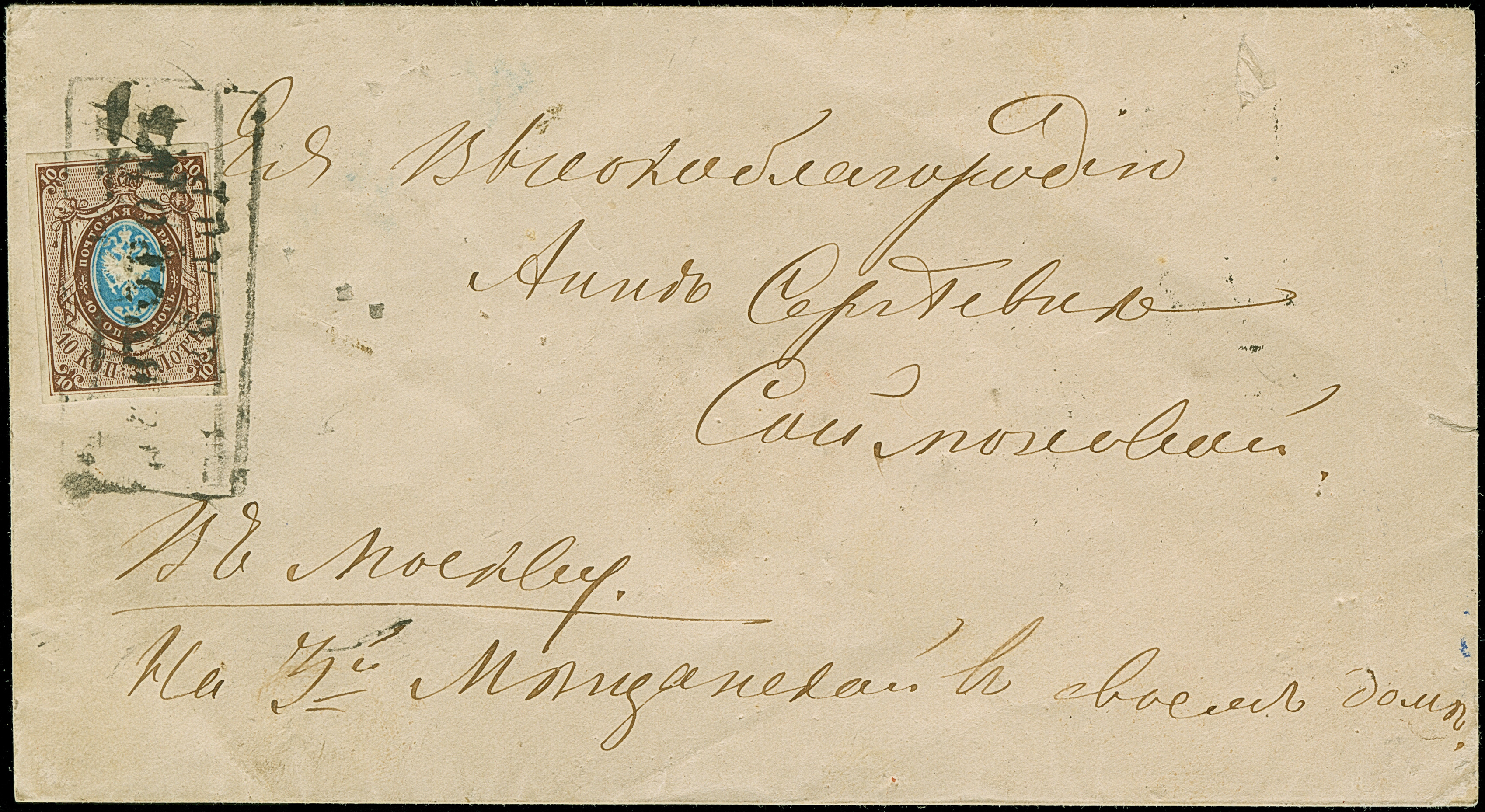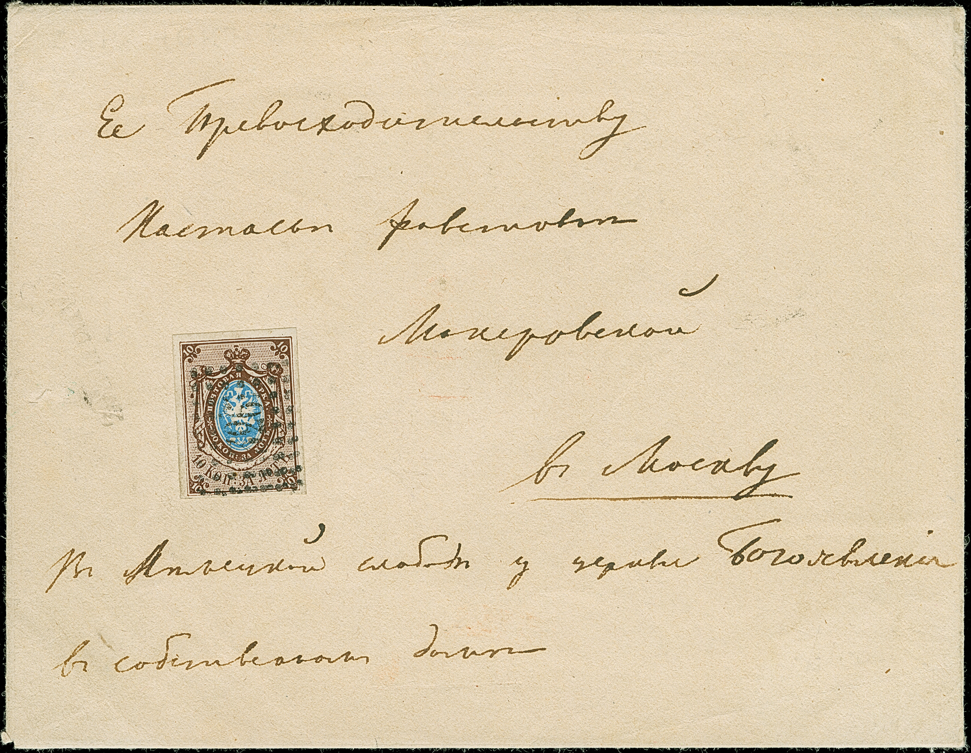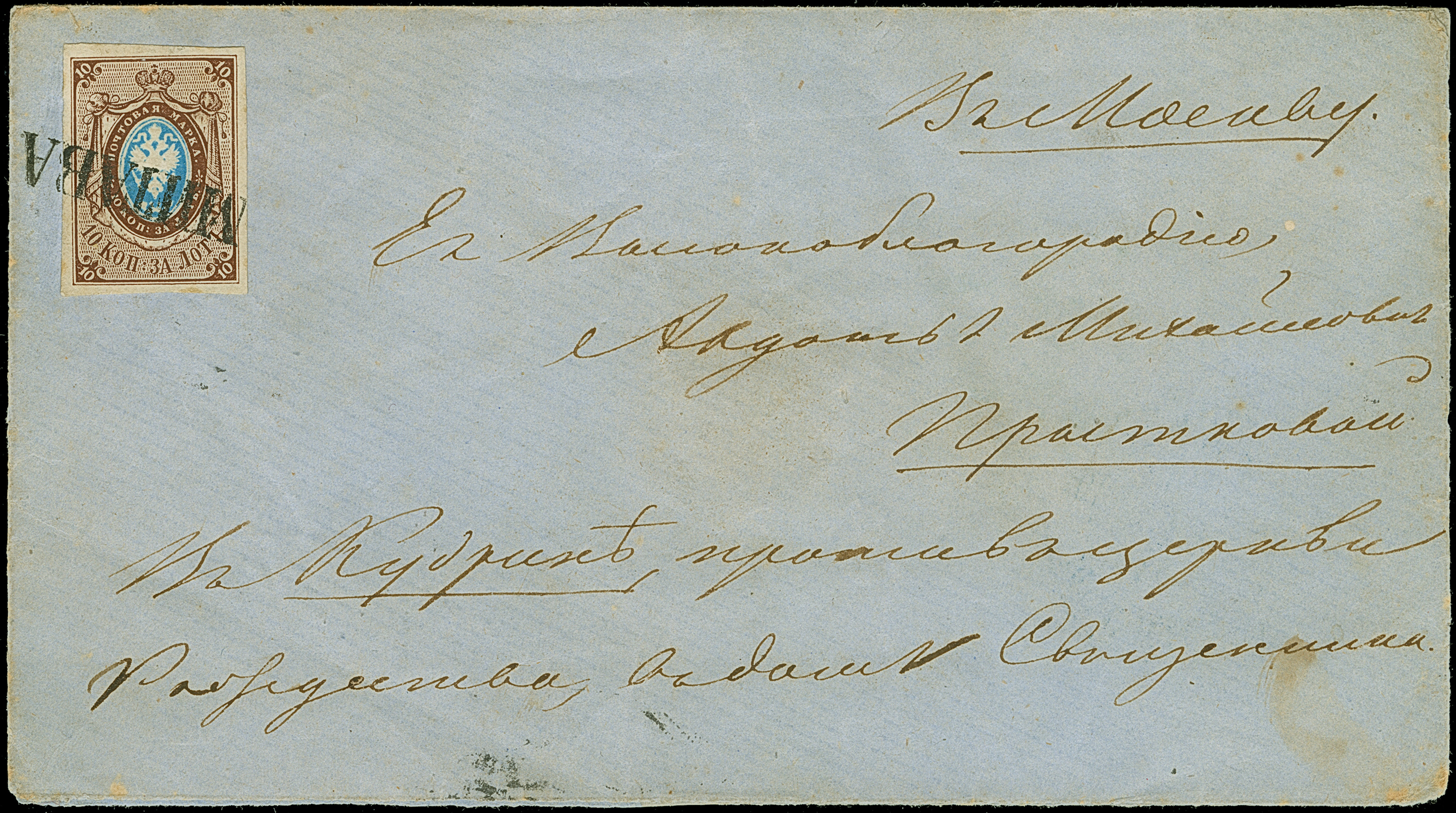 PUCHEZHSKY POSAD: 10 kopeck brown & blue, nice even margins, tied by complete and clear strike of pre-philatelic double line to envelope to Moscow. Very fine and rare; the only recorded entire from this small village. Certificate Buchsbayew (2013)