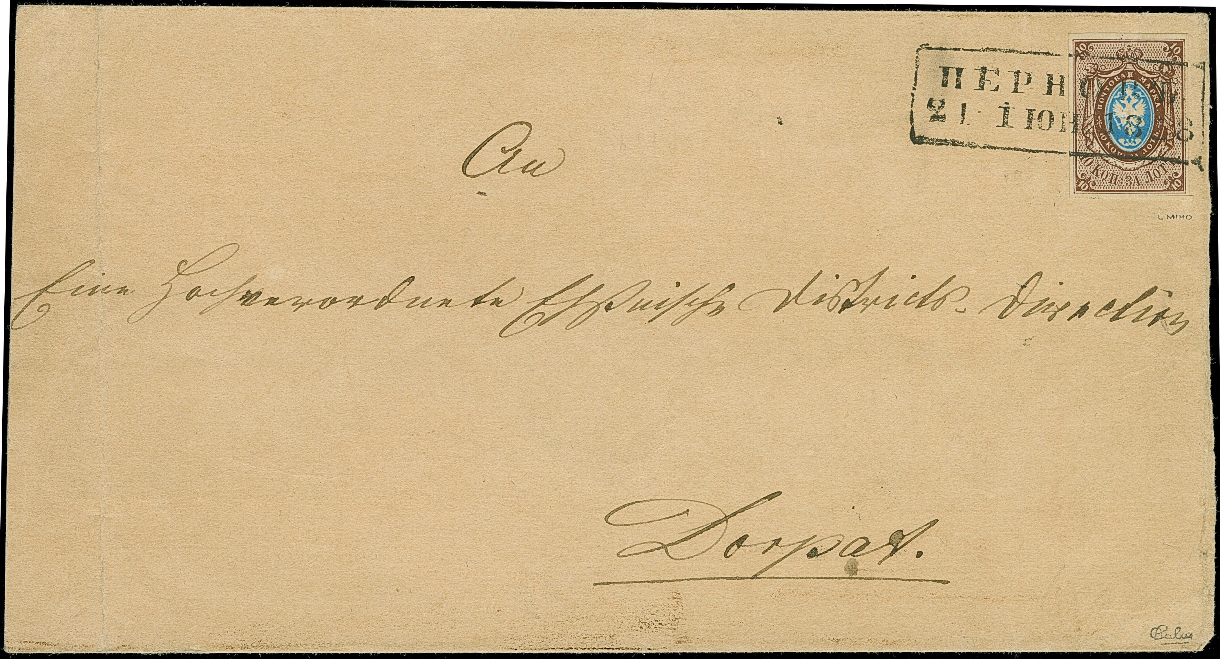 PERNAU (Estonia): 10 kopeck brown and blue, good to large margins, tied by clear boxed "PERNOV 20 MAI 1858" to lettersheet (2 side flaps missing) to Dorpat, with arrival mark. Very fine and fresh. The only recorded cover with this cancellation. Certificate Buchsbayew (2013)
