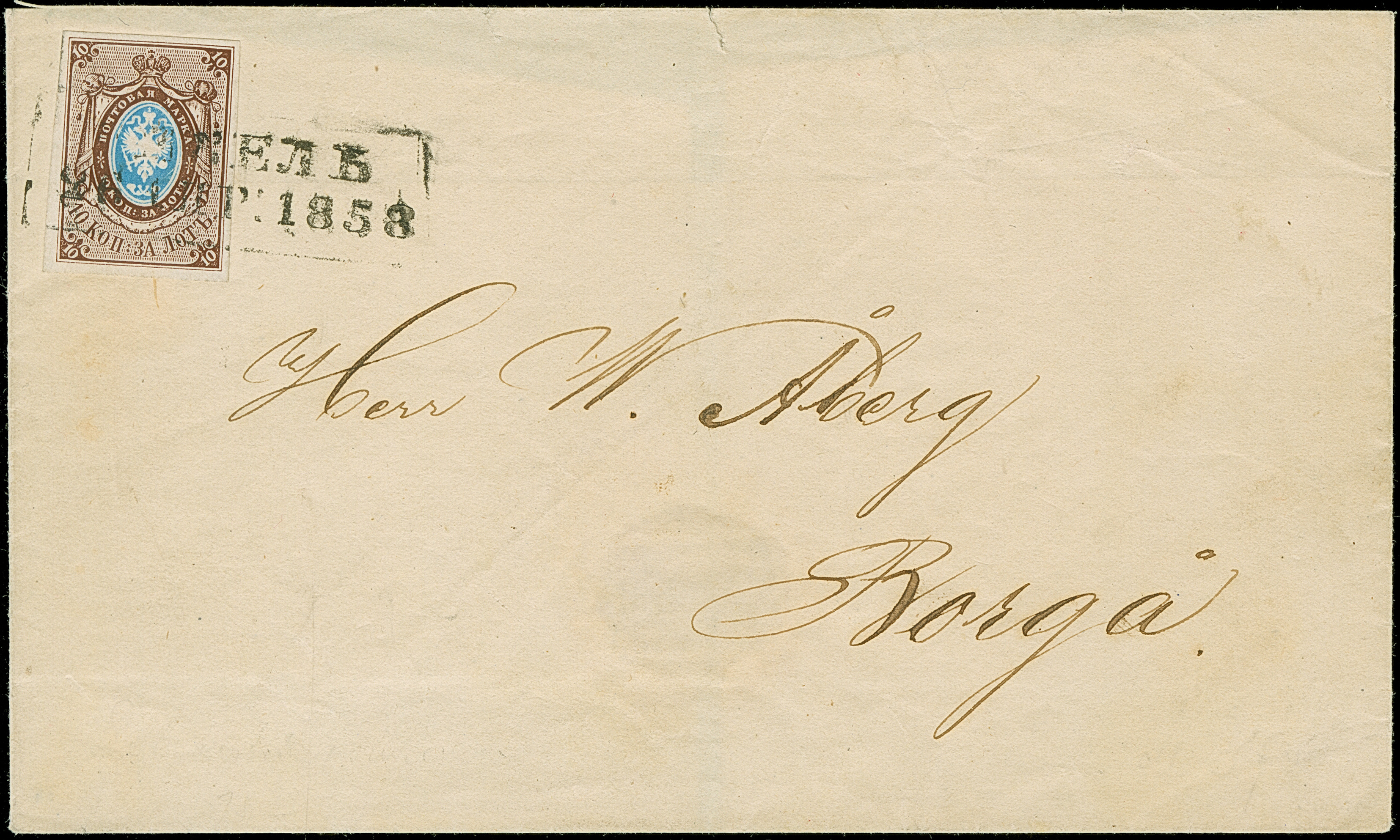REVAL (Estonia): 10 kopeck brown & blue, nice large even margins, tied by boxed pre-philatelic "REVAL 26 APR. 1858" to letter sheet to Borga in Finland. Very fine and exceedingly rare. Certificate Buchsbayew (2014)
