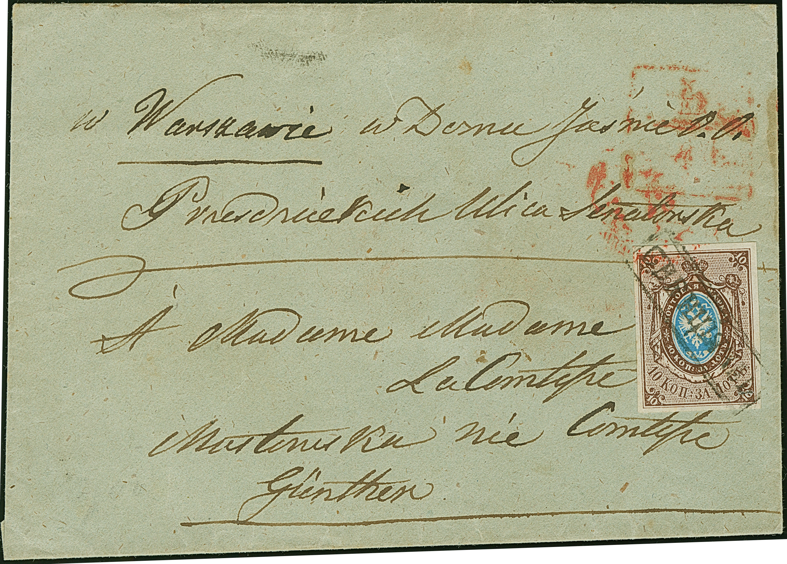 WILNO (Lithuania): 10 kopeck brown & blue, ample to large margins, tied by dotted circle "5" to small cover to Warzaw, with with matching despatch mark and both red arrival mark and boxed "1/P". Very rare. Certificate Buchsbayew (2014)