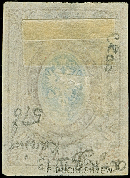 POGAR: 10 kopeck brown & blue, good to large margins, used by light but clear strike of dotted rectangular “576”. Very fine. Signed Buchsbayew.