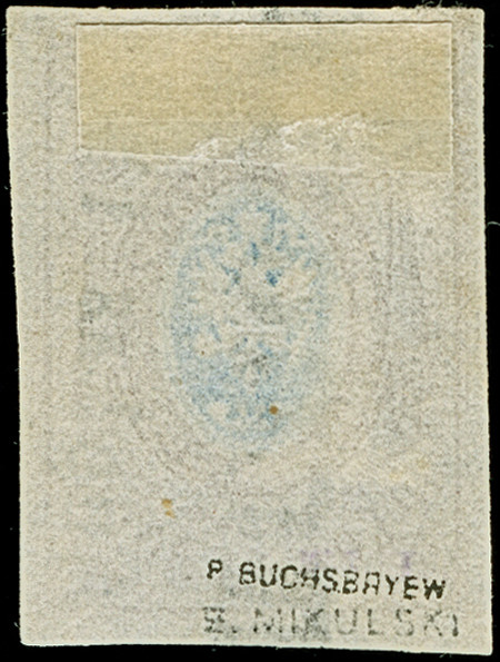 OLGOPOL (Ukraine): 10 kopeck brown & blue, large even margins, cancelled by complete and quite clear strike of pre-philatelic boxed handstamp. Very fine and rare. Signed Buchsbayew