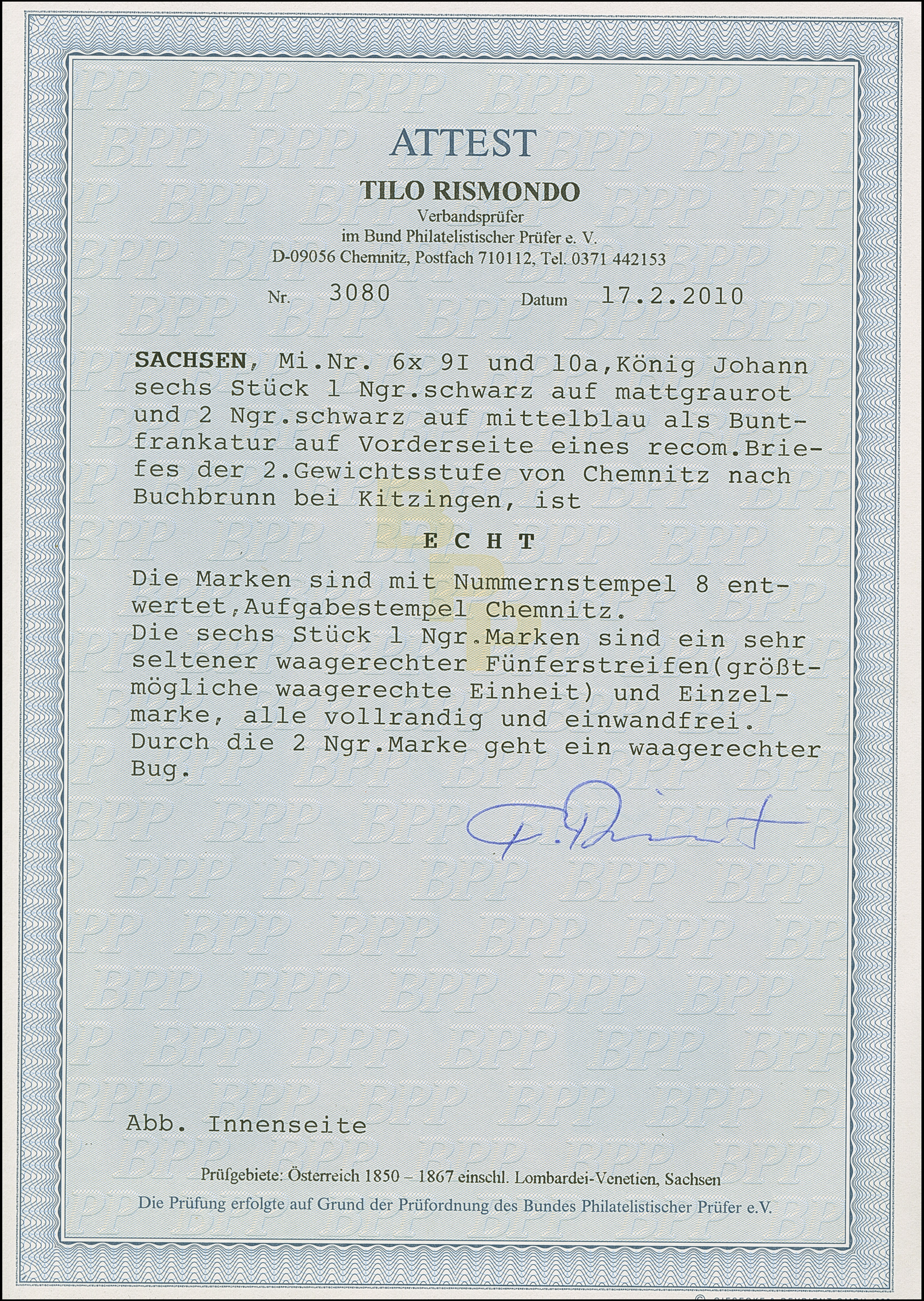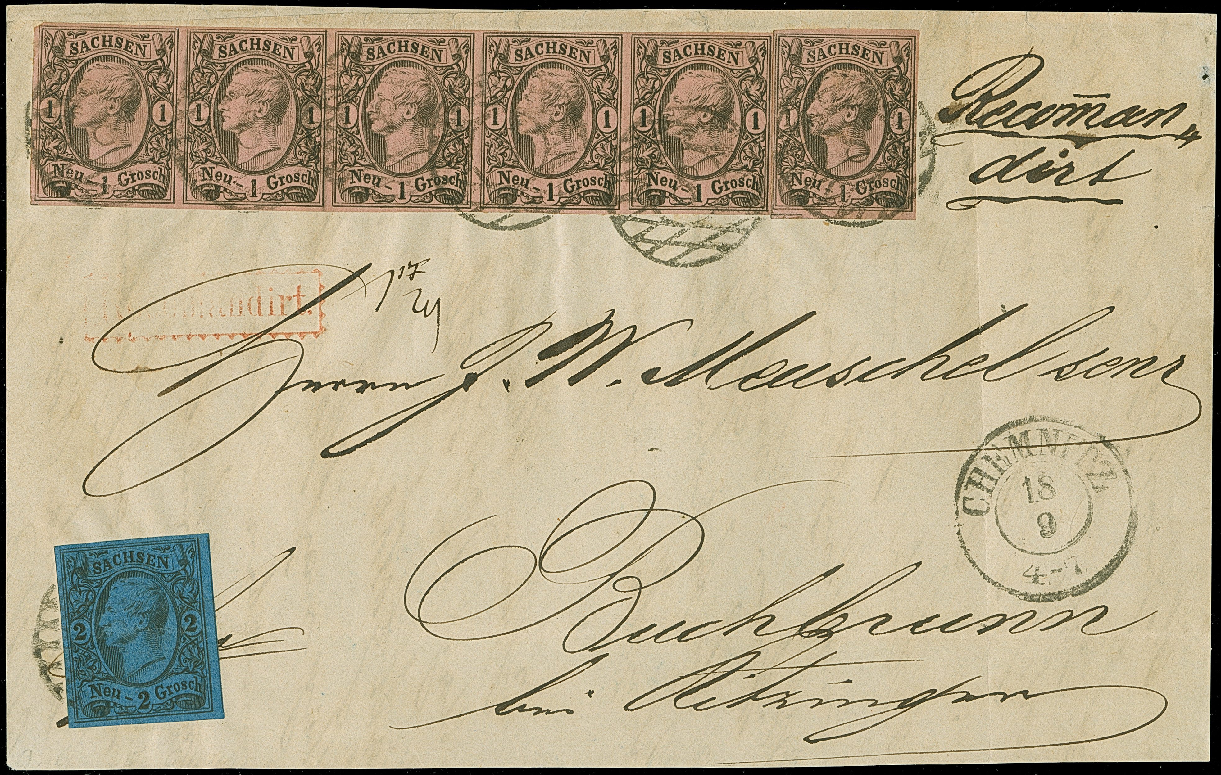 1 Ngr. auf mattgraurot im waagerechten 5er-Streifen mit weiterer 1 Ngr. und 2 Ngr. auf blau, alle farbfrisch und voll- bis breitrandig, je mit Nr. "8" und sauber nebengesetztem Doppelkreisstempel "CHEMNITZ 18 9" auf recommandirter Briefvorderseite der 2.Gewichtsstufe nach Buchbrunn bei Kitzingen in Bayern. Durch die 2 Ngr. verläuft ein ganz unauffälliger waagerechter Briefbug, sonst einwandfrei. Größtmögliche Streifeneinheit dieser Marke und auf Ganzstück nur eine weitere registriert. Fotoattest Rismondo BPP (2010)