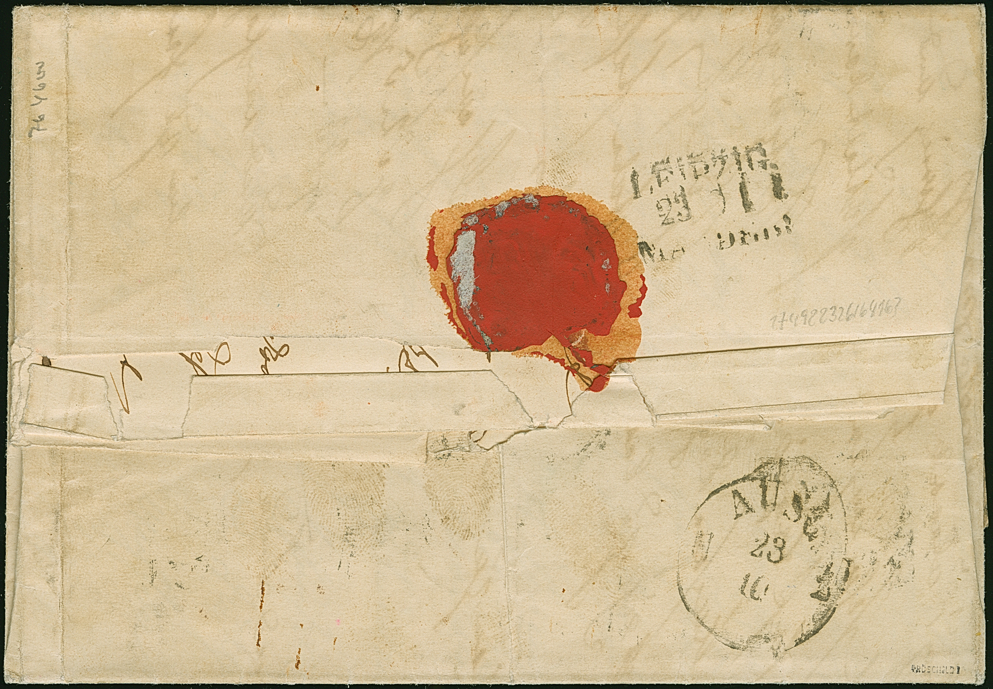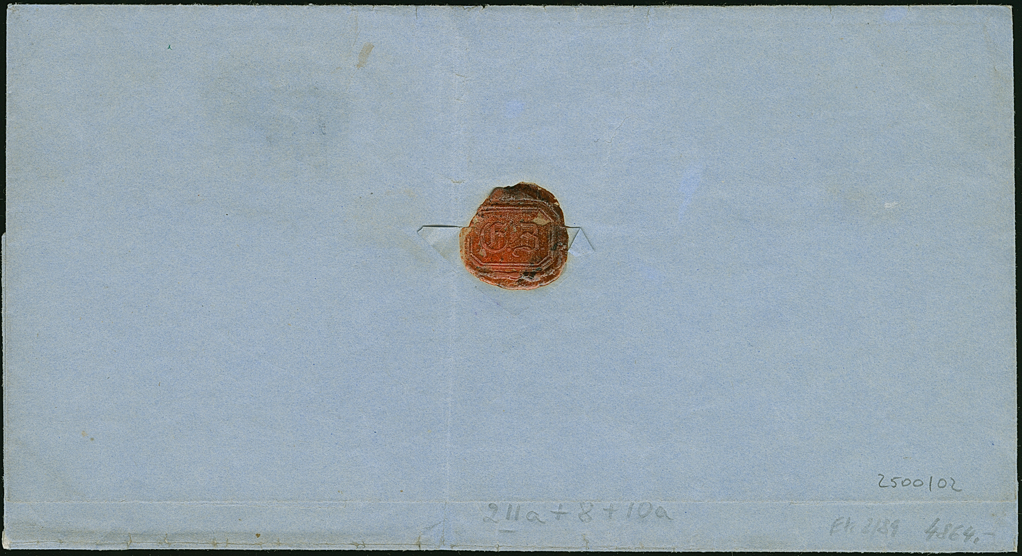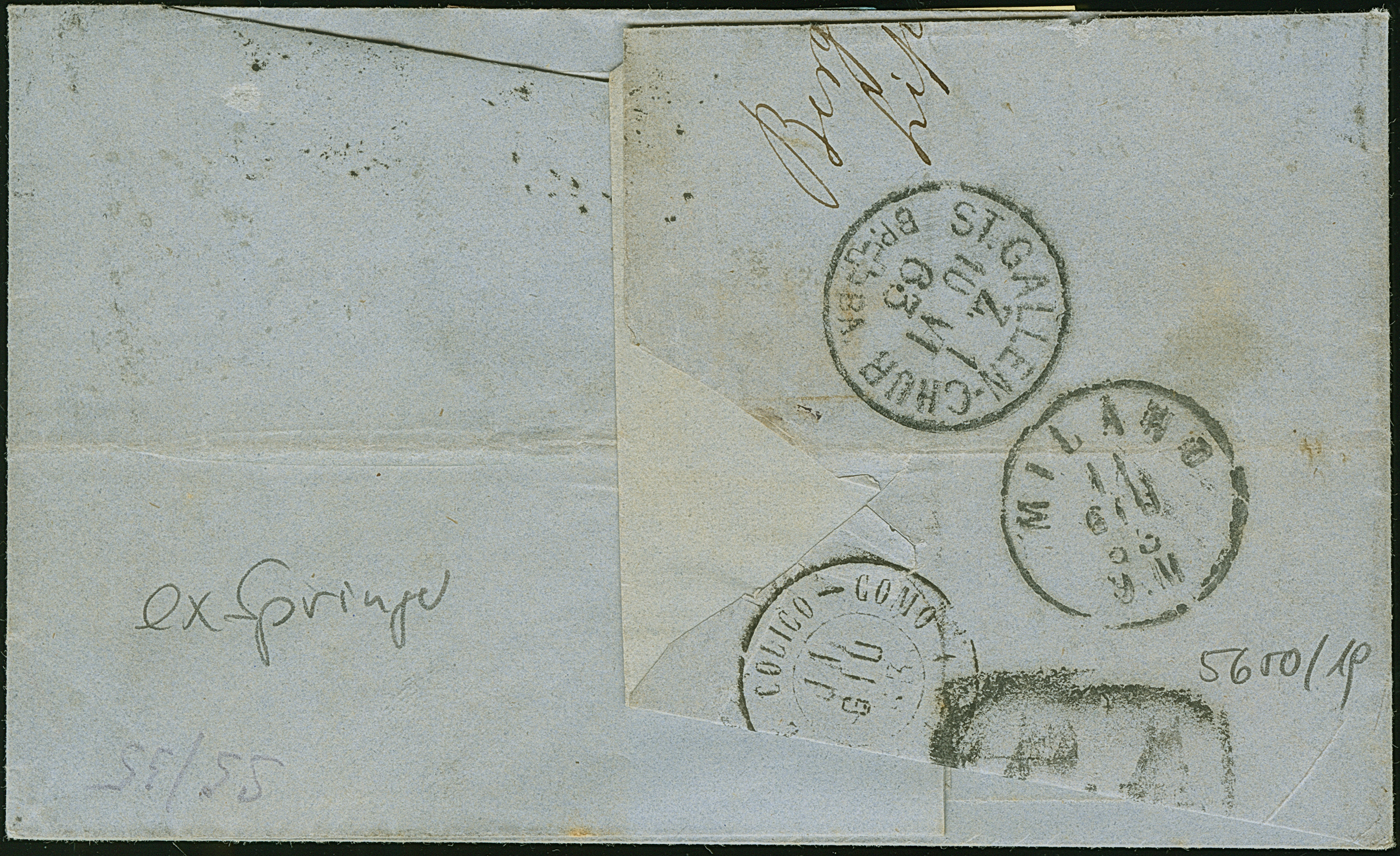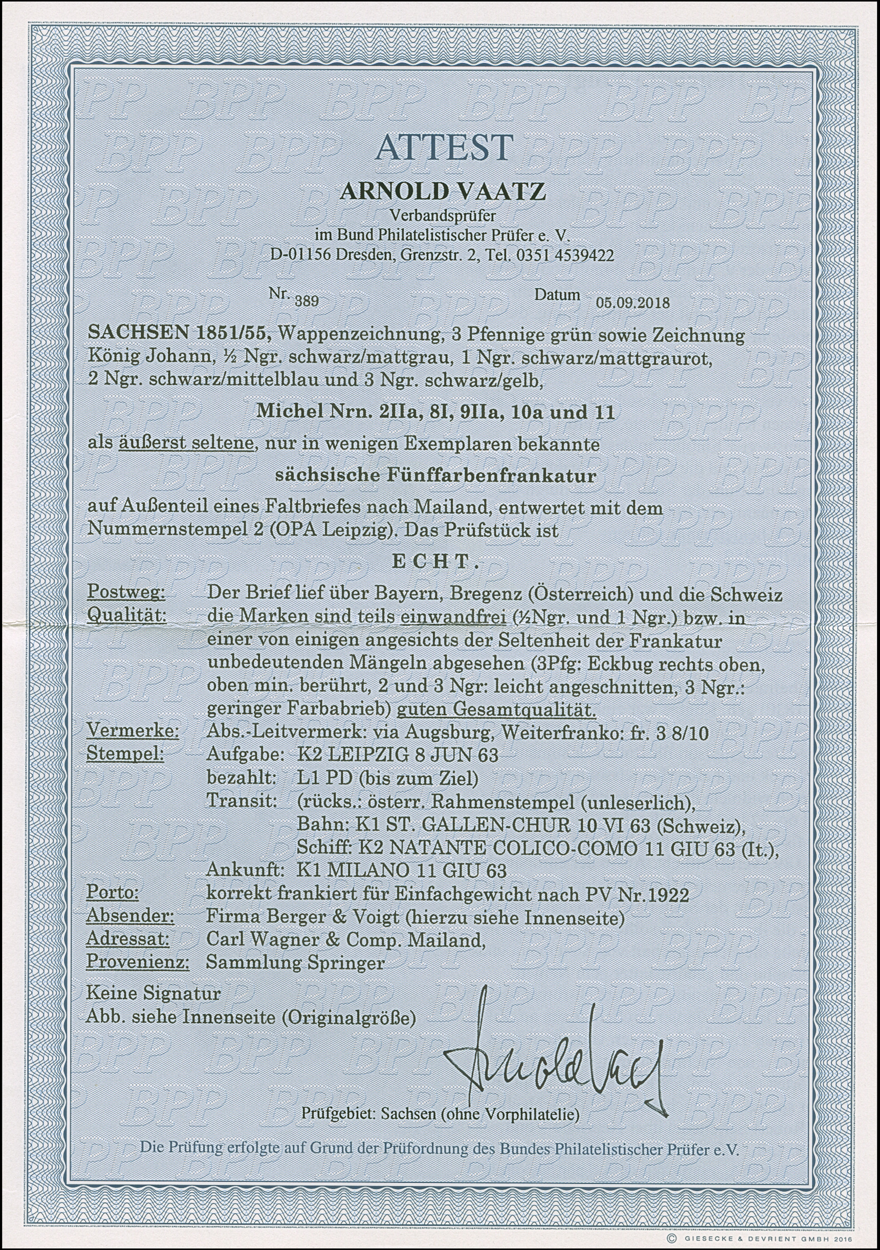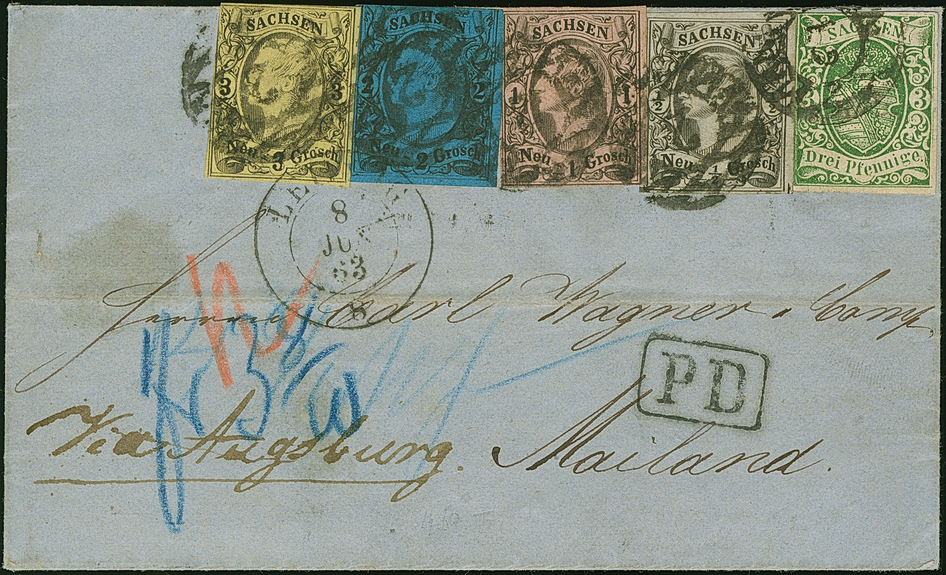 ½ Ngr. auf mattgrau, 1 Ngr. auf graurot, 2 Ngr. auf blau und 3 Ngr. auf gelb und 1851/63, 3 Pfg. grün, als Streifen geklebt mit Nr. "2" und teils übergehendem Doppelkreisstempel "LEIPZIG 8 JUN 63" auf Briefhülle der Seidenhandlung Berger & Voigt über die Schweiz nach Mailand, Königreich Italien, mit rückseitigem Schweizer Bahnpoststempel "ST.GALLEN-CHUR" sowie italienischem Schiffspoststempel "NATANTE COLICO-COMO" und Ankunftsstempel. Das Porto setzt sich zusammen aus 3 Ngr. Vereinsporto, 2 Ngr. schweizer Transit und 1 3/4 Ngr. italienischem Porto. Die Frankatur befindet sich in guter Bedarfserhaltung, teils leichte Schnittmängel, die 3 Pfg. mit leichtem Eckbug und 3 Neugroschen geringer Farbabrieb. Ein attraktiver Brief von größter Seltenheit; es sind nur 2 weitere 5-Farben-Frankaturen der Johann-Ausgabe registriert. Fotoattest Vaatz BPP (2018)