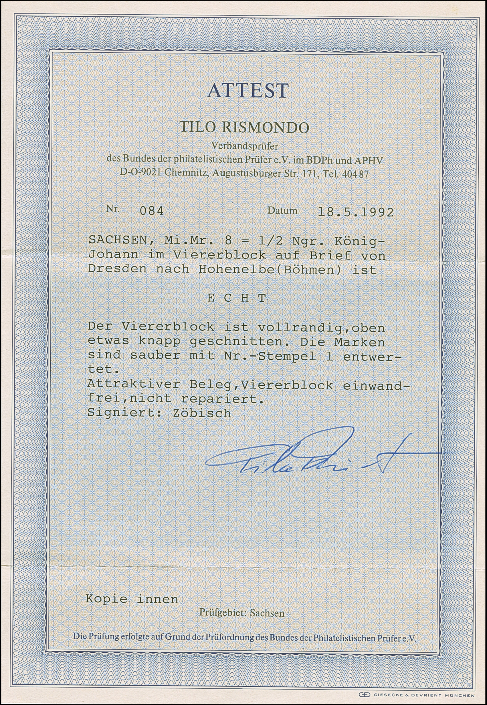 ½ Ngr. auf grau im Viererblock, noch voll- bis breitrandig (eventuell winzig berührt), mit Nr. "1" und sauber nebengesetztem Doppelkreisstempel "DRESDEN 16/VII 62" auf Briefkuvert nach Hohenelbe in Böhmen. Das Kuvert leichte Beförderungsspuren und Faltungen außerhalb der Frankatur, sonst einwandfrei. Eine auf Brief sehr seltene Einheit ; Profi hat nur eine weitere Viererblock-Frankatur dieser Marke registriert. Fotoattest Rismondo BPP (1992)