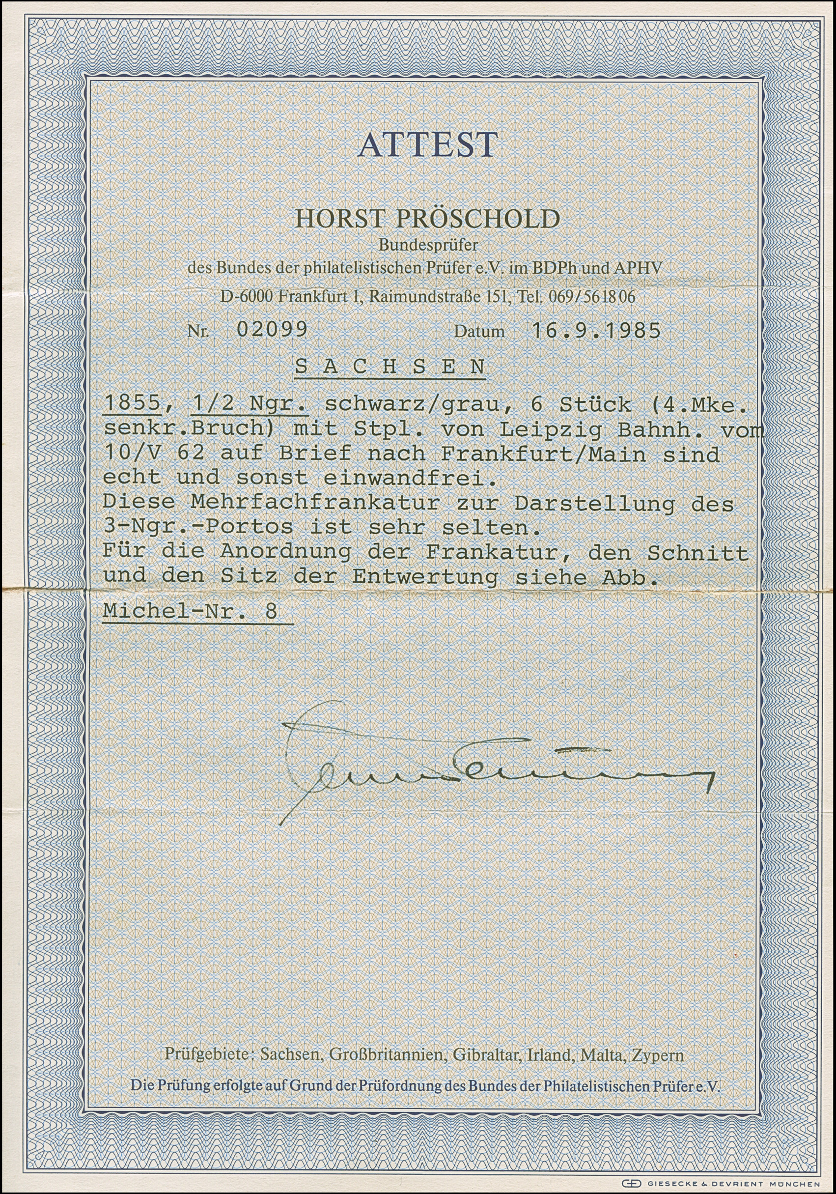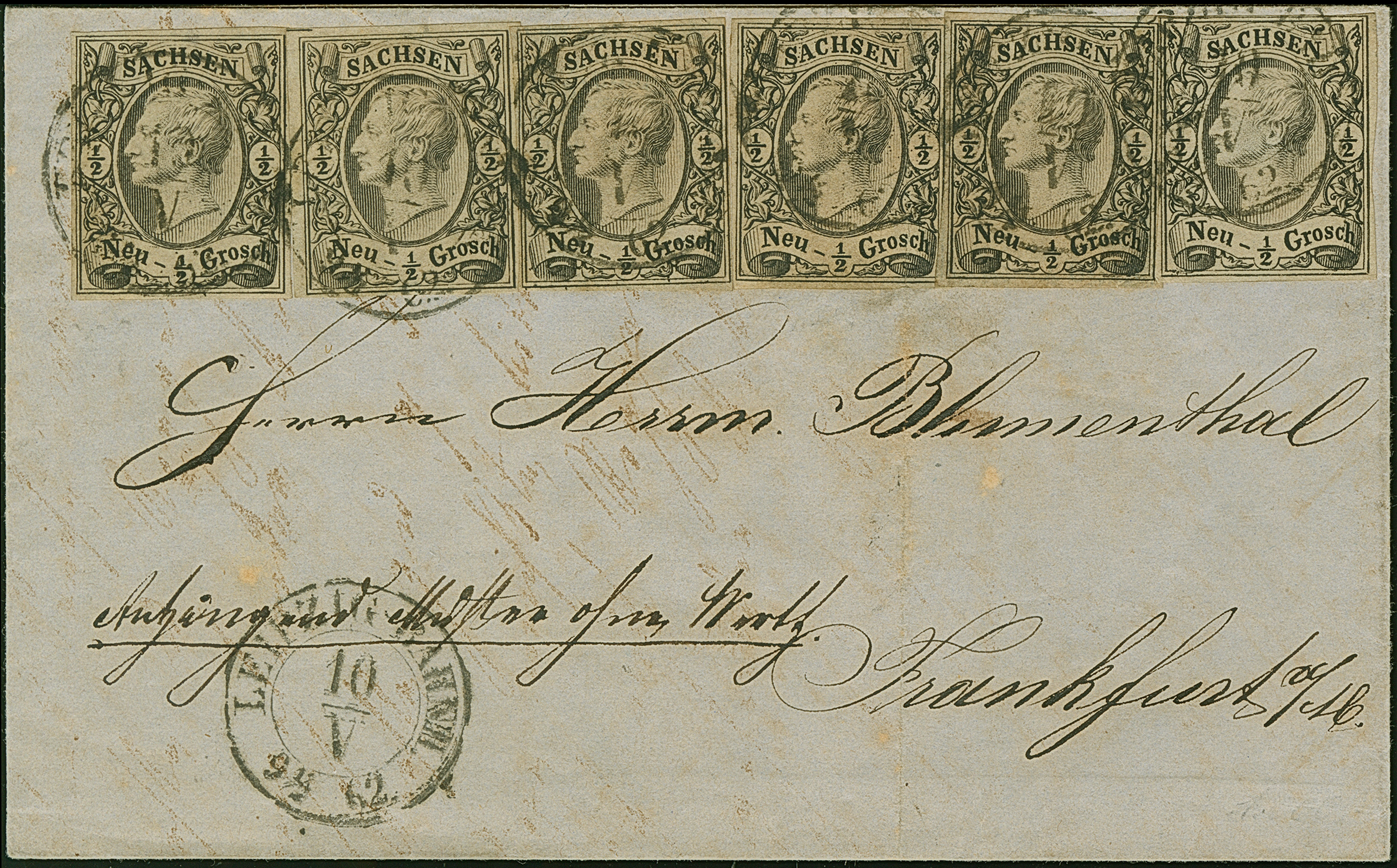 ½ Ngr. auf grau, 6 Einzelwerte, soweit sichtbar alle voll- bis breitrandig, mit auf- und nebengesetztem Doppelkreisstempel "LEIPZIG BAHNH. 10/V 62" auf Faltbrief mit handschriftlichem Vermerk "Anhängend Muster ohne Werth", nach Frankfurt am Main. Ein Wert mit unauffälligem senkrechten Briefbug, sonst gute Erhaltung. Eine in dieser Form einmaliger Mehrfachfrankatur. Fotoattest Pröschold BPP (1985)