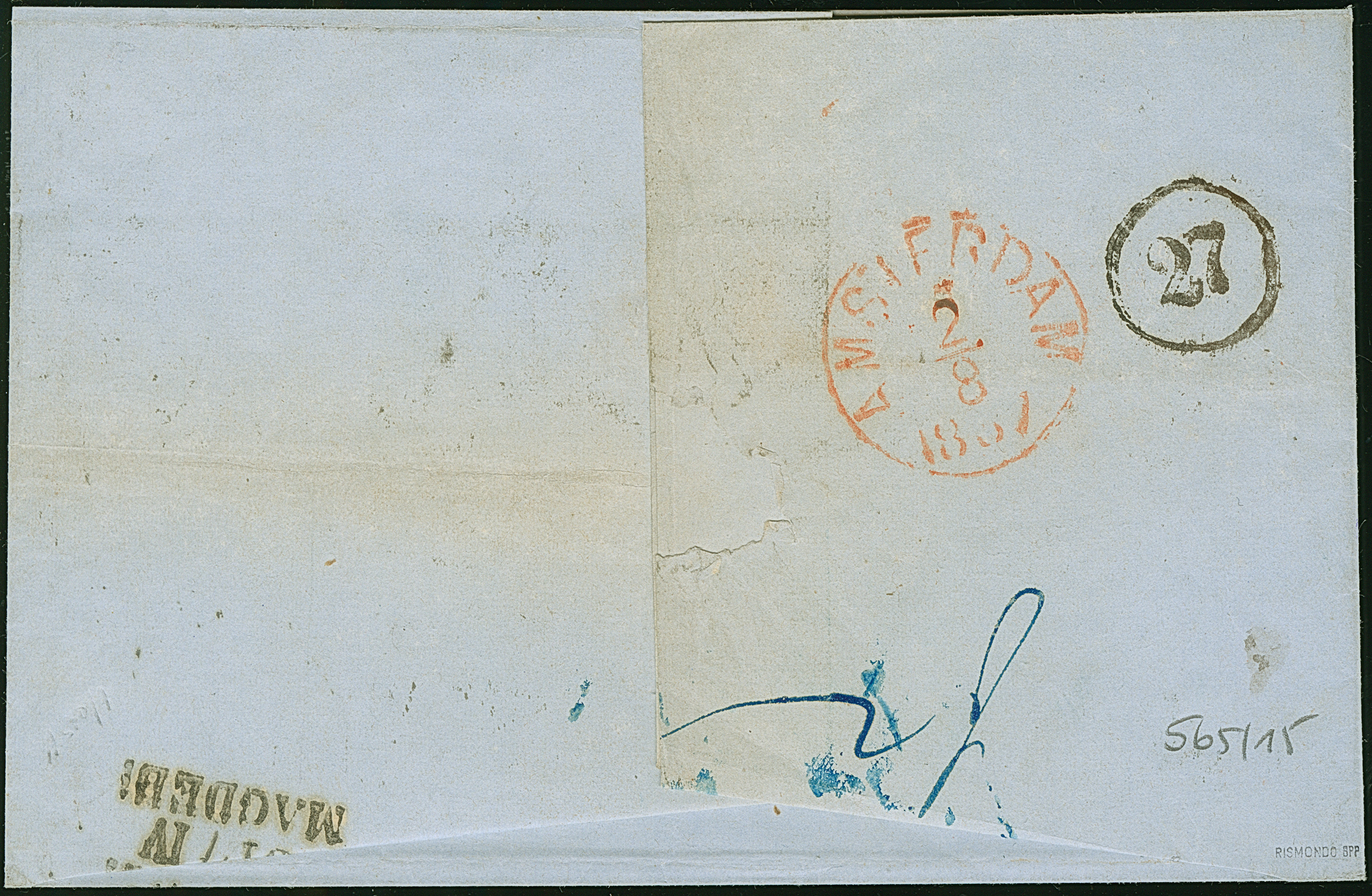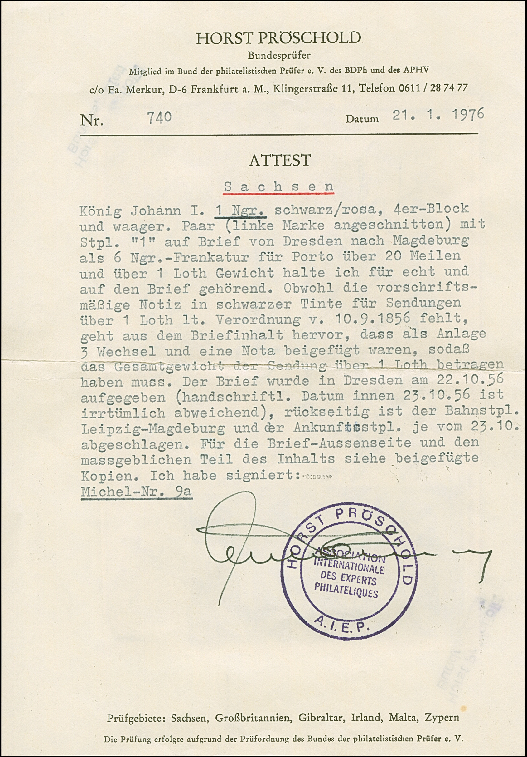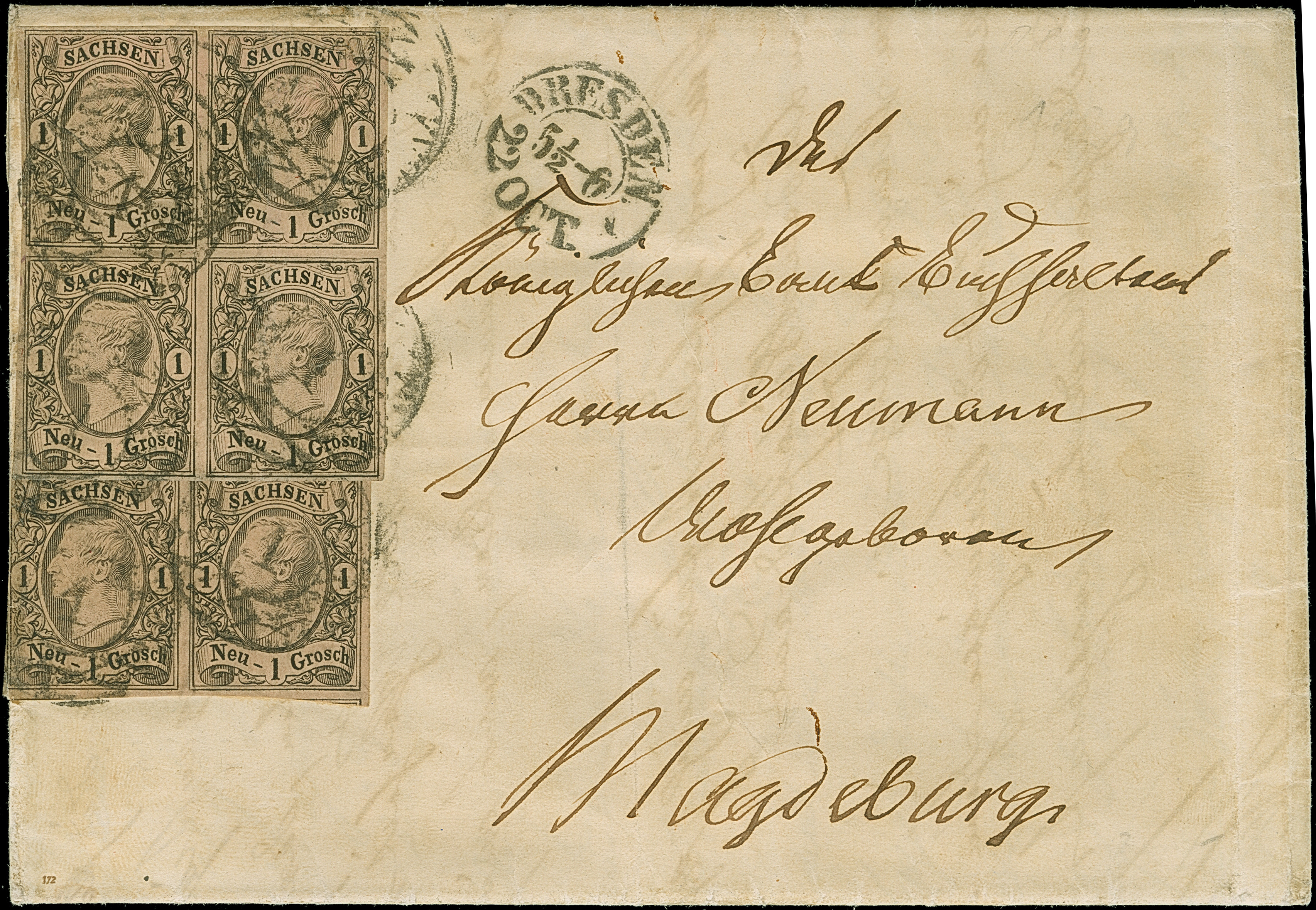 1 Ngr. auf mattgraurot, Type I, 4er-Block und waagerechtes Paar, mit Nr. "1" und nebengesetztem Doppelkreisstempel "DRESDEN 22 OCT." (1856) auf Faltbrief der 2. Gewichtsstufe nach Magdeburg. Der Oberrand des 4er-Blocks ist ergänzt, die linke Marke des Paares durch Randklebung fehlerhaft. Größte registrierte Mehrfachfrankatur dieser Marke und einziger von PROFI registrierter Viererblock der Type I auf Brief. Attest Pröschold BPP (1976)
