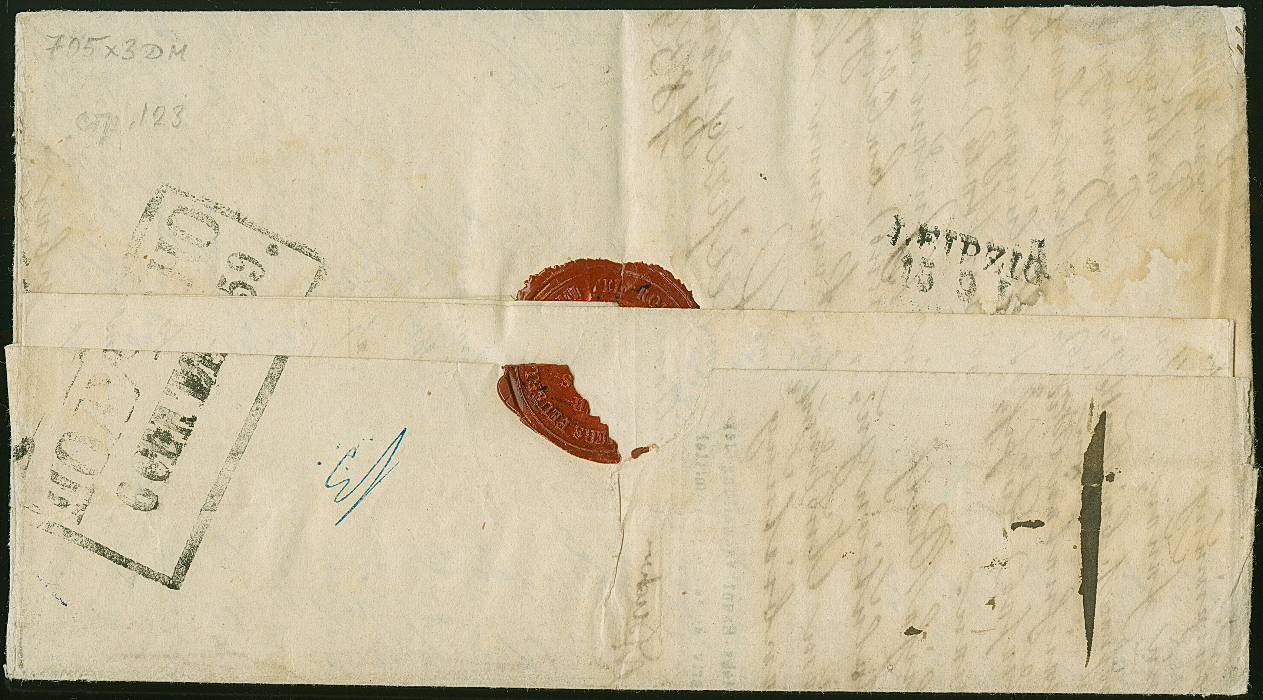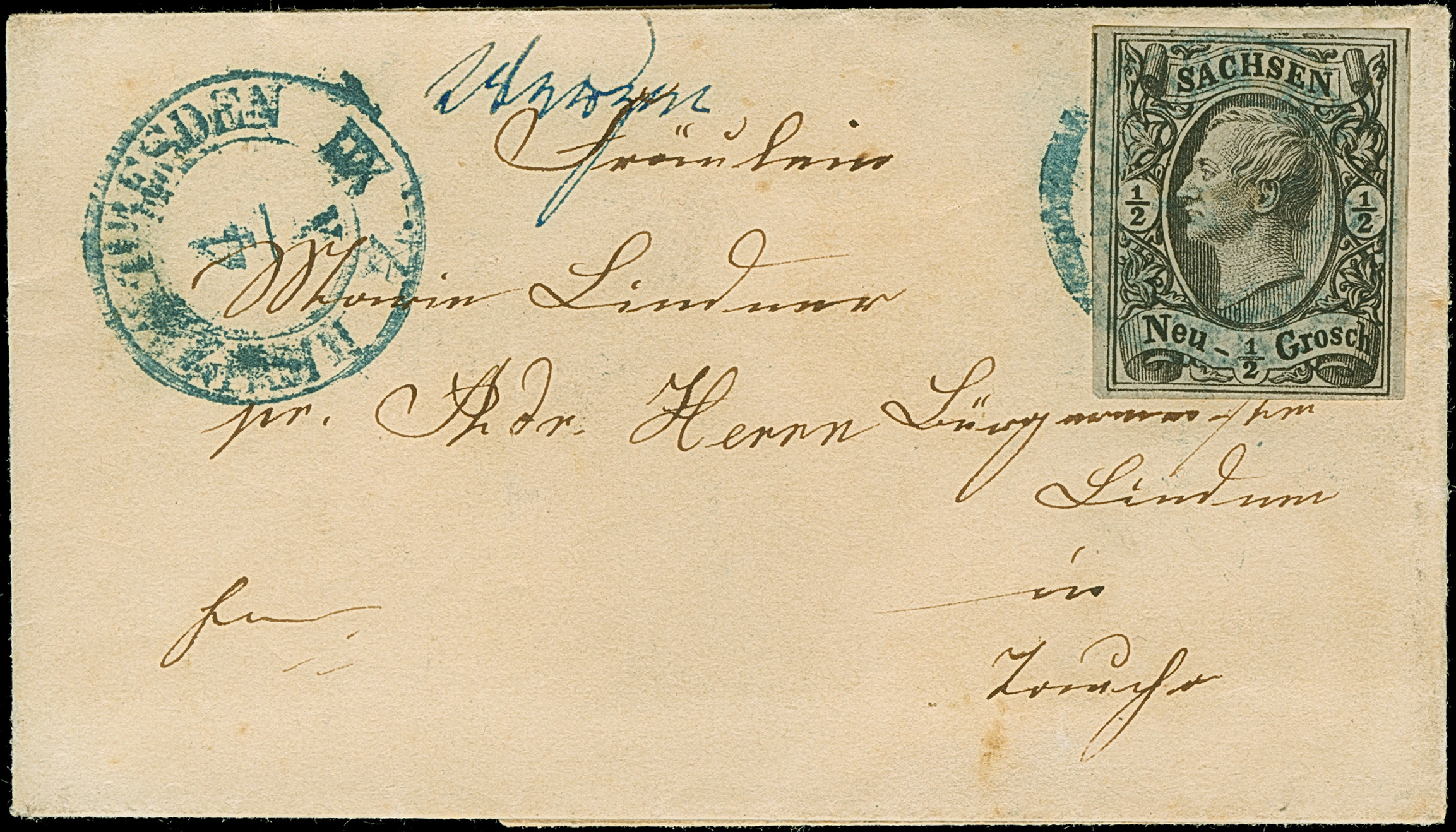 ½ Ngr. auf grau, voll- bis breitrandig, mit auf- und nebengesetztem blauen Bahnpost-DKr. "LEIPZIG-DRESDEN Z. XII 4/X." Auf kleiner Briefhülle mit handschriftlichem Aufgabevermerk "Wurzen". In blau bei Milde nicht gelistet. Sehr schönes Stück.