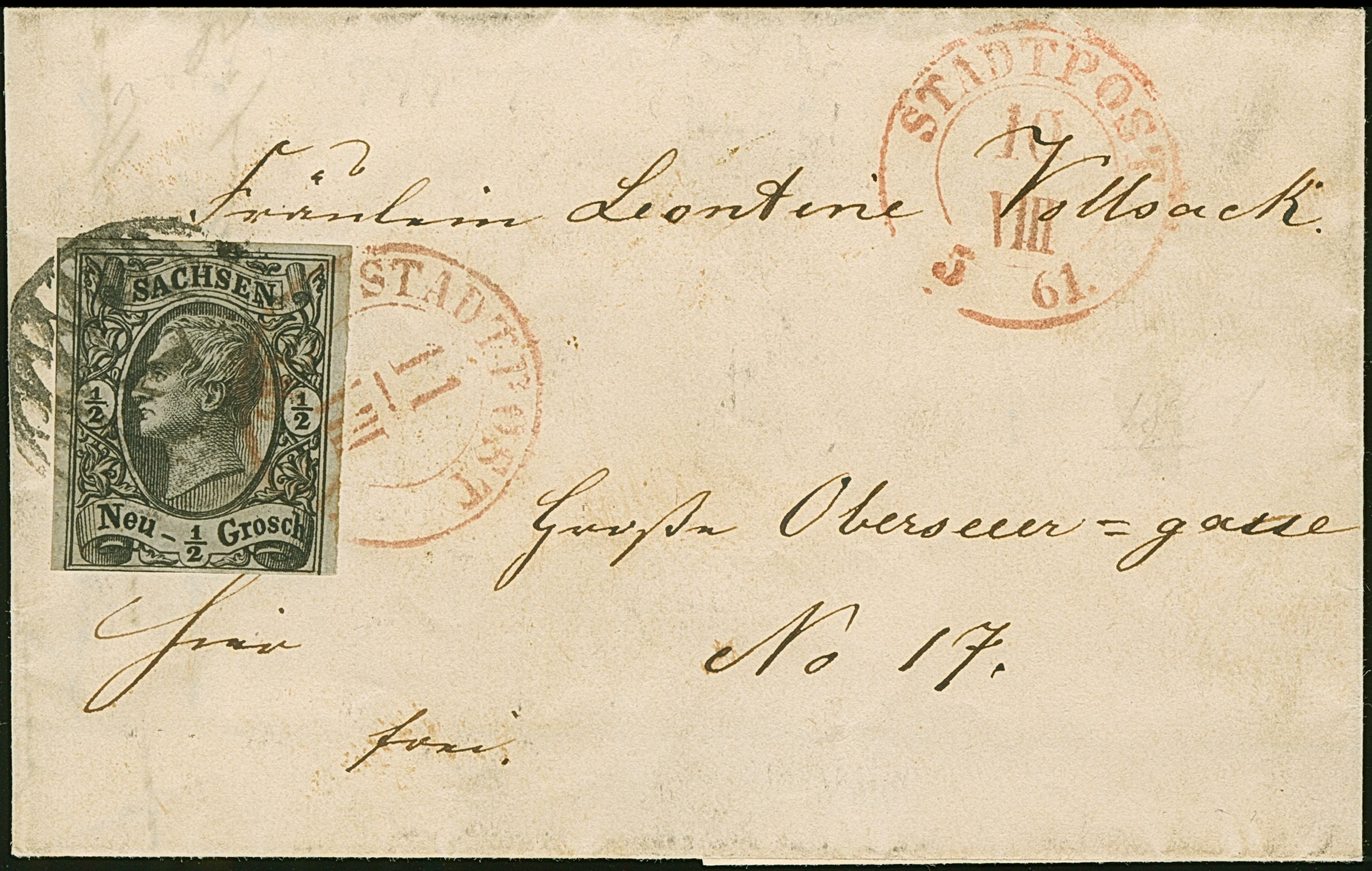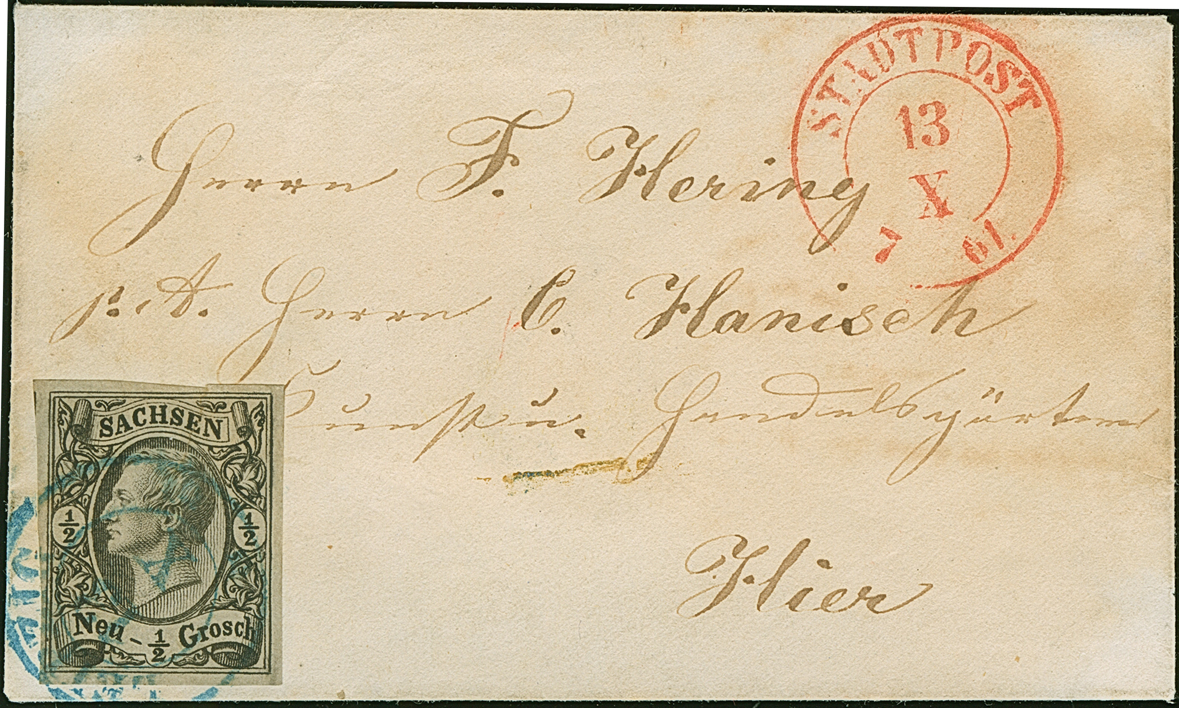 ½ Ngr. auf grau, voll- bis breitrandig, mit blauen Doppelkreisstempel "LEIPZIG 13/X." auf kleinem Orts-Briefkuvert mit nebengesetztem roten "Stadtpost 13 X 61". Marke oben unauffälliger geschlossener Einriss. Eine sehr seltene farbige Stempelkombination.